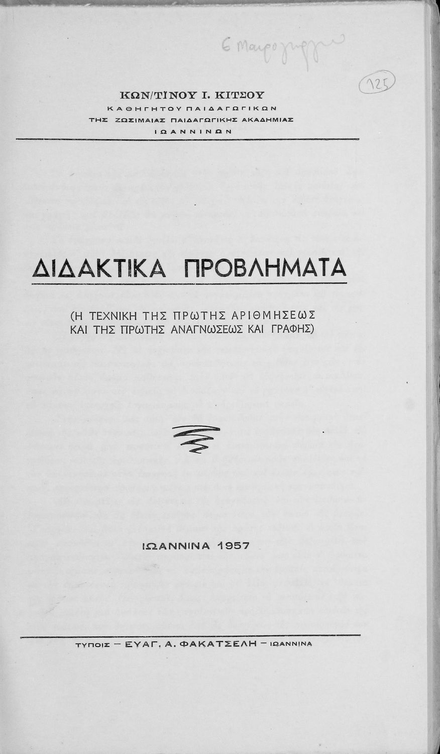Εκδότης: Ευαγγ. Α. Φακατσέλης Έτος έκδοσης: 1957 Τόπος έκδοσης: Ιωάννινα |