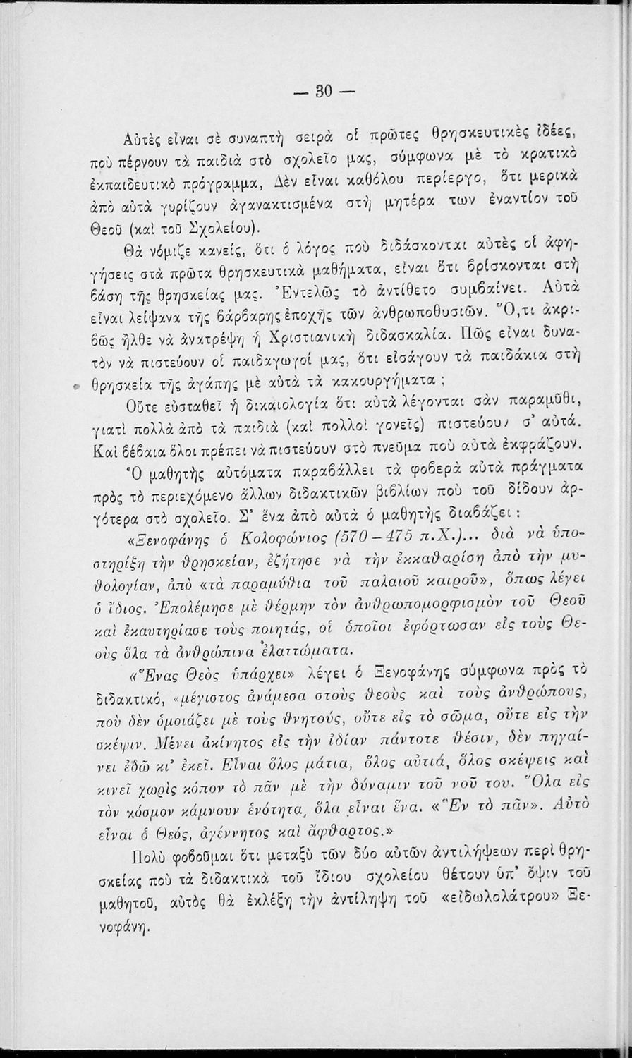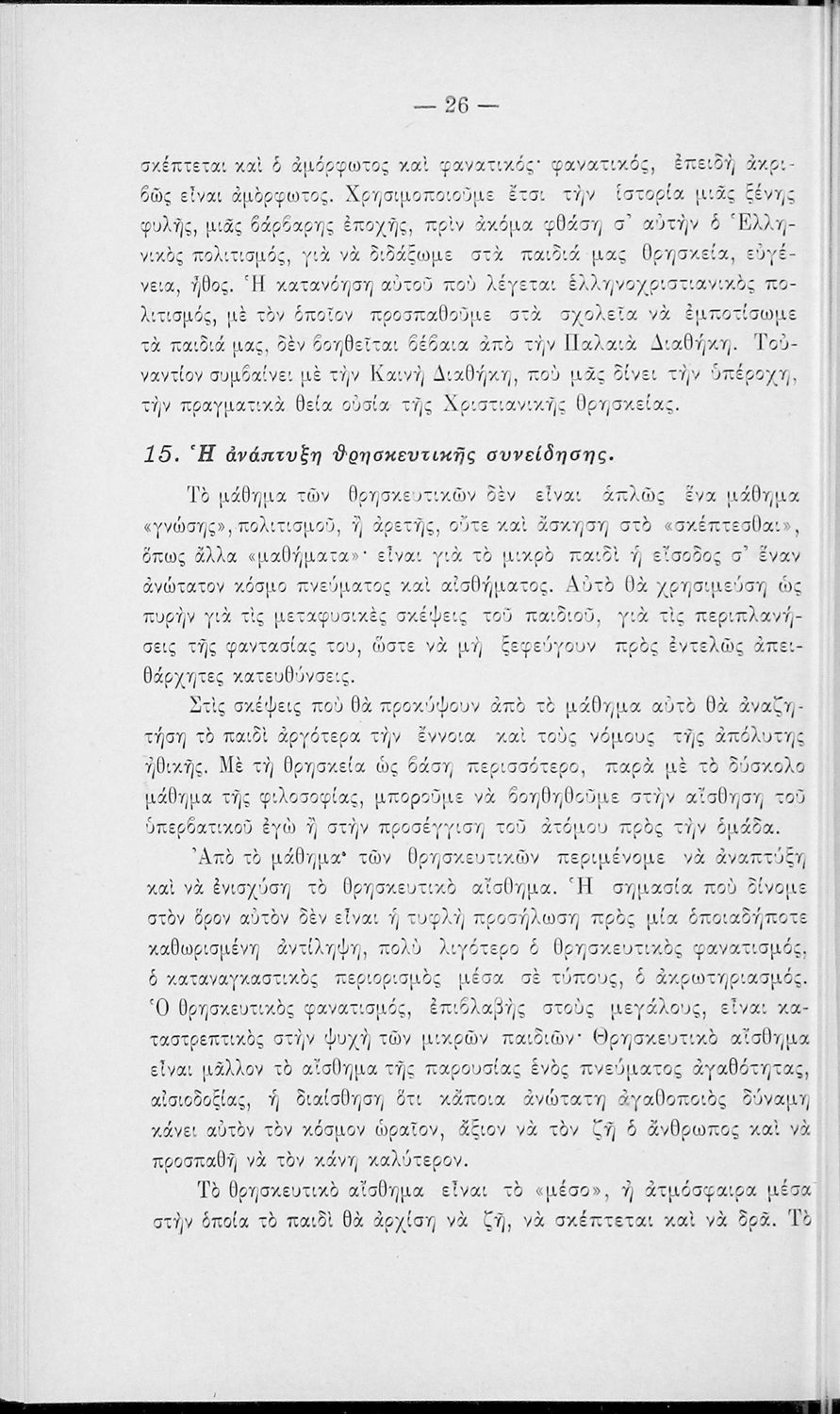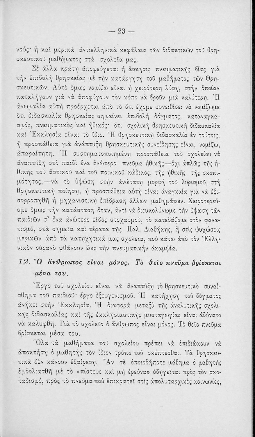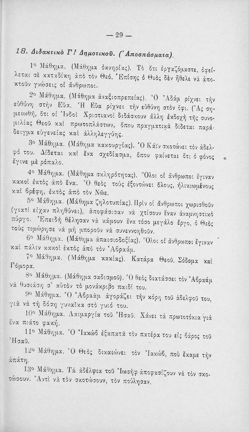 Μάθημα: Θρησκευτικά Γλώσσα: Δημοτική με στοιχεία καθαρεύουσας Παρουσίαση περιεχομένου: Παιδαγωγικό βοήθημα που εστιάζει στο μάθημα των Θρησκευτικών και αποσκοπούσε να ενημερώσει τους εκπαιδευτικούς της Πρωτοβάθμιας και Δευτεροβάθμιας Εκπαίδευσης σχετικά με το διαφορισμό την Παιδεία. |
