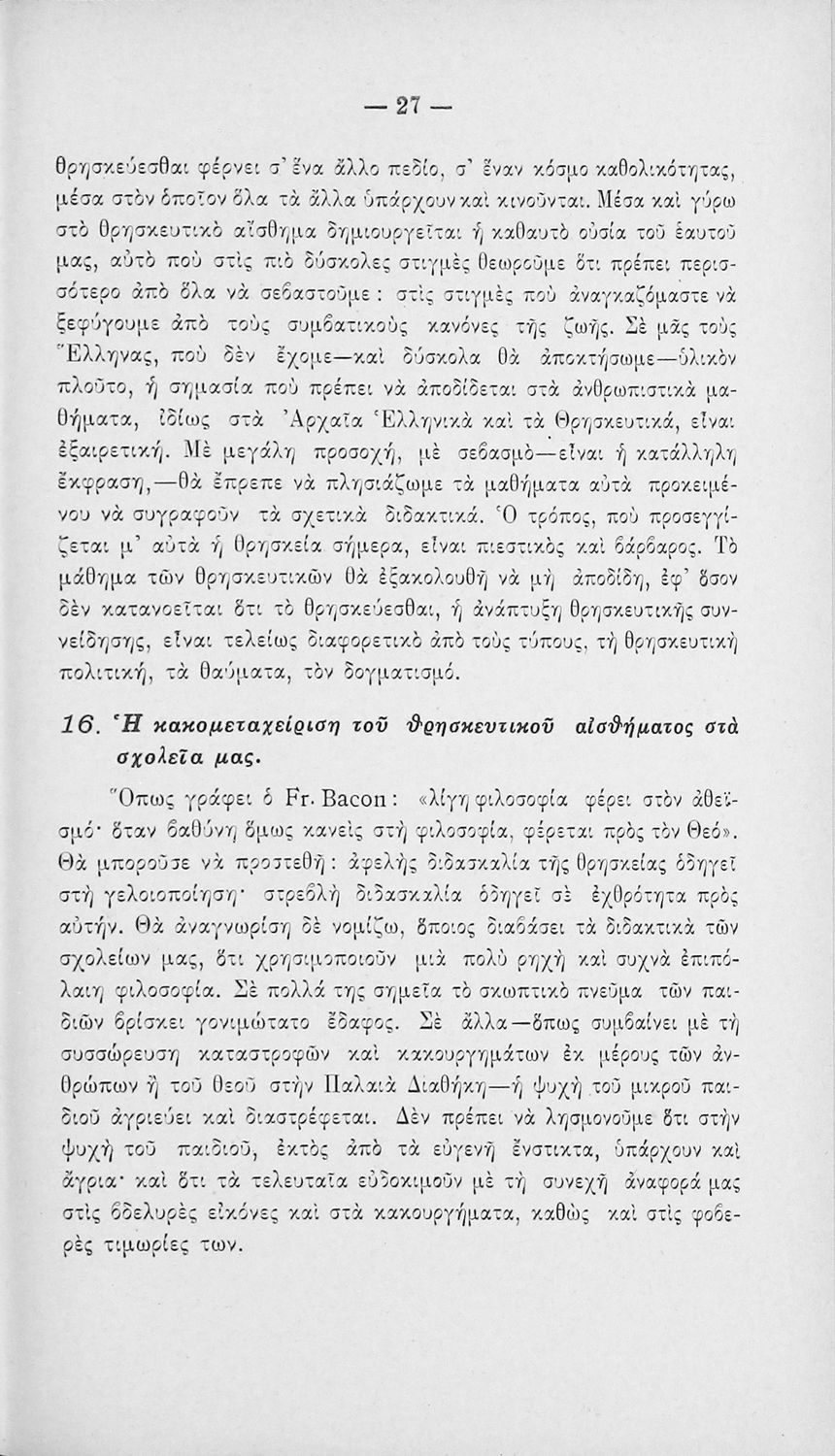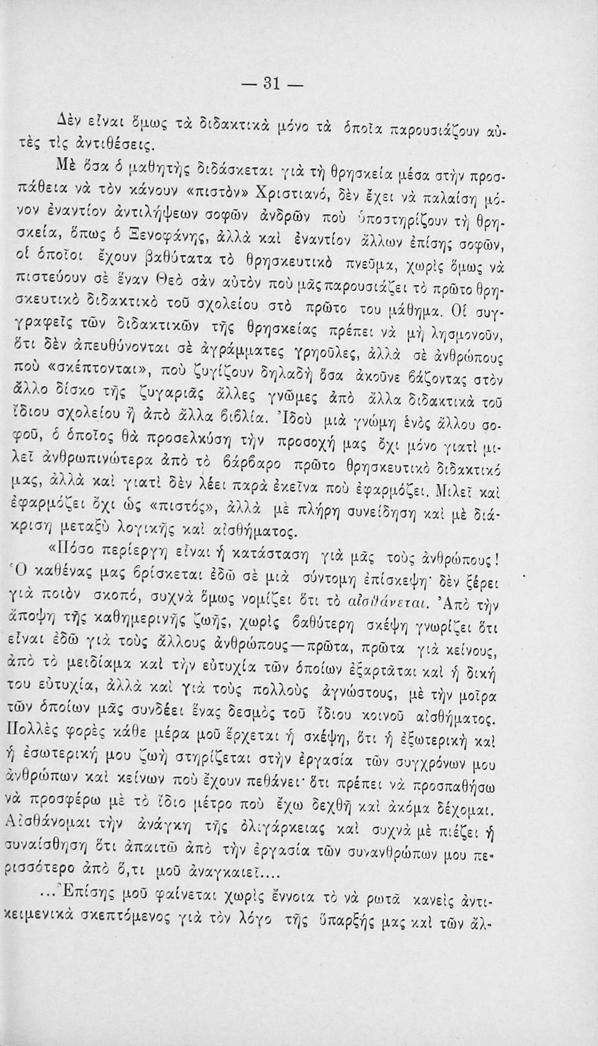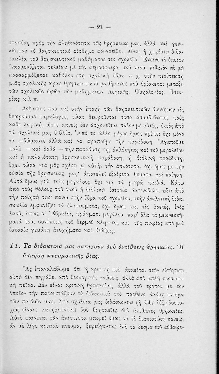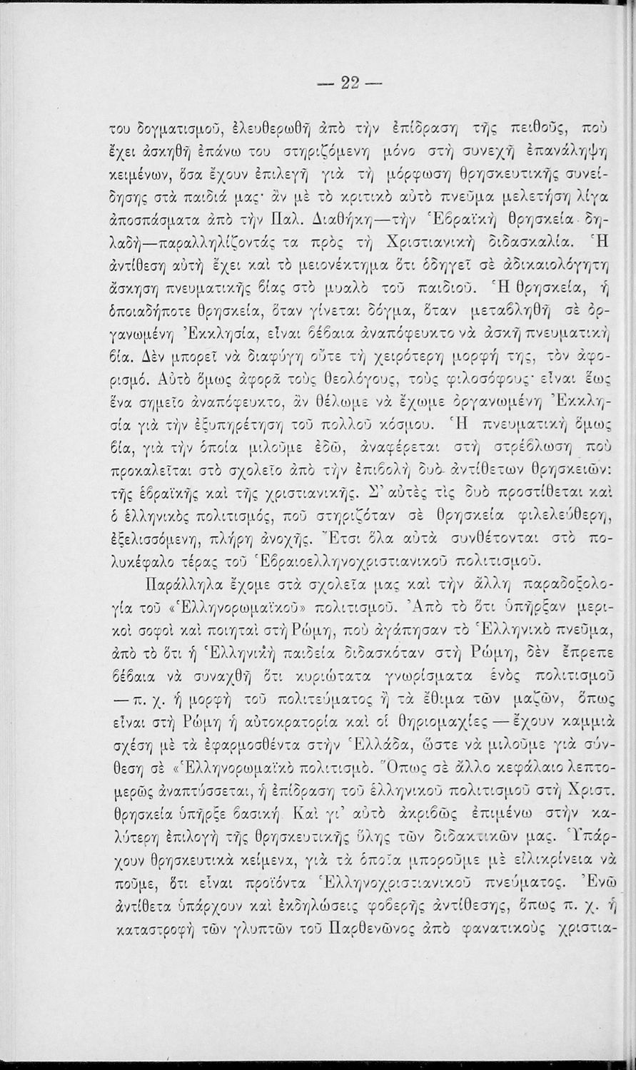 Μάθημα: Θρησκευτικά Γλώσσα: Δημοτική με στοιχεία καθαρεύουσας Παρουσίαση περιεχομένου: Παιδαγωγικό βοήθημα που εστιάζει στο μάθημα των Θρησκευτικών και αποσκοπούσε να ενημερώσει τους εκπαιδευτικούς της Πρωτοβάθμιας και Δευτεροβάθμιας Εκπαίδευσης σχετικά με το διαφορισμό την Παιδεία. |