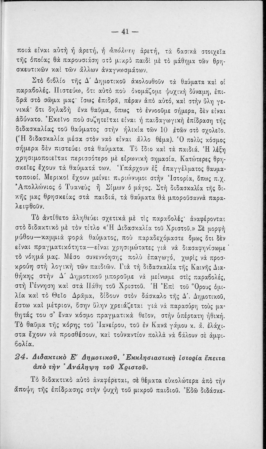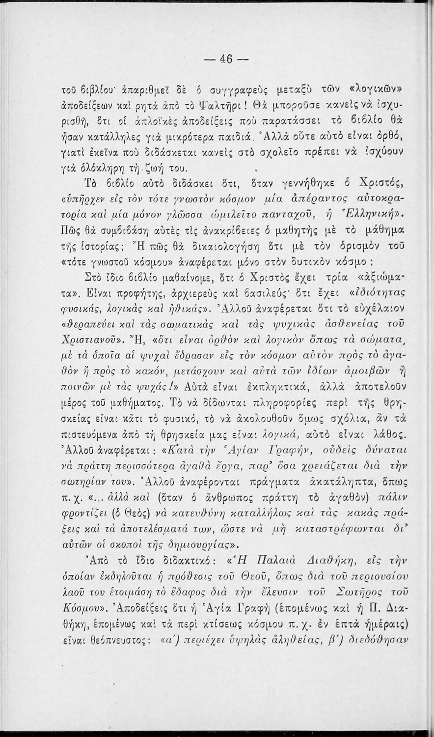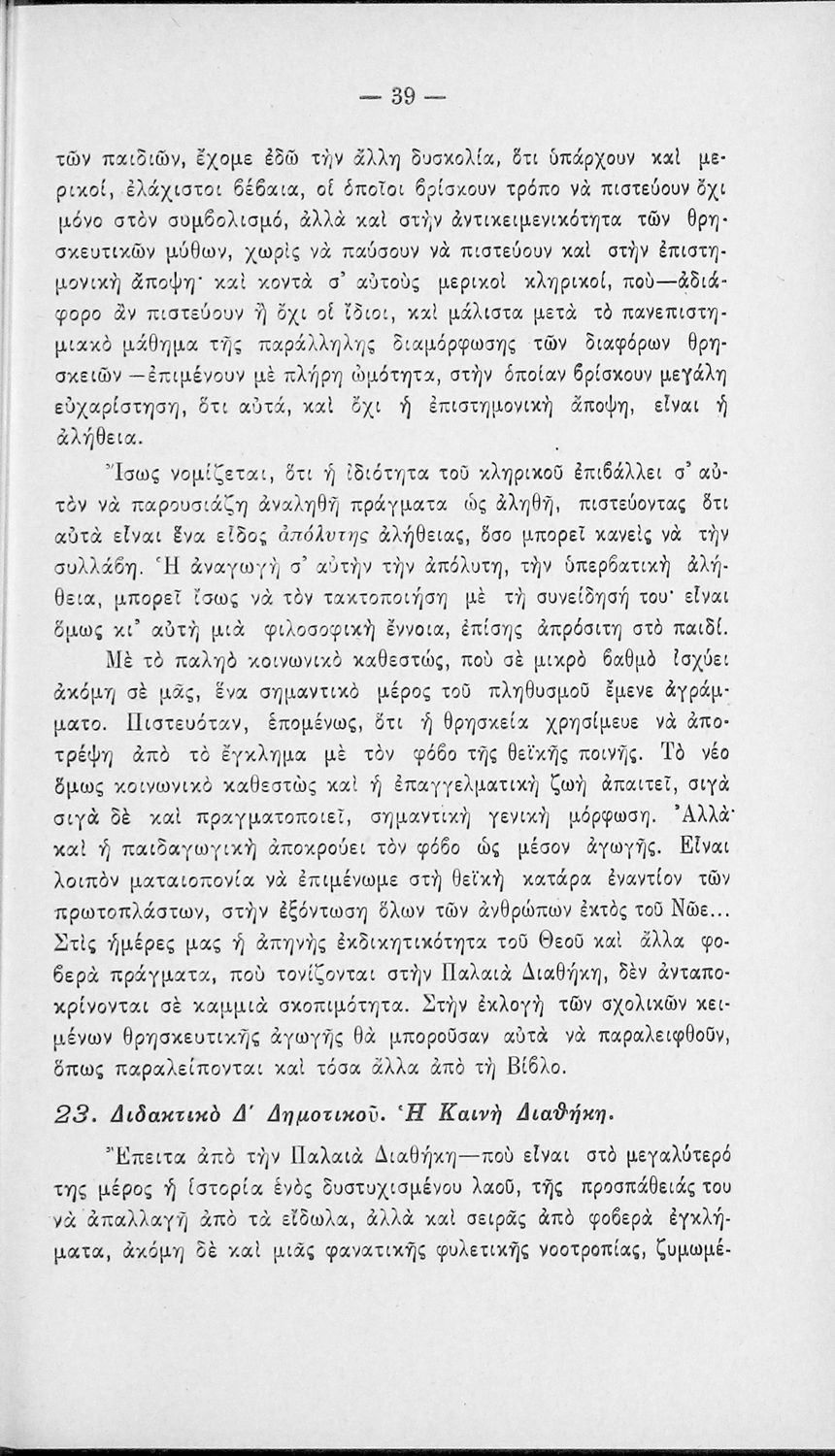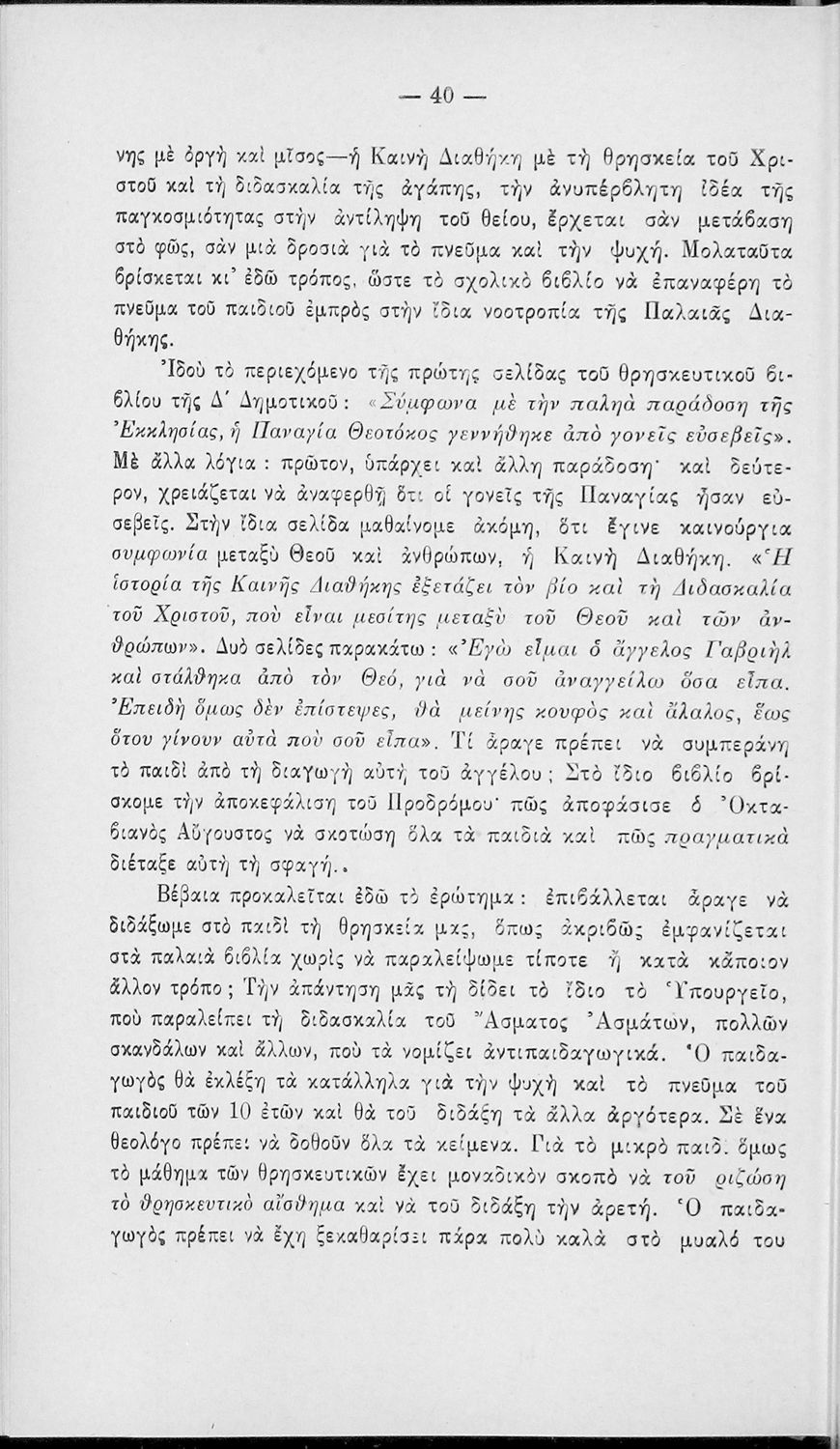 Μάθημα: Θρησκευτικά Γλώσσα: Δημοτική με στοιχεία καθαρεύουσας Παρουσίαση περιεχομένου: Παιδαγωγικό βοήθημα που εστιάζει στο μάθημα των Θρησκευτικών και αποσκοπούσε να ενημερώσει τους εκπαιδευτικούς της Πρωτοβάθμιας και Δευτεροβάθμιας Εκπαίδευσης σχετικά με το διαφορισμό την Παιδεία. |