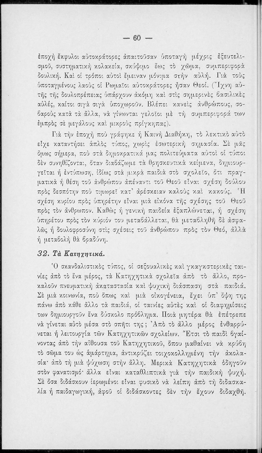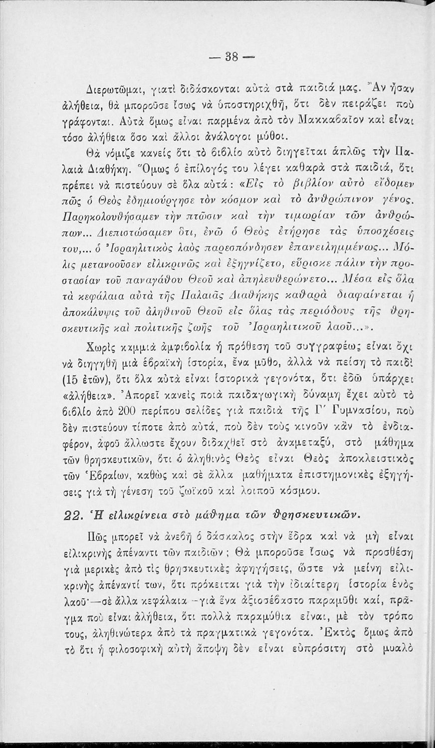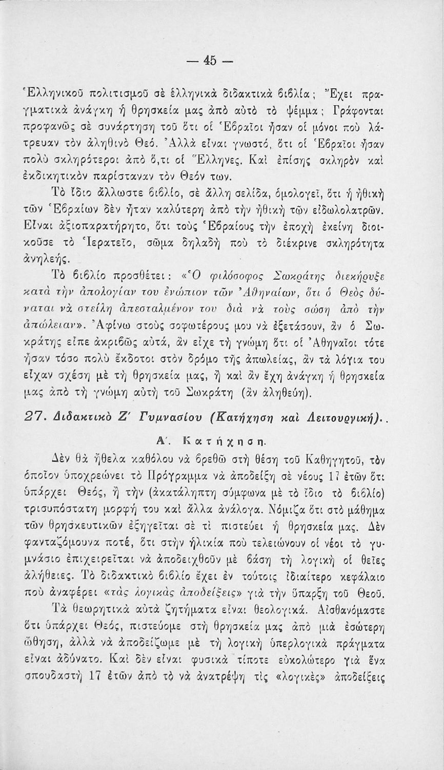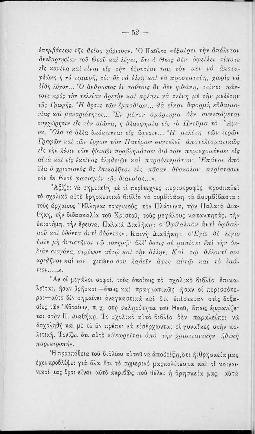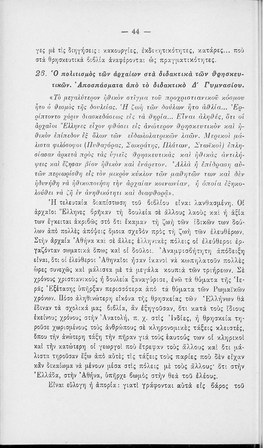 Μάθημα: Θρησκευτικά Γλώσσα: Δημοτική με στοιχεία καθαρεύουσας Παρουσίαση περιεχομένου: Παιδαγωγικό βοήθημα που εστιάζει στο μάθημα των Θρησκευτικών και αποσκοπούσε να ενημερώσει τους εκπαιδευτικούς της Πρωτοβάθμιας και Δευτεροβάθμιας Εκπαίδευσης σχετικά με το διαφορισμό την Παιδεία. |