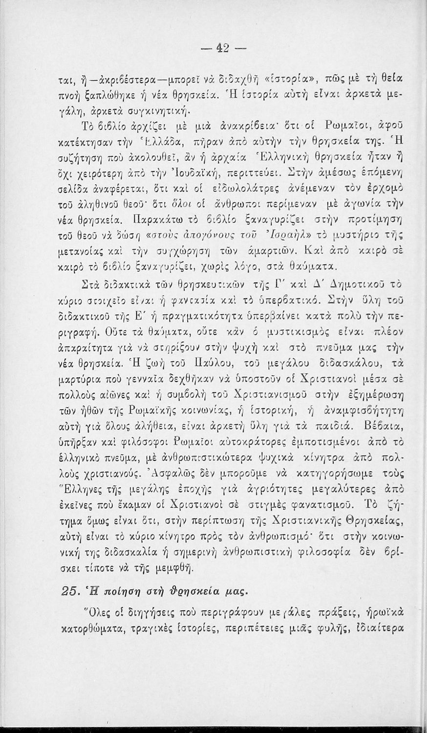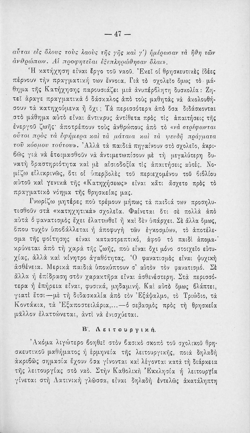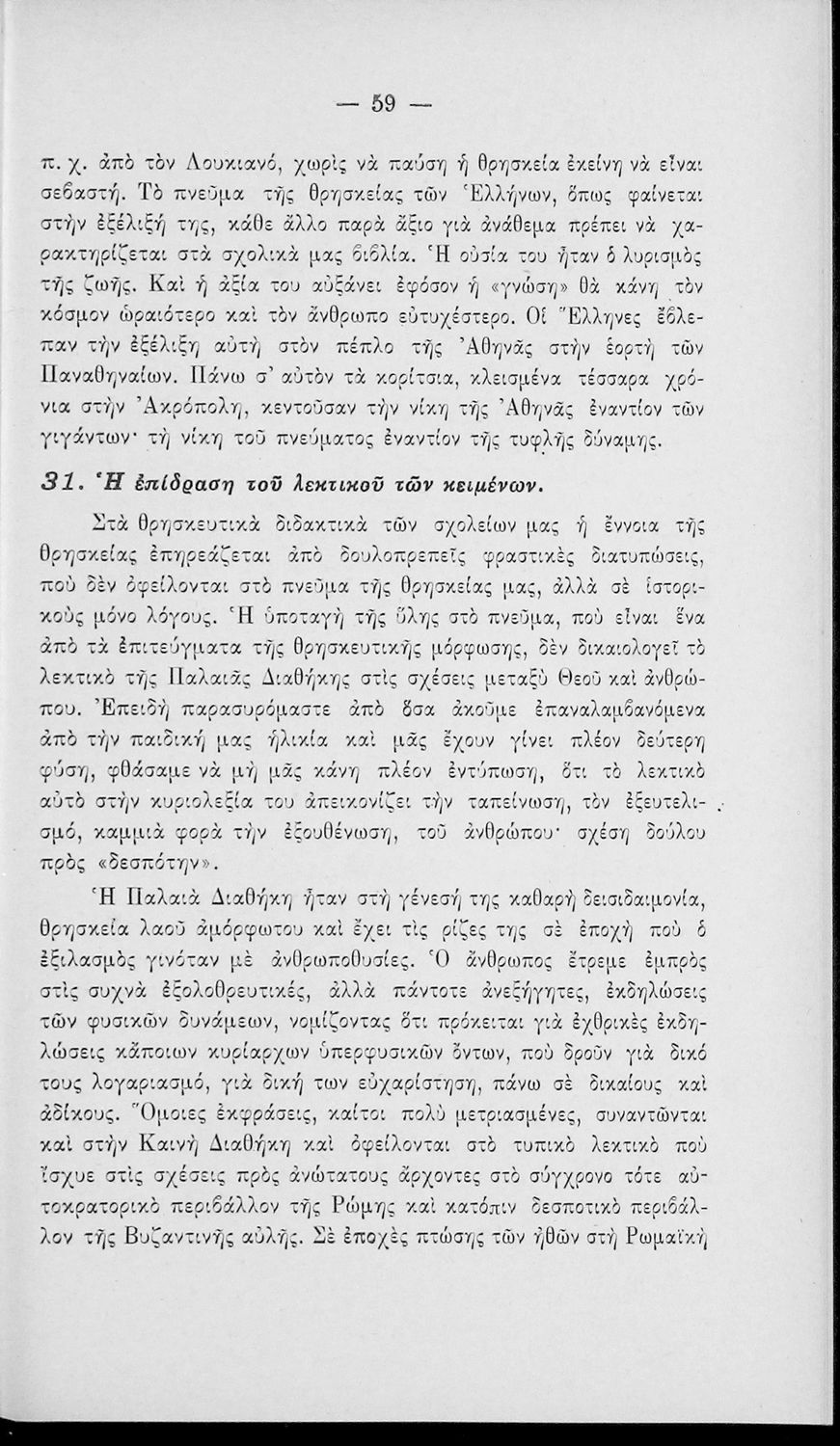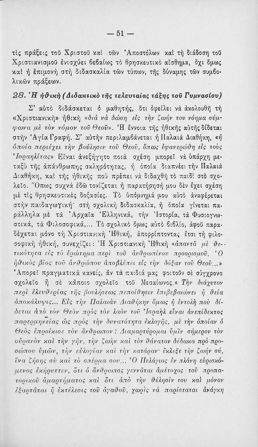 Μάθημα: Θρησκευτικά Γλώσσα: Δημοτική με στοιχεία καθαρεύουσας Παρουσίαση περιεχομένου: Παιδαγωγικό βοήθημα που εστιάζει στο μάθημα των Θρησκευτικών και αποσκοπούσε να ενημερώσει τους εκπαιδευτικούς της Πρωτοβάθμιας και Δευτεροβάθμιας Εκπαίδευσης σχετικά με το διαφορισμό την Παιδεία. |
