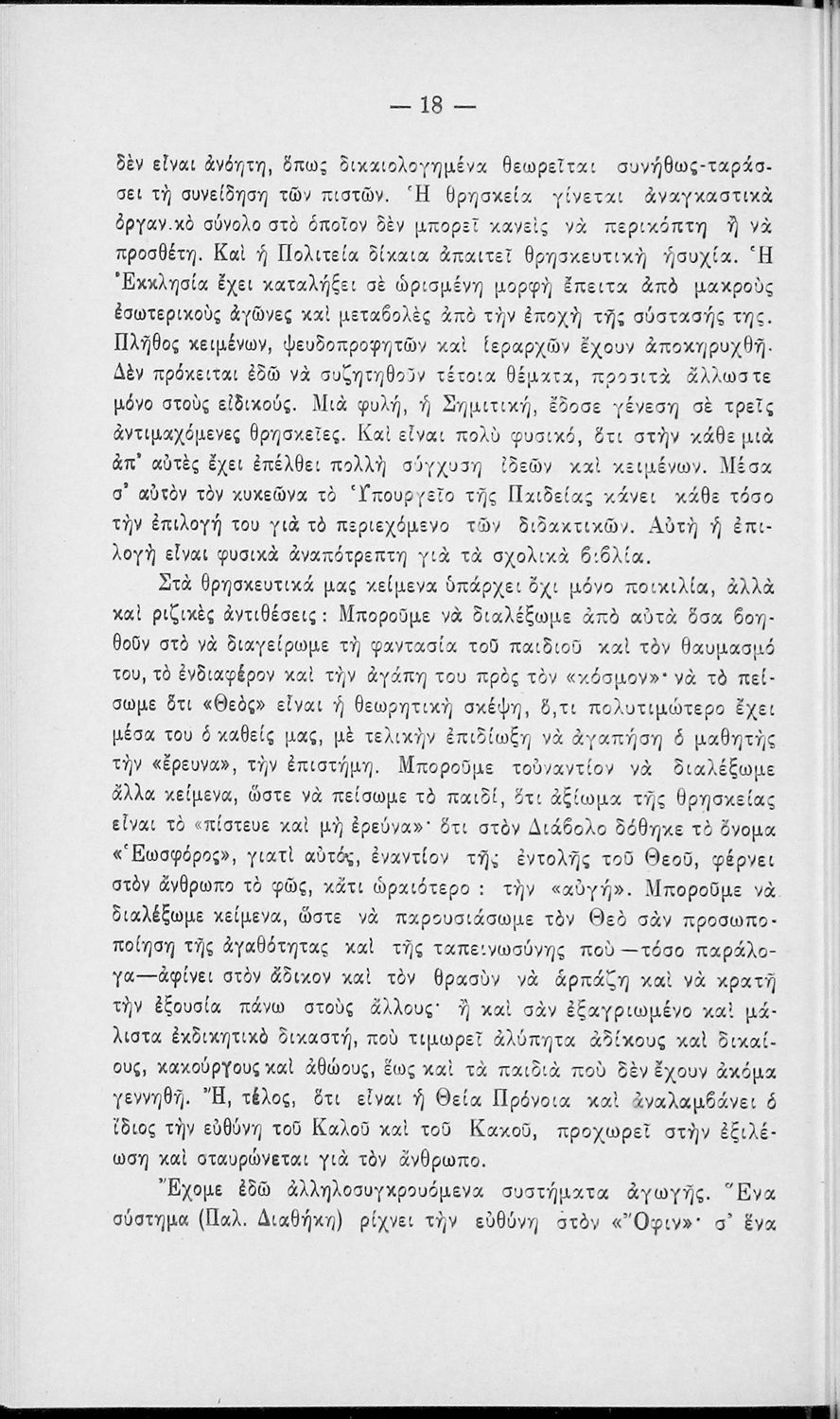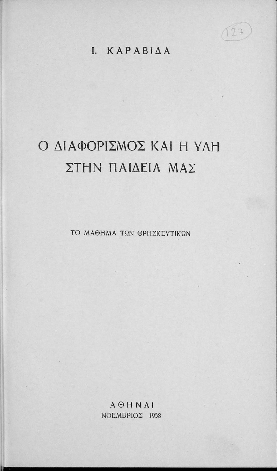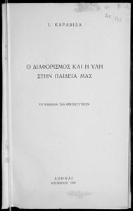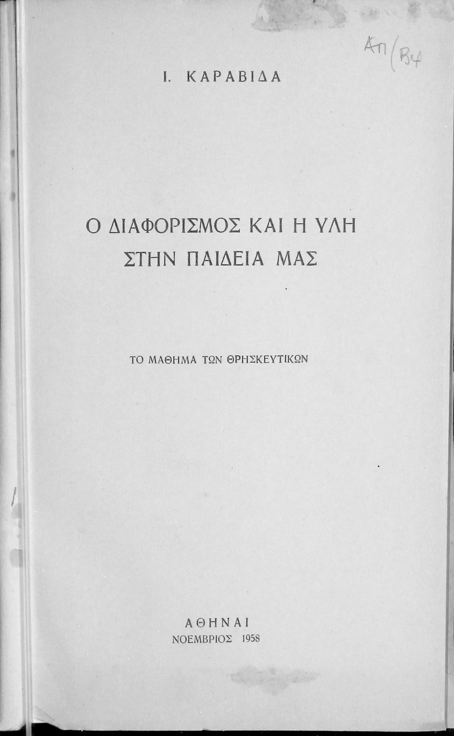 Μάθημα: Θρησκευτικά Γλώσσα: Δημοτική με στοιχεία καθαρεύουσας Παρουσίαση περιεχομένου: Παιδαγωγικό βοήθημα που εστιάζει στο μάθημα των Θρησκευτικών και αποσκοπούσε να ενημερώσει τους εκπαιδευτικούς της Πρωτοβάθμιας και Δευτεροβάθμιας Εκπαίδευσης σχετικά με το διαφορισμό την Παιδεία. |
