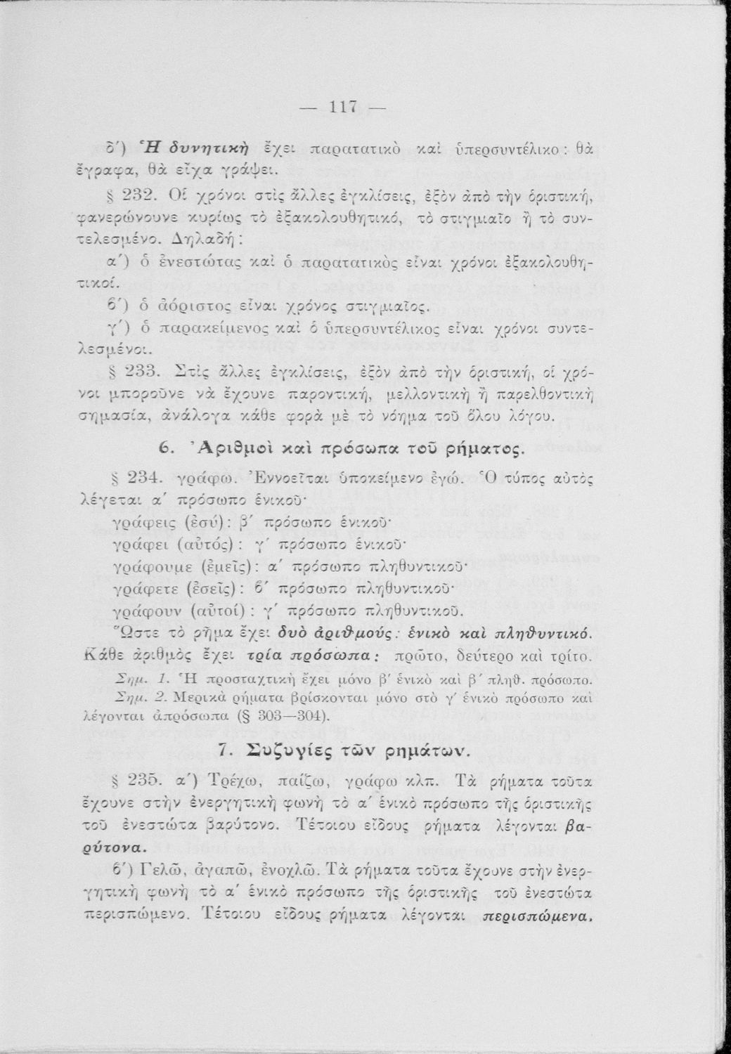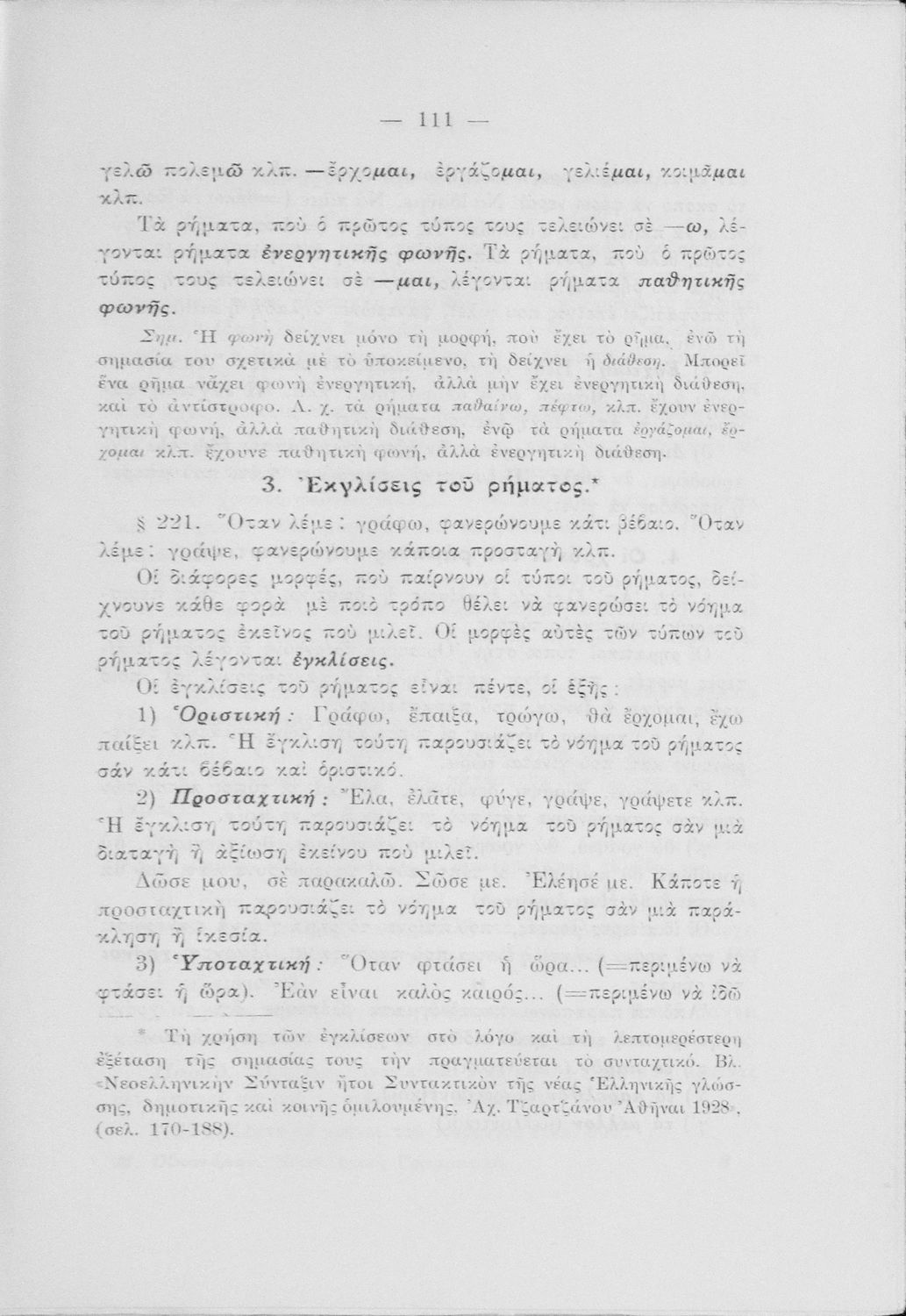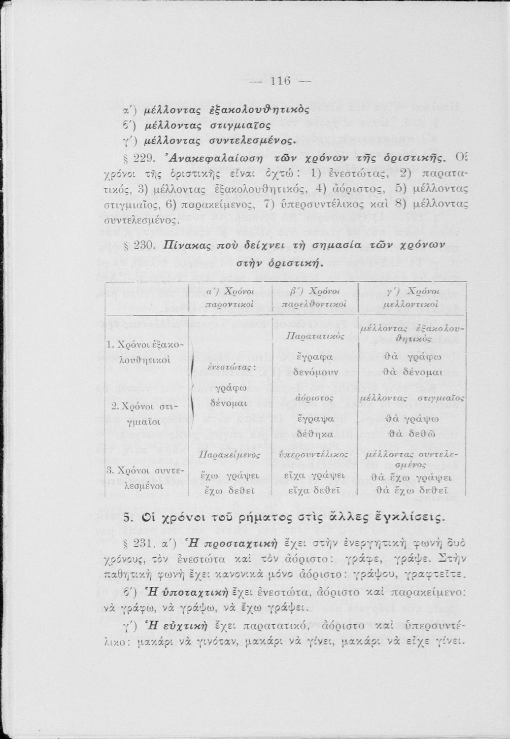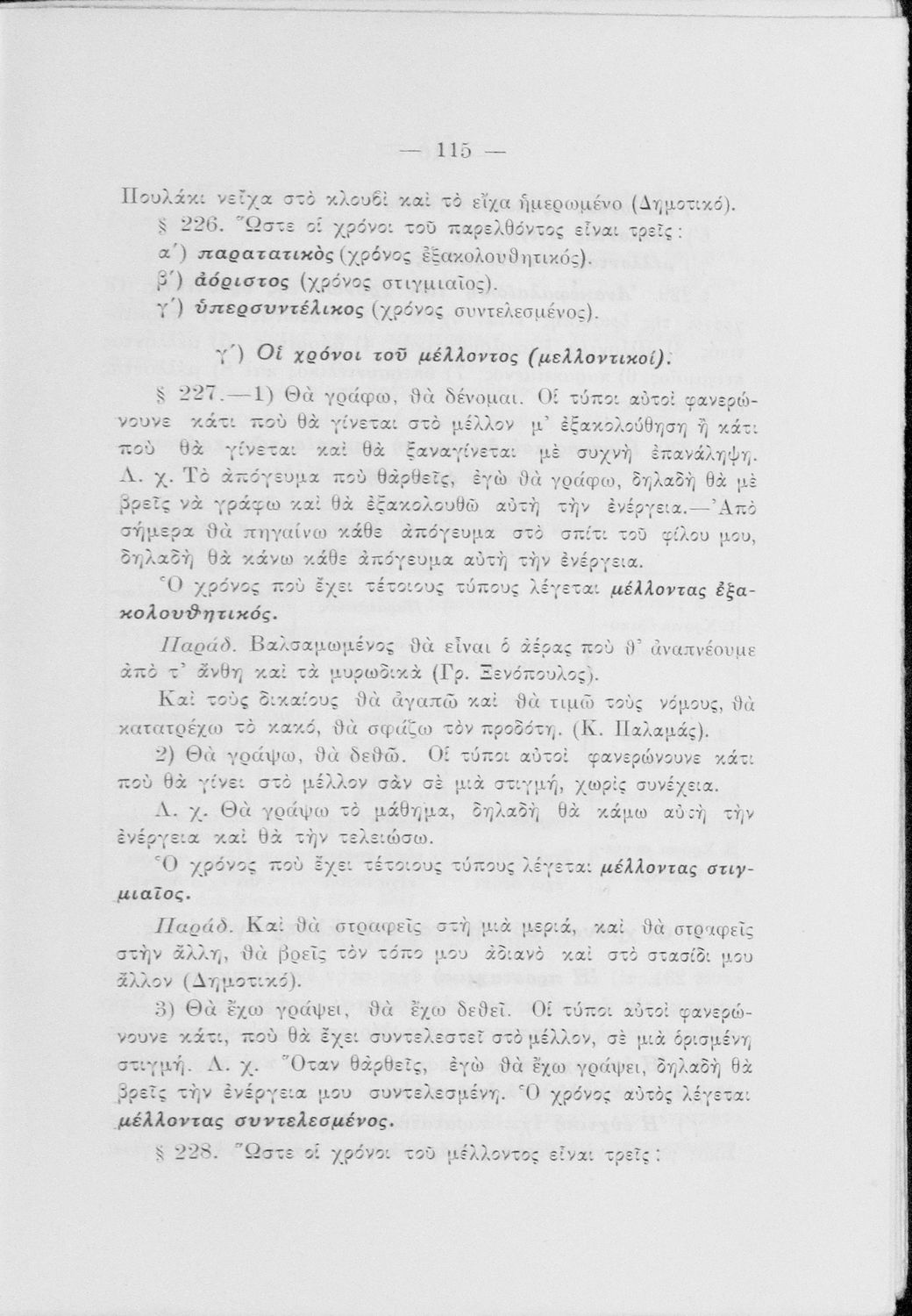 Σχολικό εγχειρίδιο Συντακτικού που γράφηκε από επιτροπή Καθηγητών που ορίστηκε από το Υπουργείο των Θρησκευμάτων και της Εθνικής Παιδείας. Περιλαμβάνει κανόνες και παραδείγματα του συντακτικού της Δημοτικής.