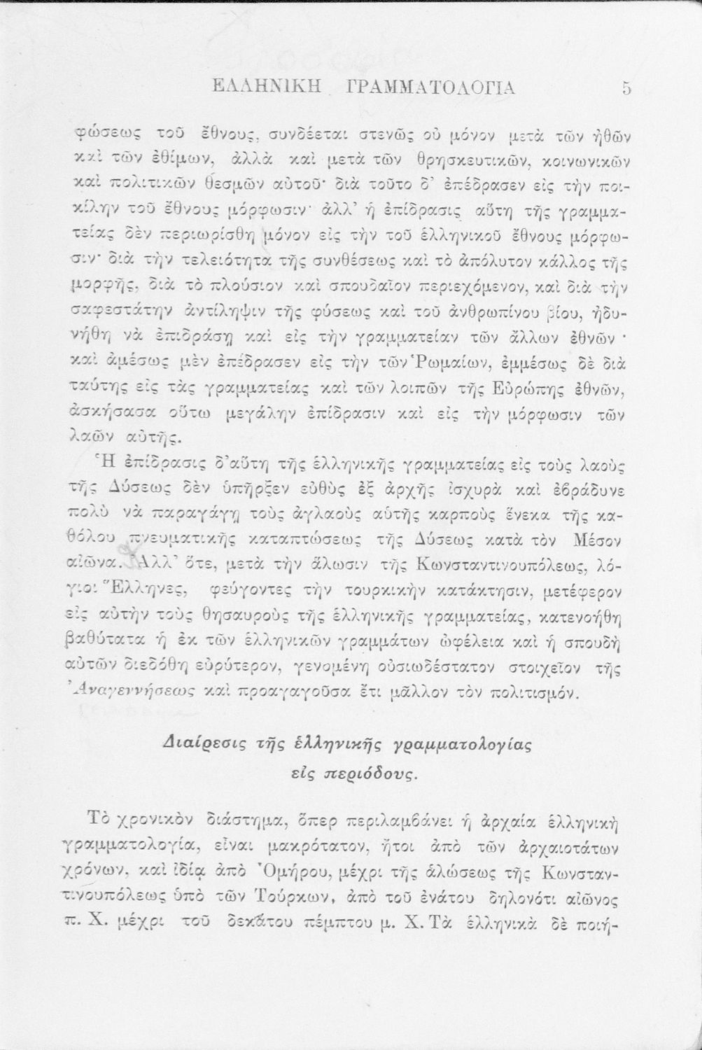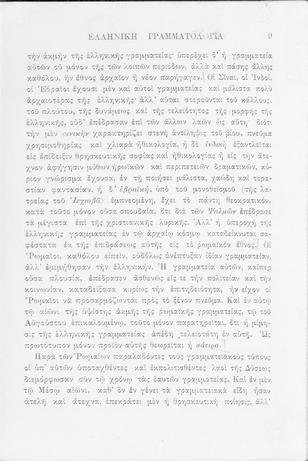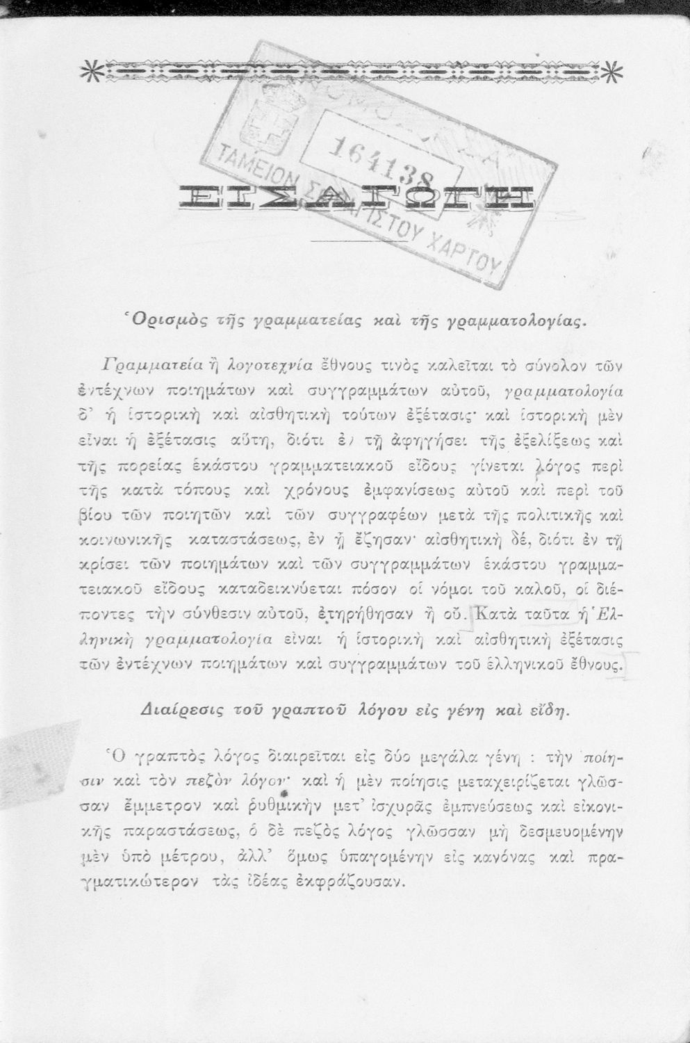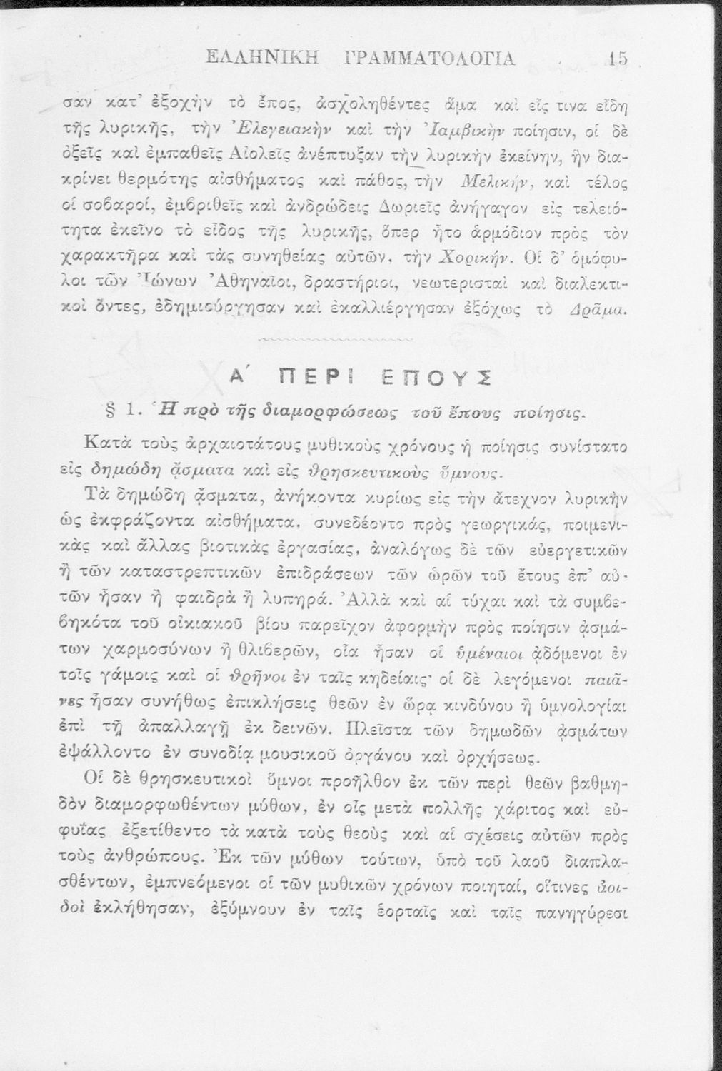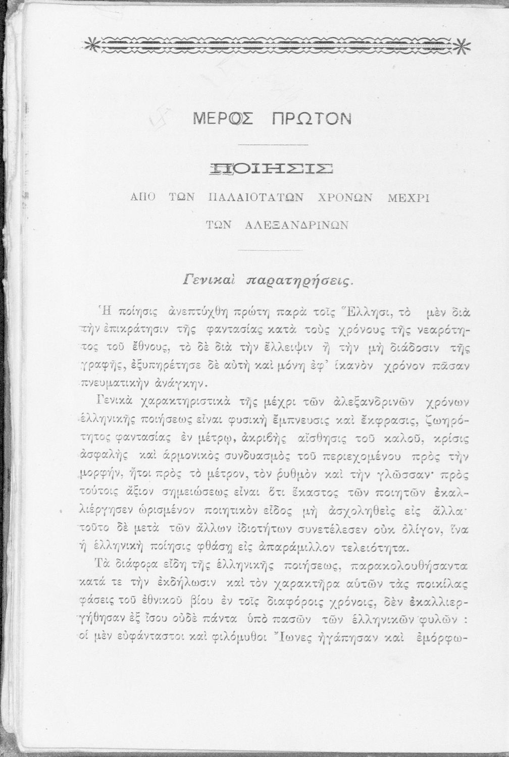 Βαθμίδα εκπαίδευσης: Δευτεροβάθμια Τάξη: Γυμνάσιο Μάθημα: Νέα Ελληνικά Γλώσσα: Καθαρεύουσα Παρουσίαση περιεχομένου: Σχολικό εγχειρίδιο Αρχαίων και Νέων Ελληνικών για το Γυμνάσιο που εξετάζει την εξέλιξη της ποίησης και του πεζού λόγου κατά την Αρχαϊκή, Κλασσική, Αλεξανδρινή και Ρωμαϊκή και Βυζαντινή περίοδο. |