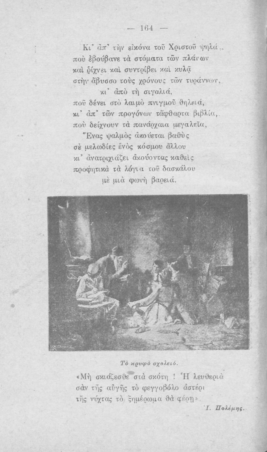 Σχολικό εγχειρίδιο Νέων Ελληνικών Β΄ Τετραταξίου Γυμνασίου και Γ΄ Αστικού Σχολείου Θηλέων που περιλαμβάνει ποιήματα και πεζά Ελλήνων συγγραφέων εμπνευσμένα από την σύγχρονη ελληνική ιστορία. Περιέχει και παράρτημα με βιογραφίες των συγγραφέων και λεξιλόγιο.