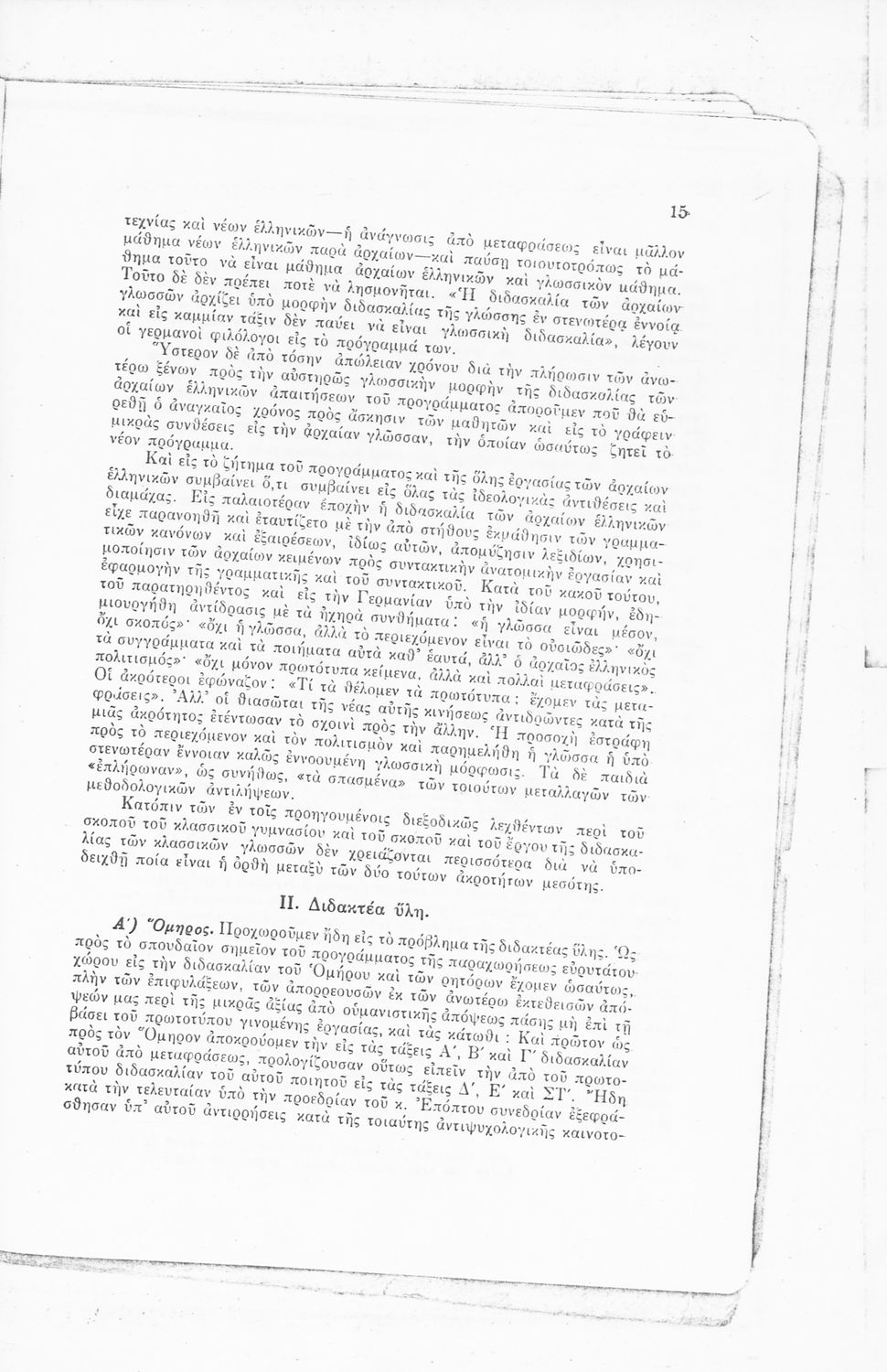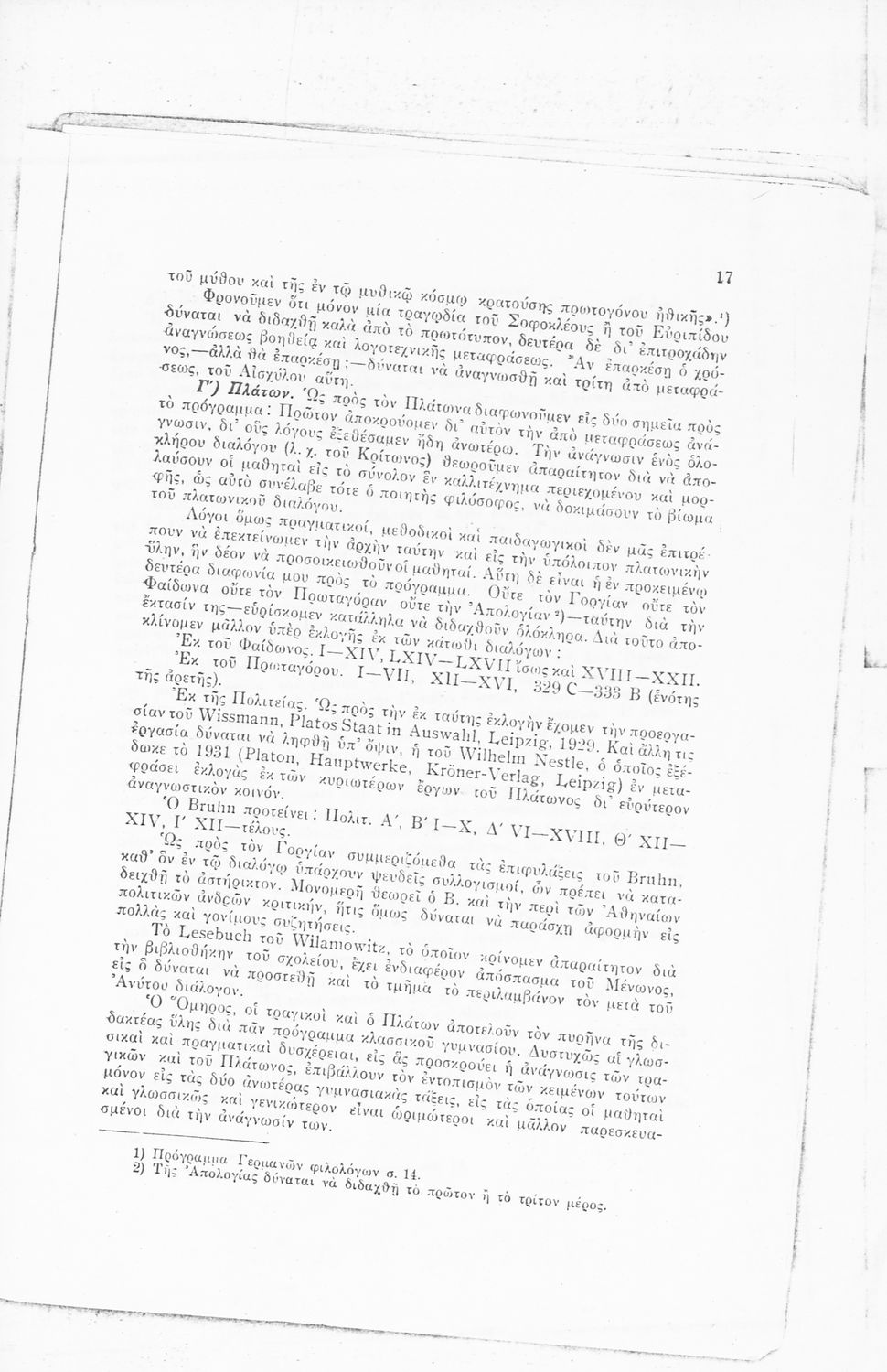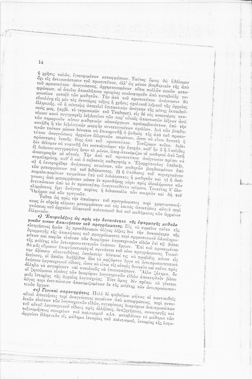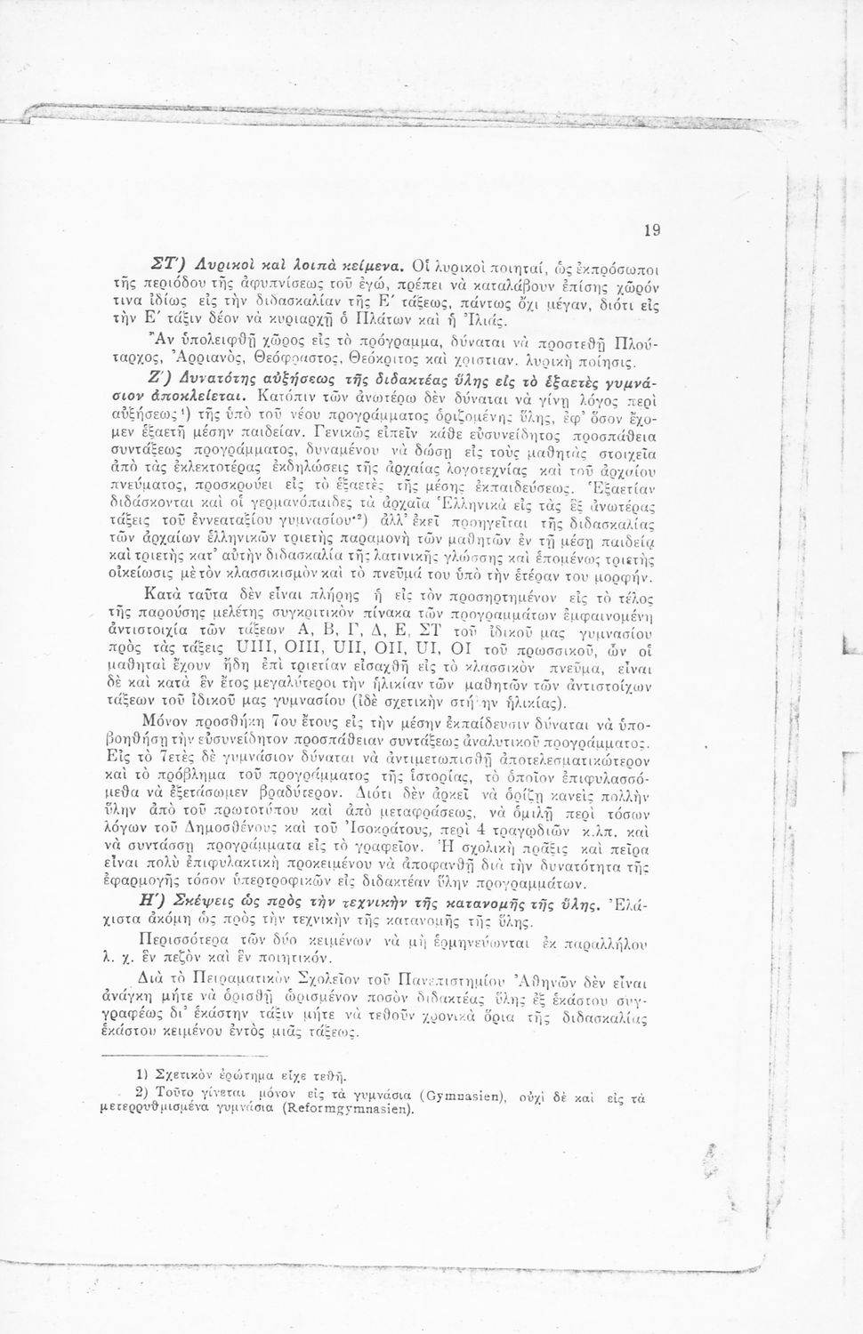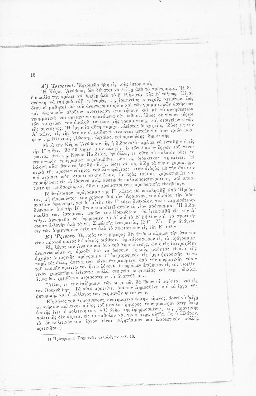Ανατύπωση άρθρου που πρωτοδημοσιεύτηκε στο Δελτίον Ομοσπονδίας Λειτουργών Μέσης Εκπαιδεύσεως (Μάιος 1934, φ. 91) και αποτελεί μια κριτική αποτίμηση του αναλυτικού προγράμματος των Αρχαίων Ελληνικών για τα Γυμνάσια. Η μελέτη εκπονήθηκε κατόπιν παραγγελίας του Ν. Εξαρχόπουλου που ήταν επόπτης του Πειραματικού Σχολείου. Περιλαμβάνει πίνακα που συγκρίνει το αναλυτικό πρόγραμμα Αρχαίων Ελληνικών και Ιστορίας του ελληνικού και του πρωσσικού Γυμνασίου.