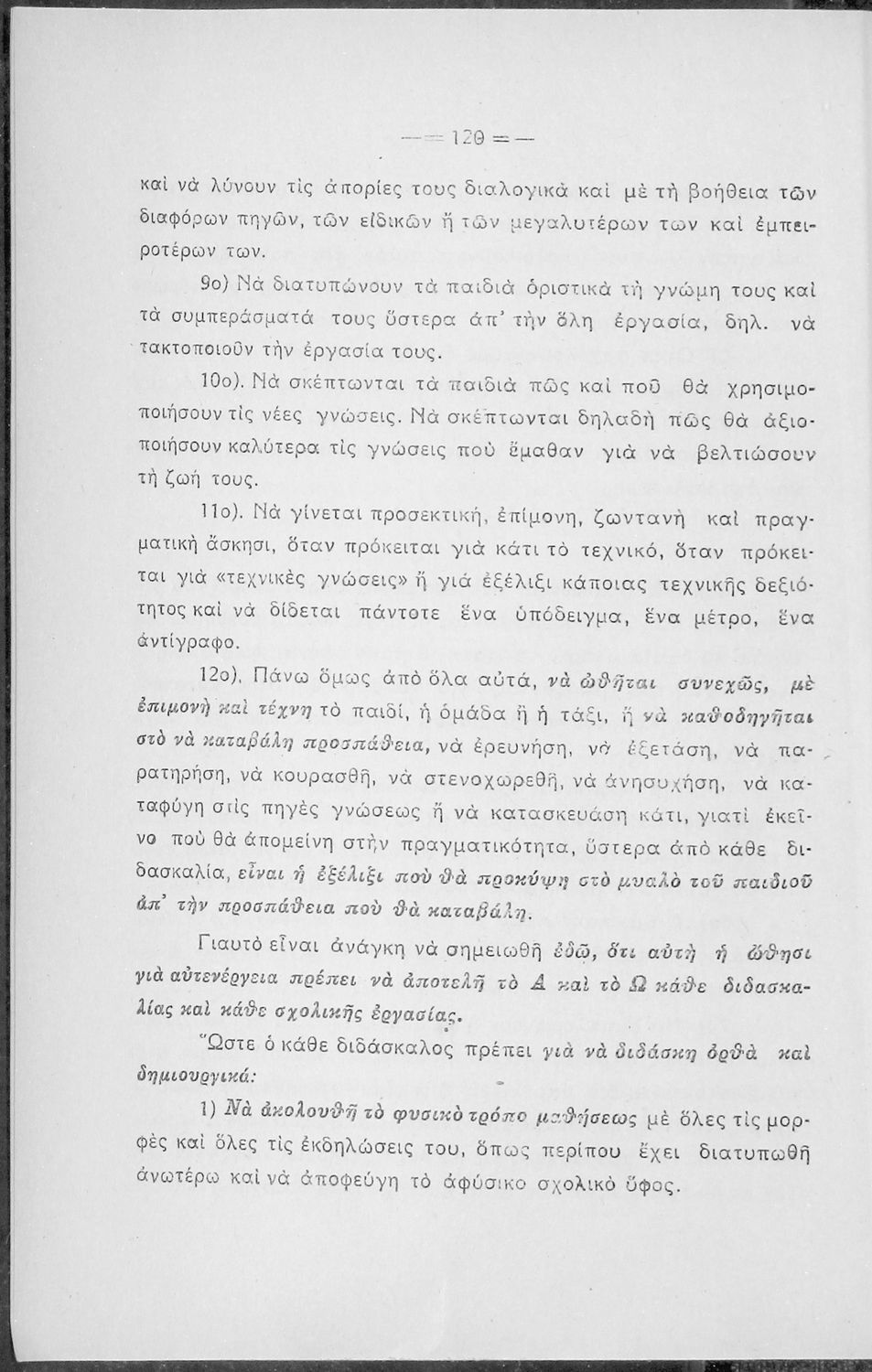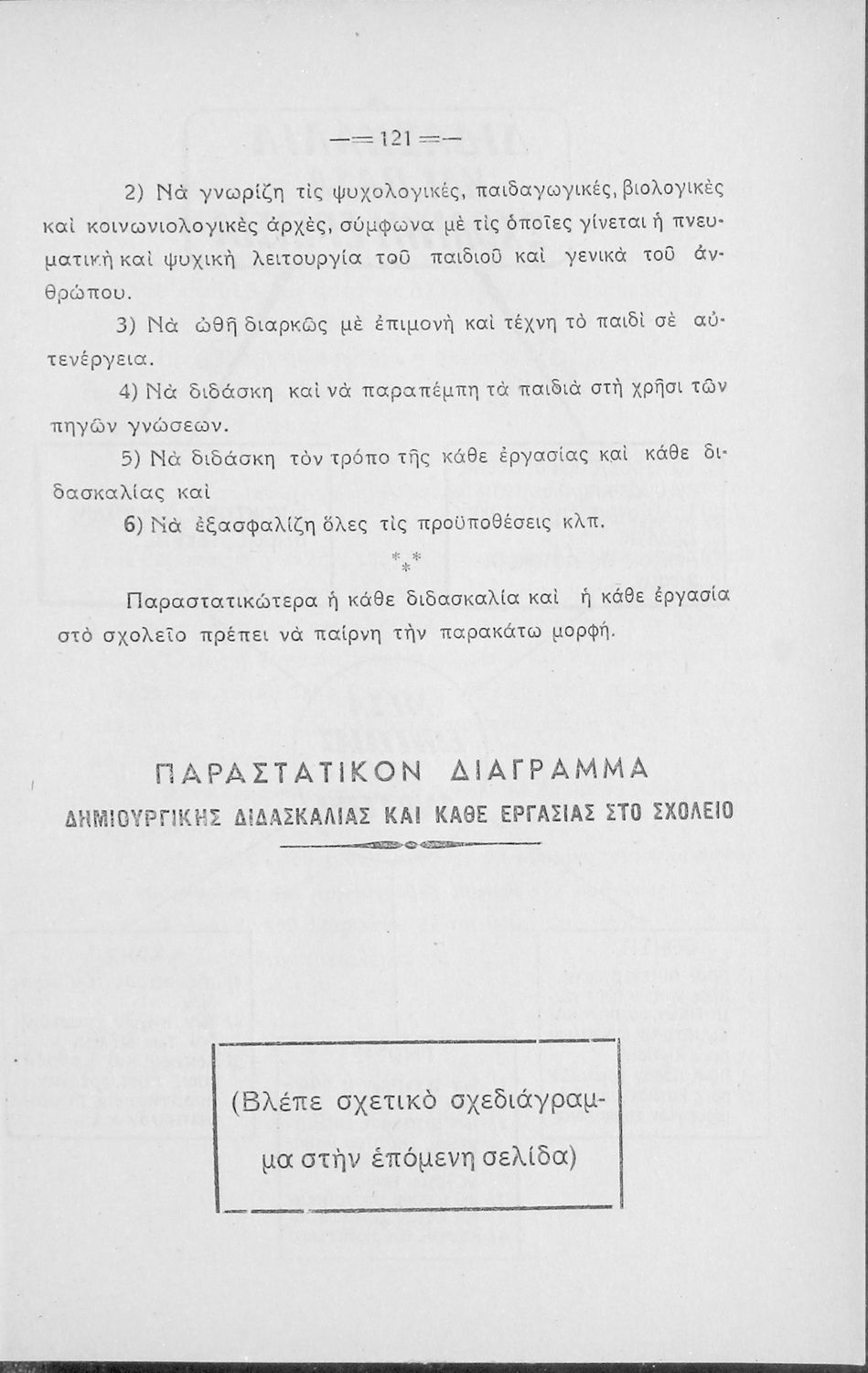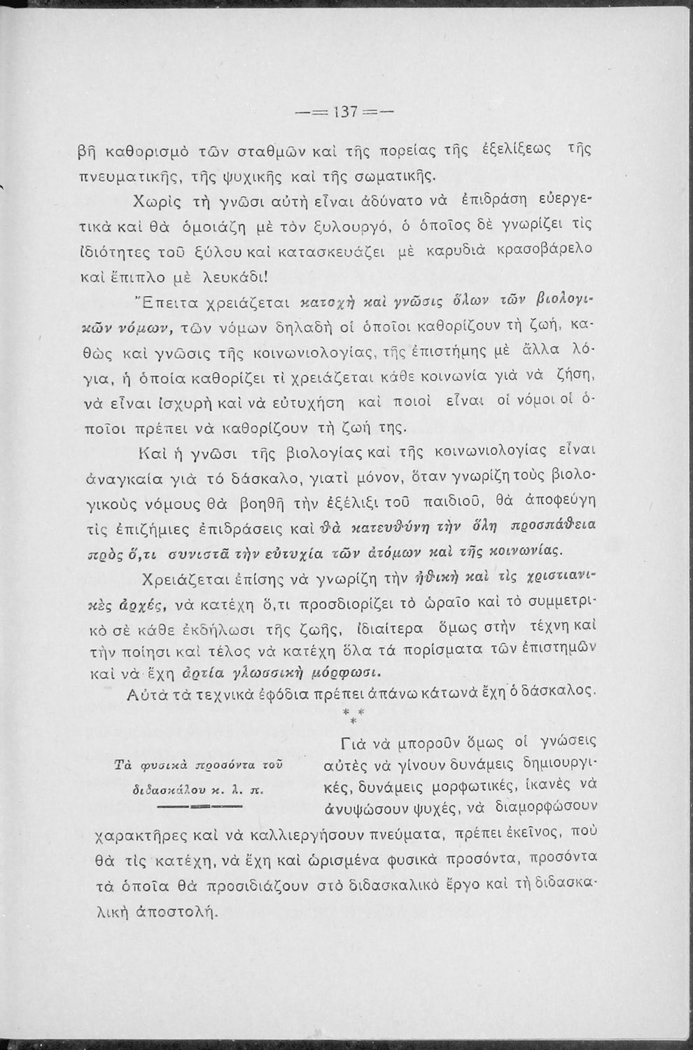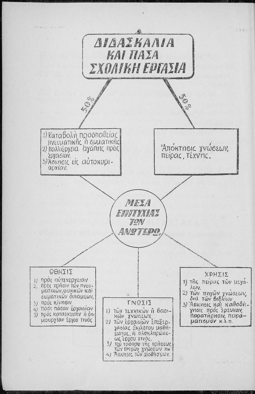 Παιδαγωγικό βοήθημα το οποίο, εκτός από το αναλυτικό πρόγραμμα του Δημοτικού, εξετάζει κάποια βασικά εκπαιδευτικά προβλήματα όπως ο σκοπός της αγωγής. Φέρει την υπογραφή του συγγραφέα, καθώς και ιδιόχειρη αφιέρωσή του.
