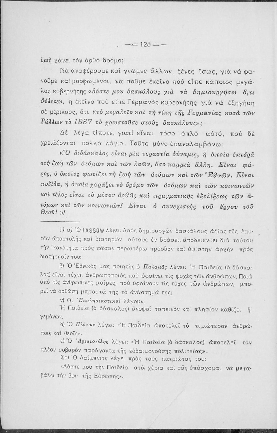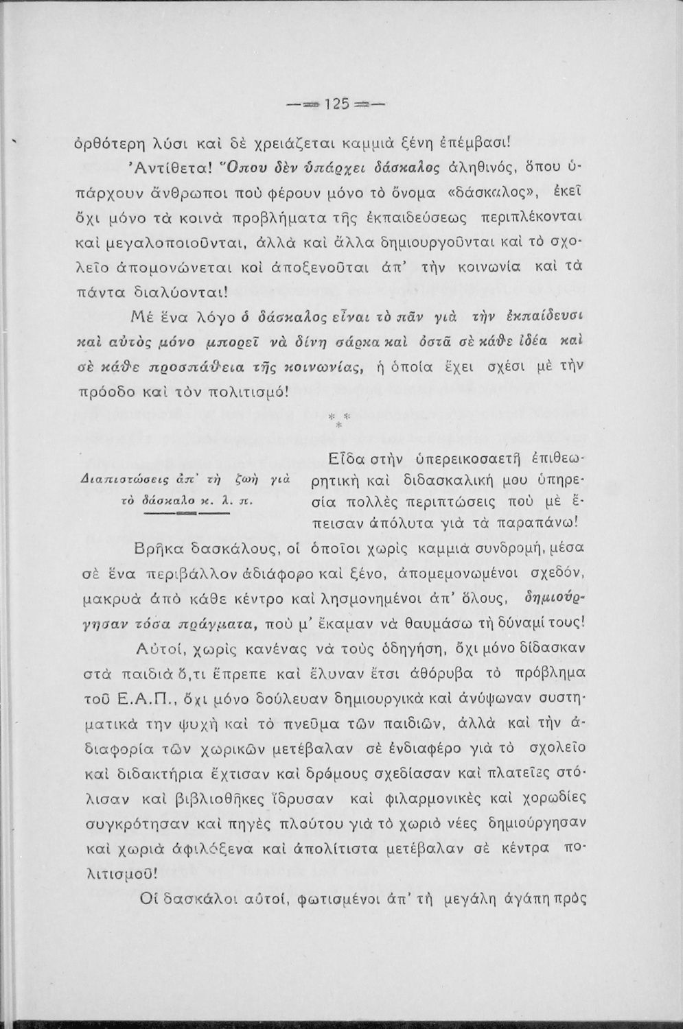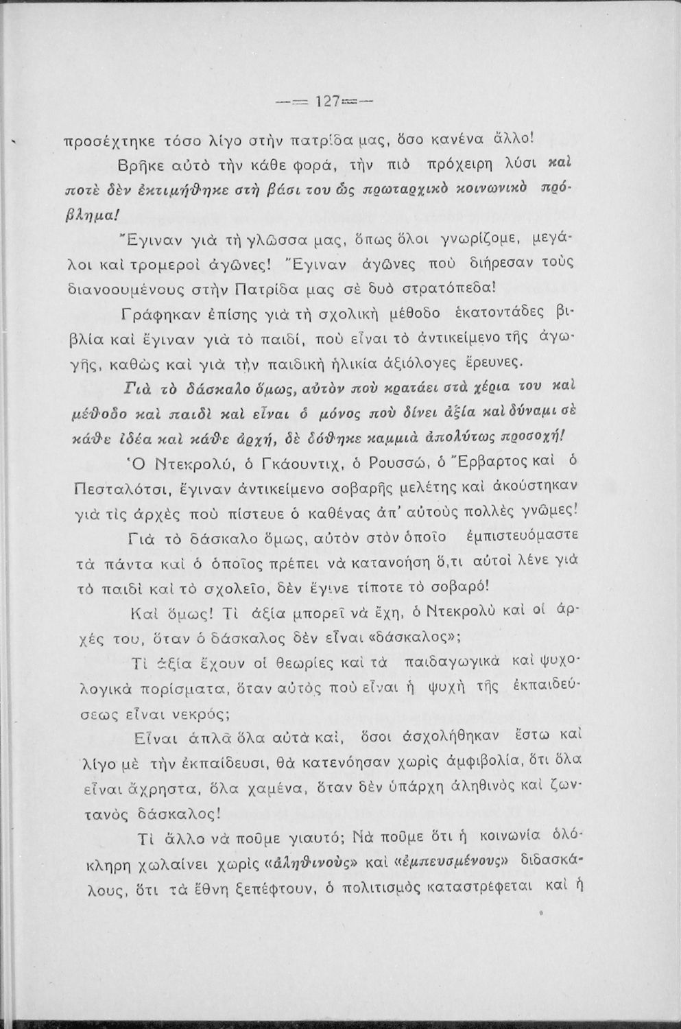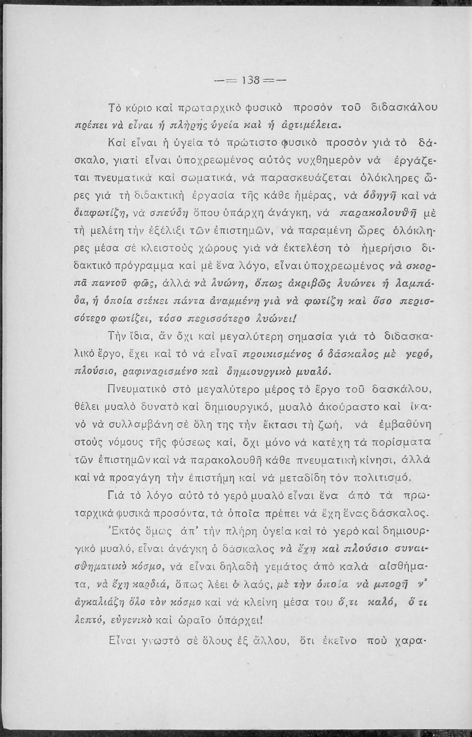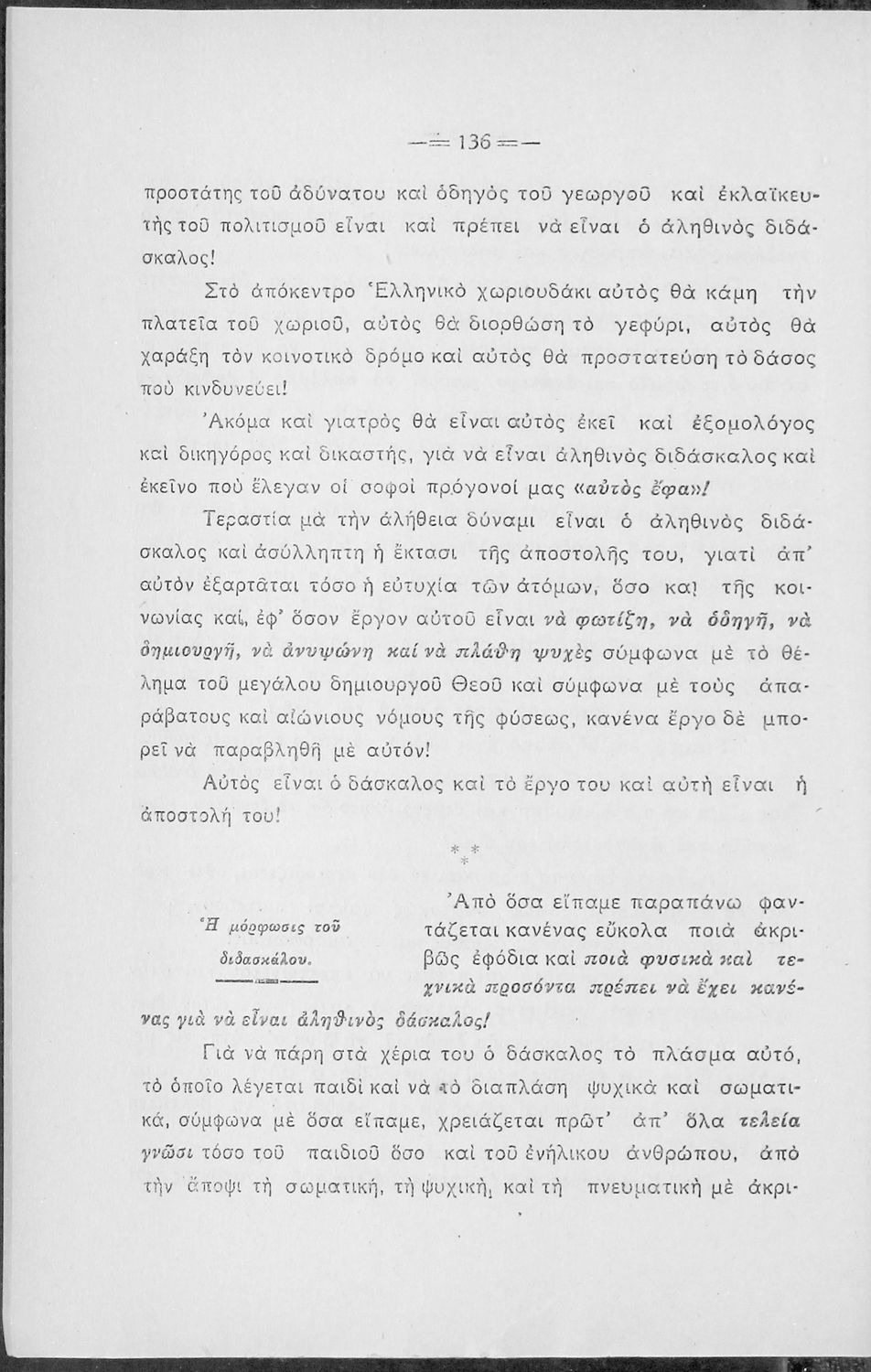Παιδαγωγικό βοήθημα το οποίο, εκτός από το αναλυτικό πρόγραμμα του Δημοτικού, εξετάζει κάποια βασικά εκπαιδευτικά προβλήματα όπως ο σκοπός της αγωγής. Φέρει την υπογραφή του συγγραφέα, καθώς και ιδιόχειρη αφιέρωσή του.