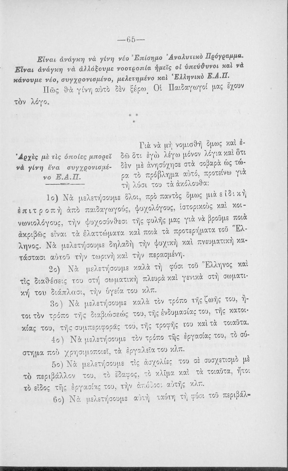 Τίτλος: Τα βασικά εκπαιδευτικά προβλήματα. Σκοπός της αγωγής. Επίσημο Αναλυτικό Πρόγραμμα - Μέθοδος διδασκαλίας. Ο διδάσκαλος «Το πρόβλημα των προβλημάτων»