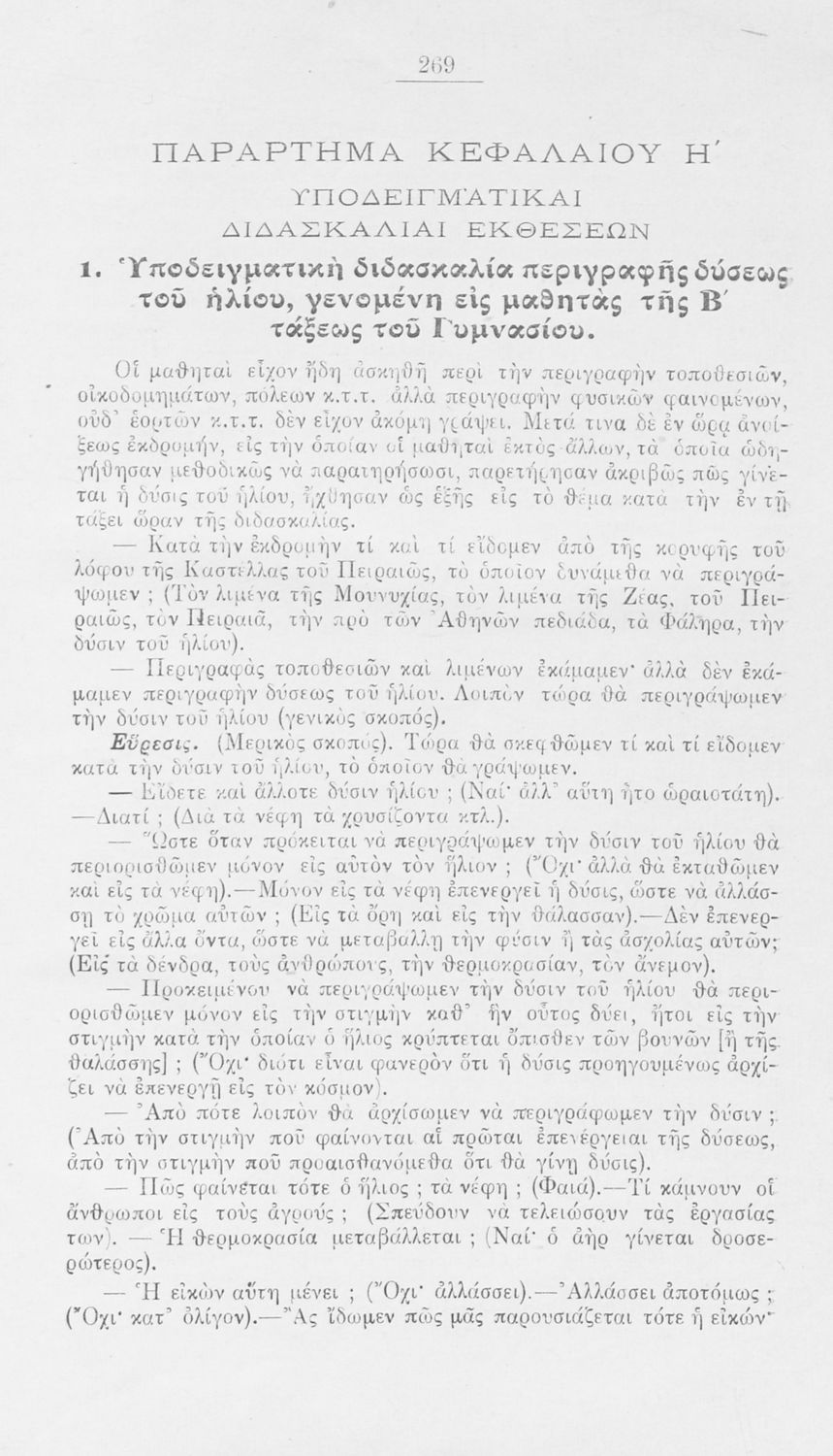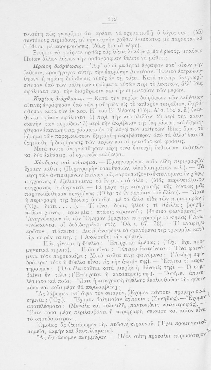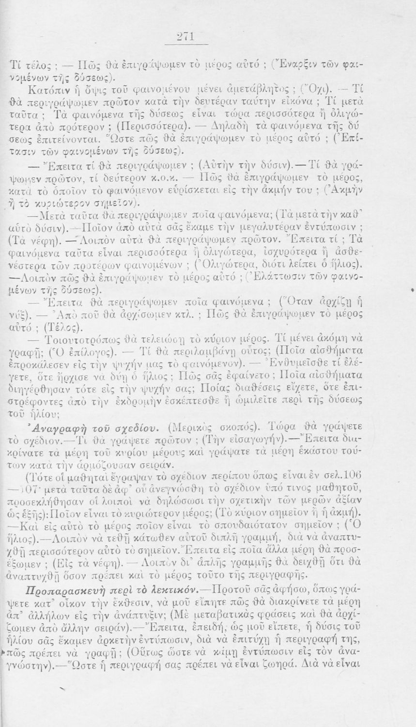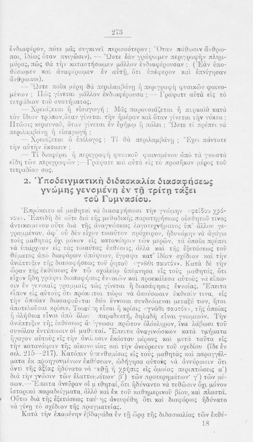 Βαθμίδα εκπαίδευσης: Δευτεροβάθμια Τάξη: Γυμνάσιο Μάθημα: Νέα Ελληνικά Γλώσσα: Καθαρεύουσα Παρουσίαση περιεχομένου: Παιδαγωγικό βοήθημα Νέων Ελληνικών Γυμνασίου που εστιάζει στην οριοθέτηση, δομή και ανάπτυξη ενός θέματος, το οποίο, με τη σειρά του, υποδιαιρείται σε ιστορικό και λογικό/φιλοσοφικό. Περιέχει υποδειγματικές διδασκαλίες εκθέσεων. |