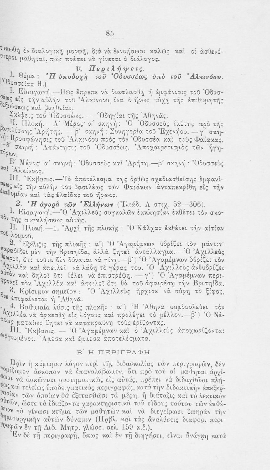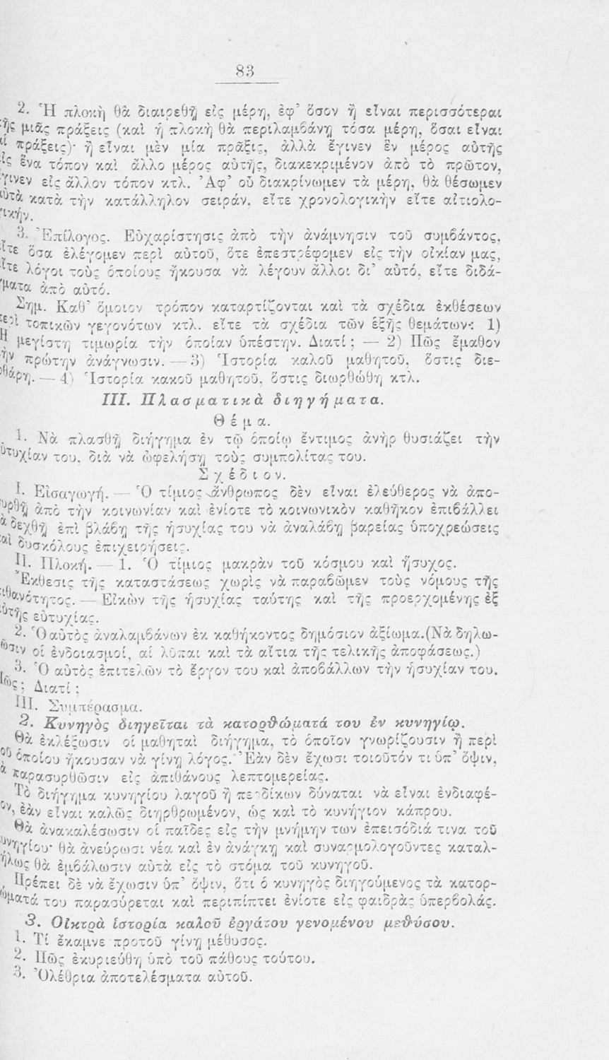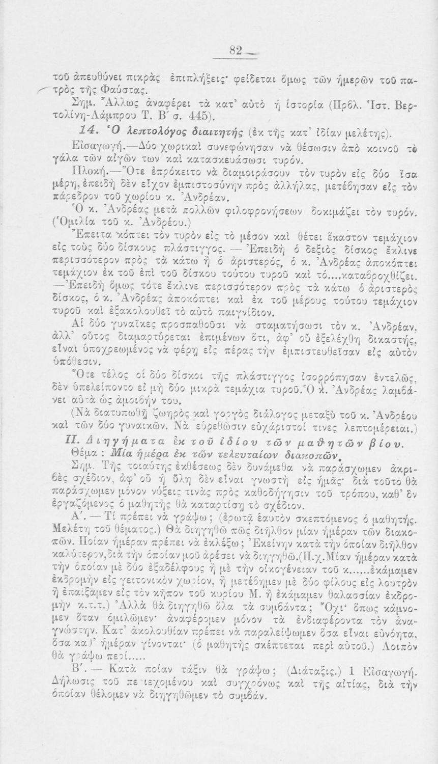 Βαθμίδα εκπαίδευσης: Δευτεροβάθμια Τάξη: Γυμνάσιο Μάθημα: Νέα Ελληνικά Γλώσσα: Καθαρεύουσα Παρουσίαση περιεχομένου: Παιδαγωγικό βοήθημα Νέων Ελληνικών Γυμνασίου που εστιάζει στην οριοθέτηση, δομή και ανάπτυξη ενός θέματος, το οποίο, με τη σειρά του, υποδιαιρείται σε ιστορικό και λογικό/φιλοσοφικό. Περιέχει υποδειγματικές διδασκαλίες εκθέσεων. |