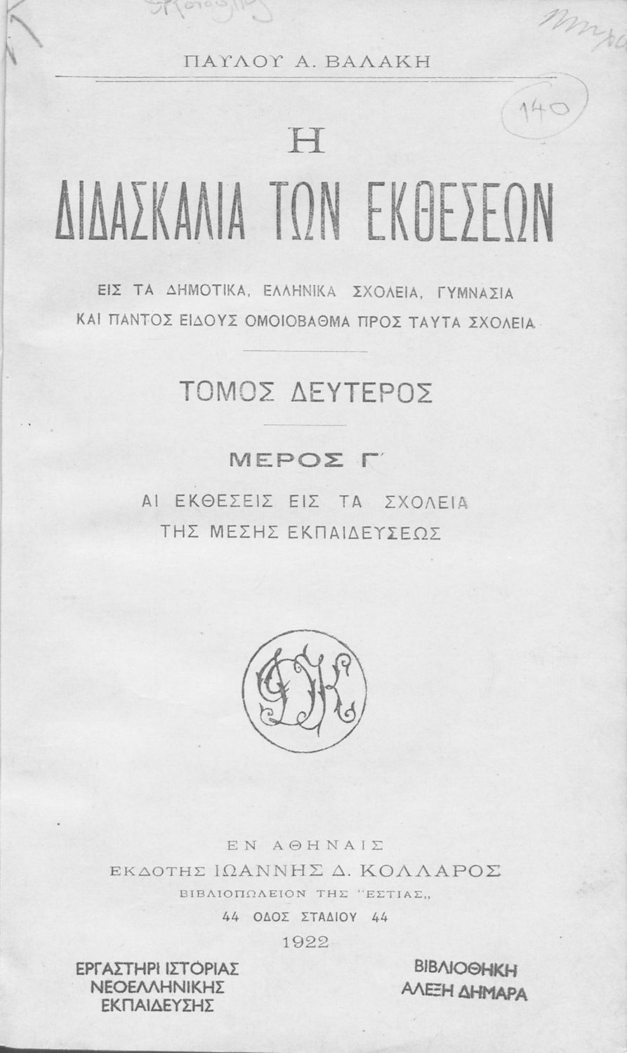 Εντοπισμός πρωτοτύπου: Εργαστήρι Ιστορίας Ν.Ε. Εκπαίδευσης, Πανεπιστήμιο Ιωαννίνων Κωδικός βιβλιοθήκης: 140 |
