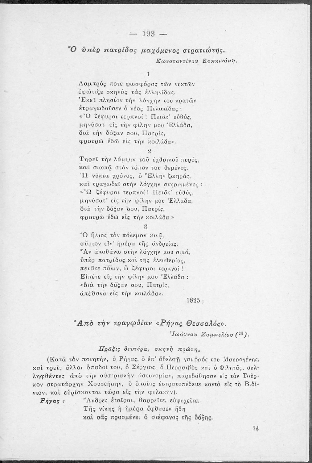 Σχολικό εγχειρίδιο Νεοελληνικών αναγνωσμάτων που περιλαμβάνει πεζά και ποιήματα Ελλήνων συγγραφέων με θέματα από την εθνική ζωή. Περιέχει και παράρτημα με βιογραφίες των συγγραφέων και λεξιλόγιο.