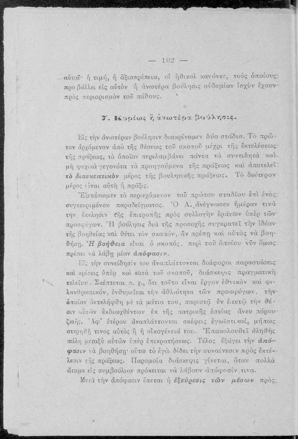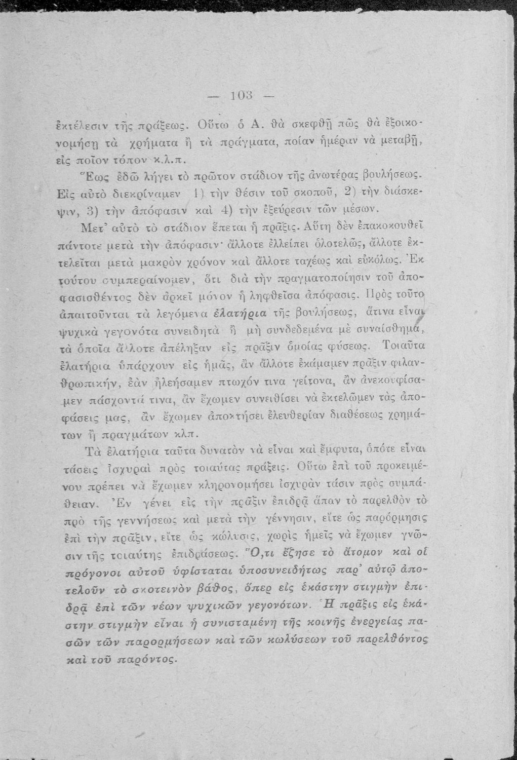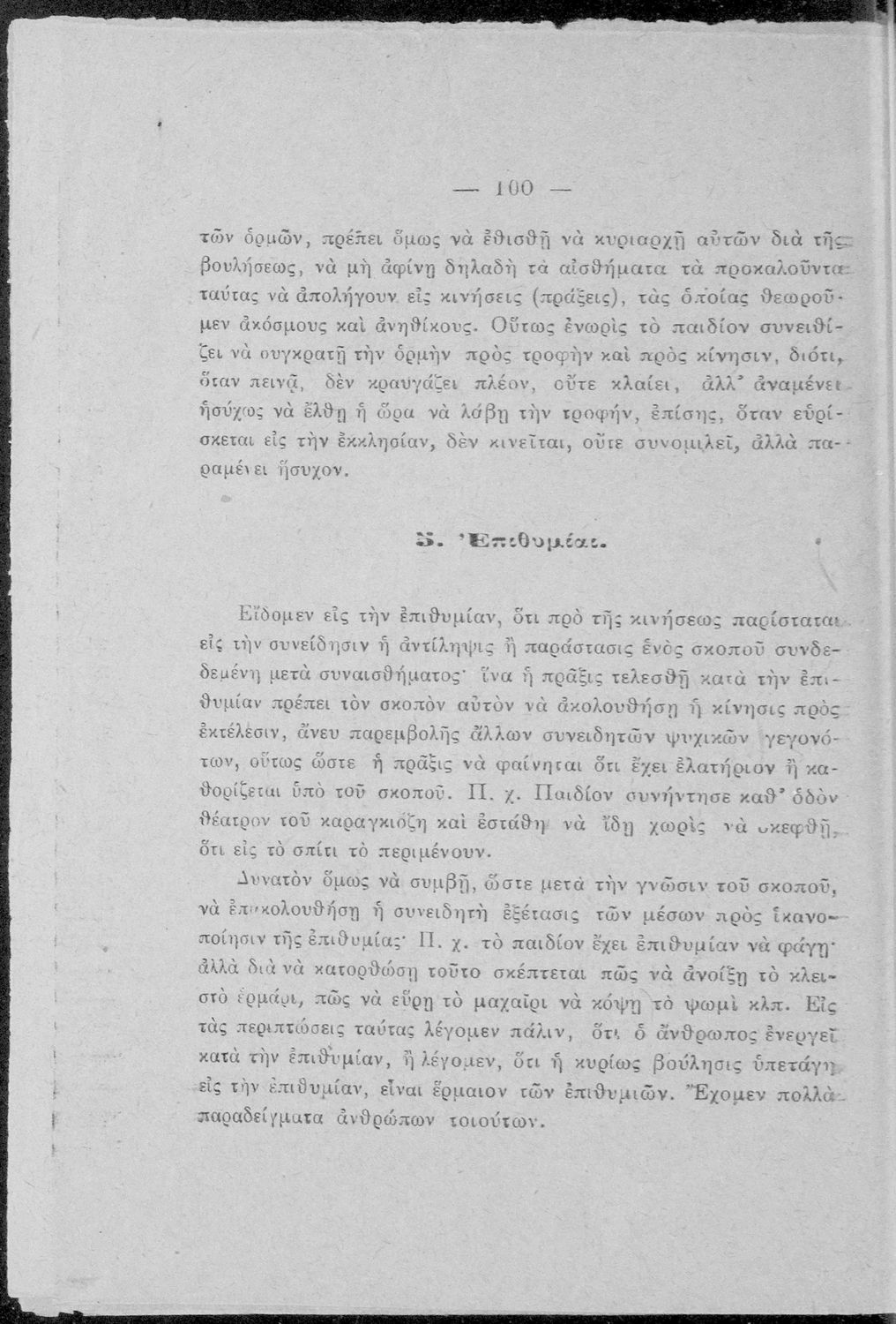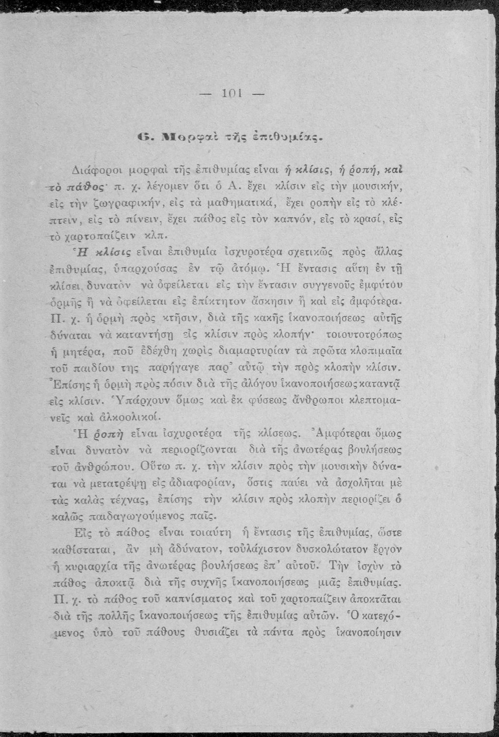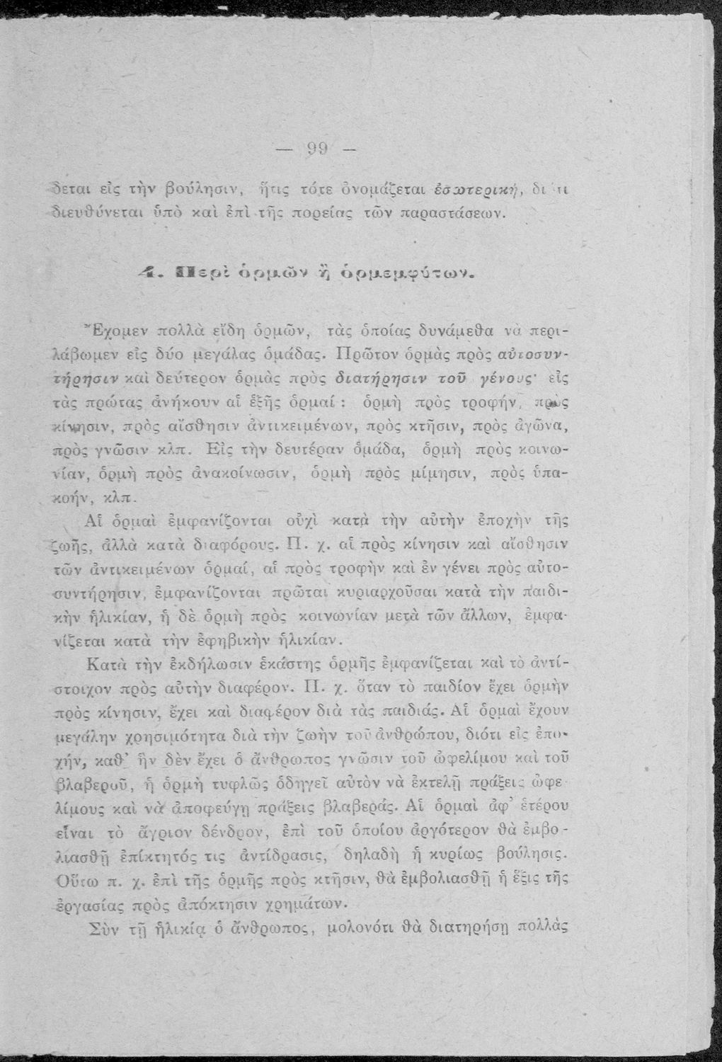 Βαθμίδα εκπαίδευσης: Δευτεροβάθμια Τάξη: Γ' Γυμνασίου Μάθημα: Ψυχολογία Γλώσσα: Απλή καθαρεύουσα Παρουσίαση περιεχομένου: Σχολικό εγχειρίδιο Πειραματικής Ψυχολογίας για τη Γ΄ Γυμνασίου χωρισμένο σε τρία τμήματα: το παριστάναι, το συναισθάνεσθαι, και το βούλεσθαι. |