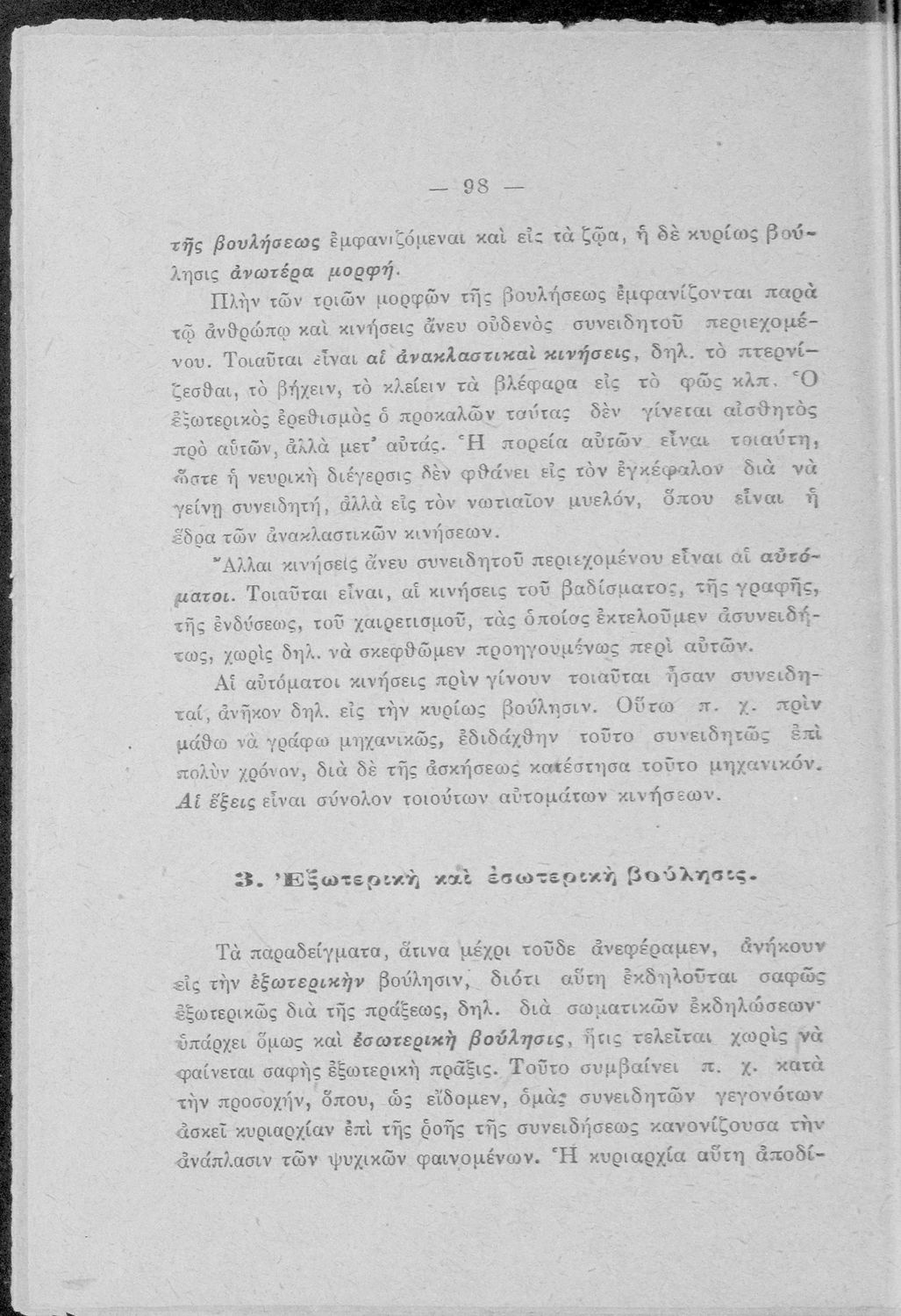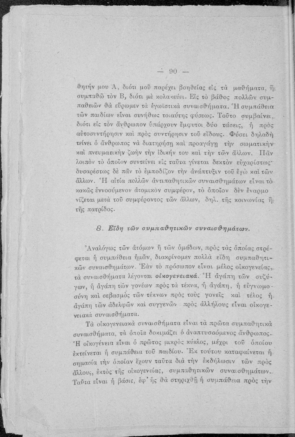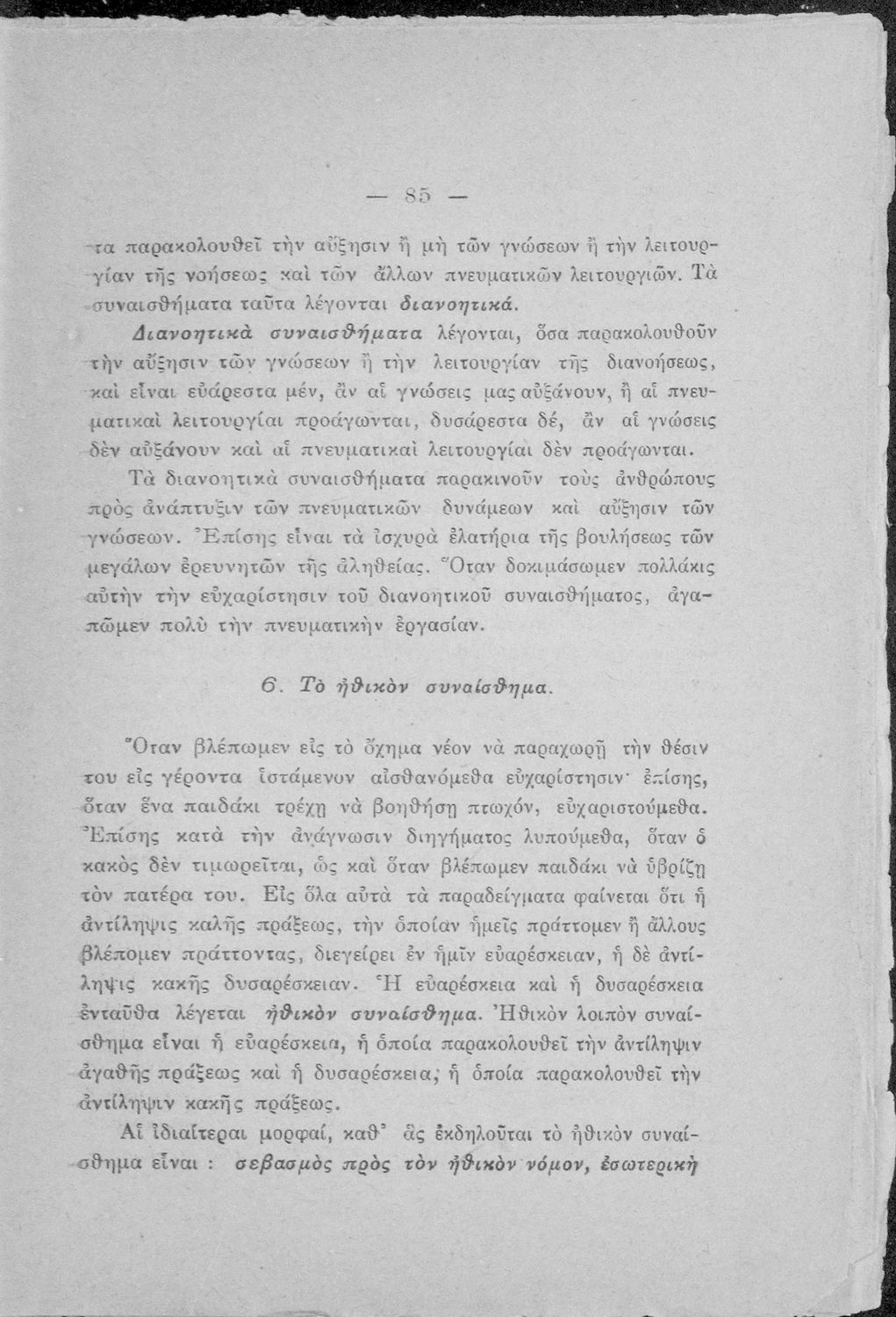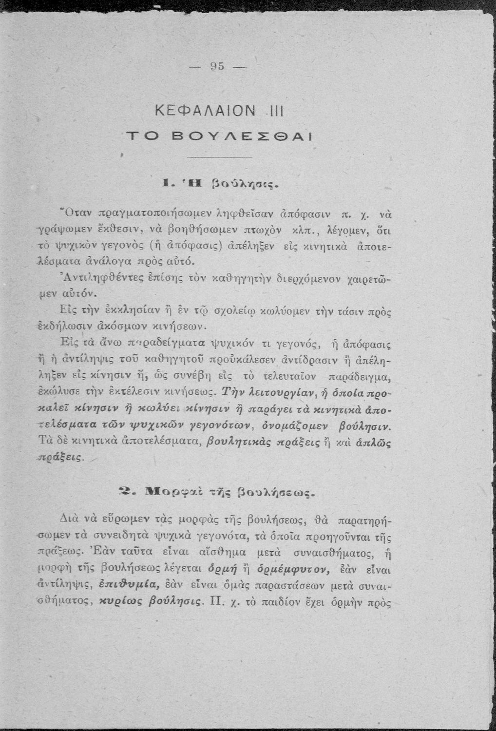 Βαθμίδα εκπαίδευσης: Δευτεροβάθμια Τάξη: Γ' Γυμνασίου Μάθημα: Ψυχολογία Γλώσσα: Απλή καθαρεύουσα Παρουσίαση περιεχομένου: Σχολικό εγχειρίδιο Πειραματικής Ψυχολογίας για τη Γ΄ Γυμνασίου χωρισμένο σε τρία τμήματα: το παριστάναι, το συναισθάνεσθαι, και το βούλεσθαι. |