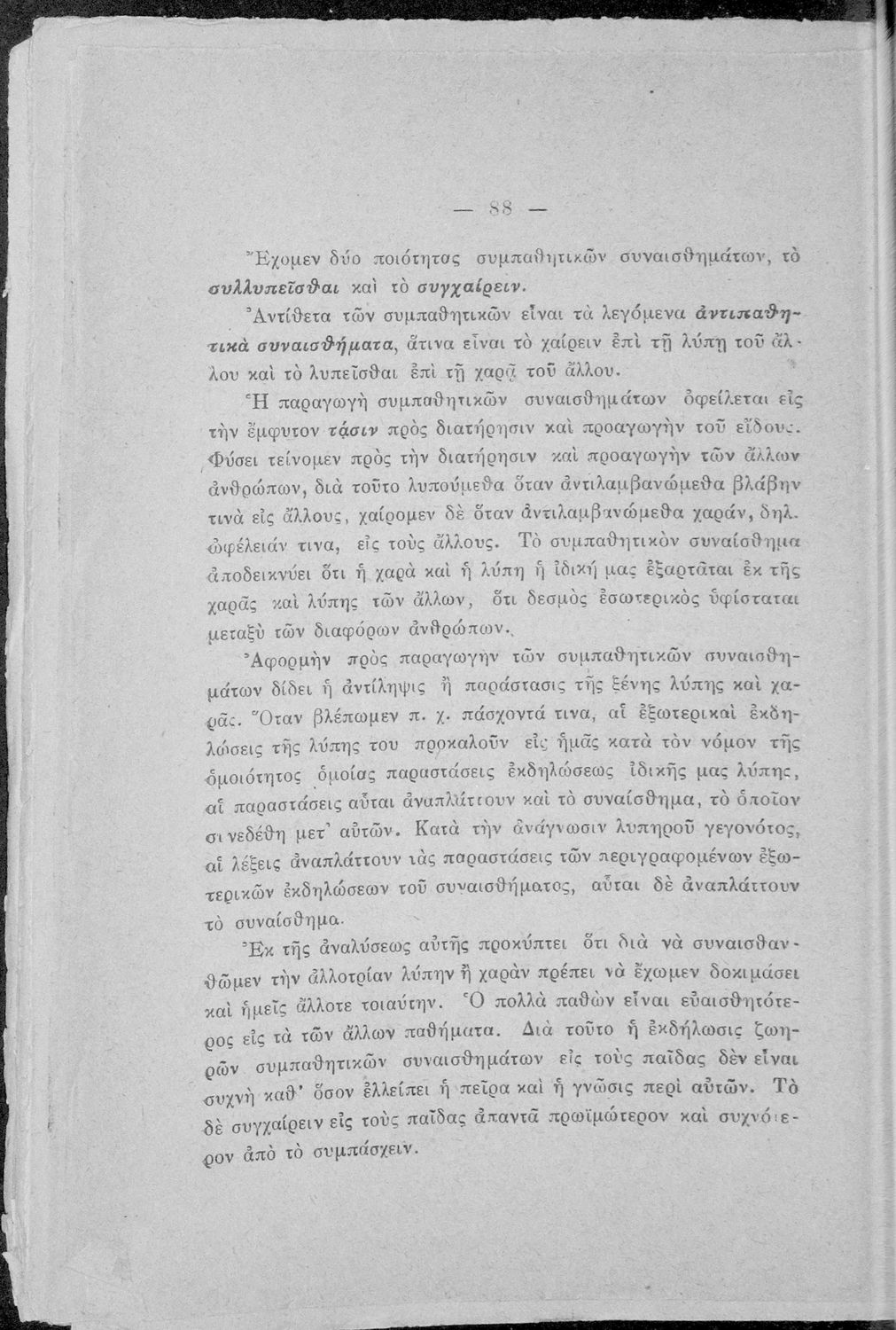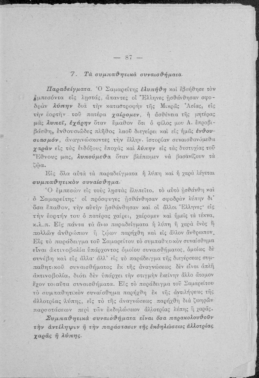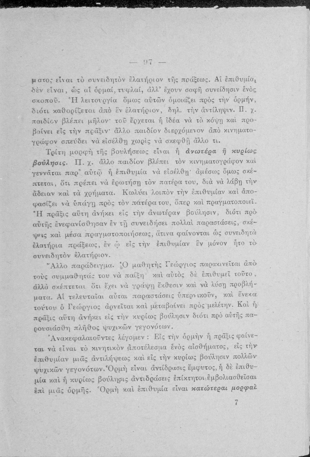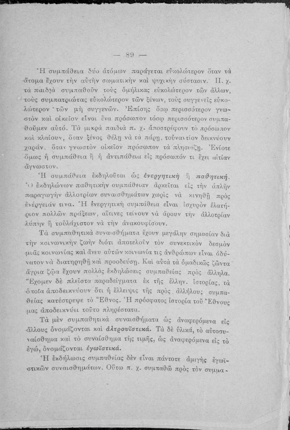 Βαθμίδα εκπαίδευσης: Δευτεροβάθμια Τάξη: Γ' Γυμνασίου Μάθημα: Ψυχολογία Γλώσσα: Απλή καθαρεύουσα Παρουσίαση περιεχομένου: Σχολικό εγχειρίδιο Πειραματικής Ψυχολογίας για τη Γ΄ Γυμνασίου χωρισμένο σε τρία τμήματα: το παριστάναι, το συναισθάνεσθαι, και το βούλεσθαι. |