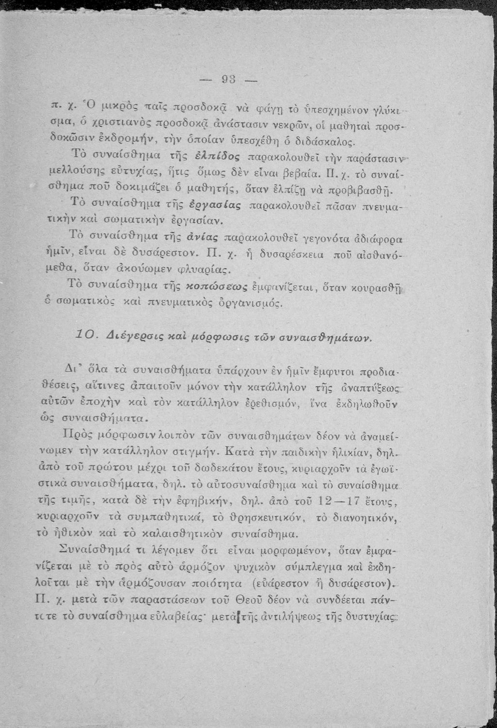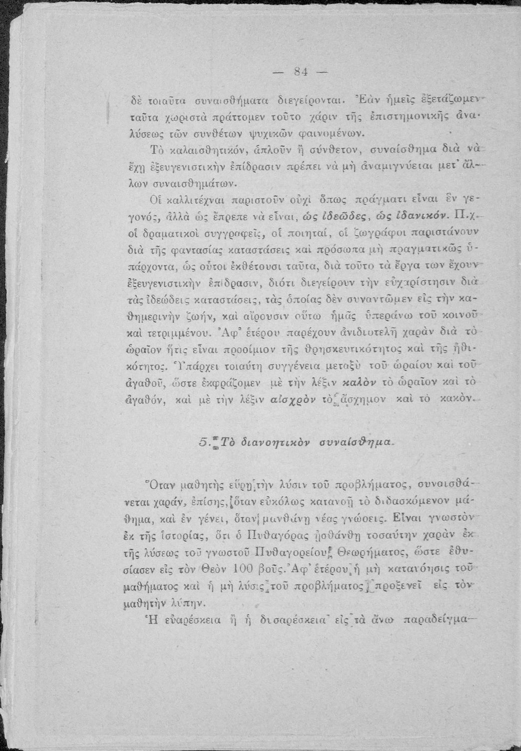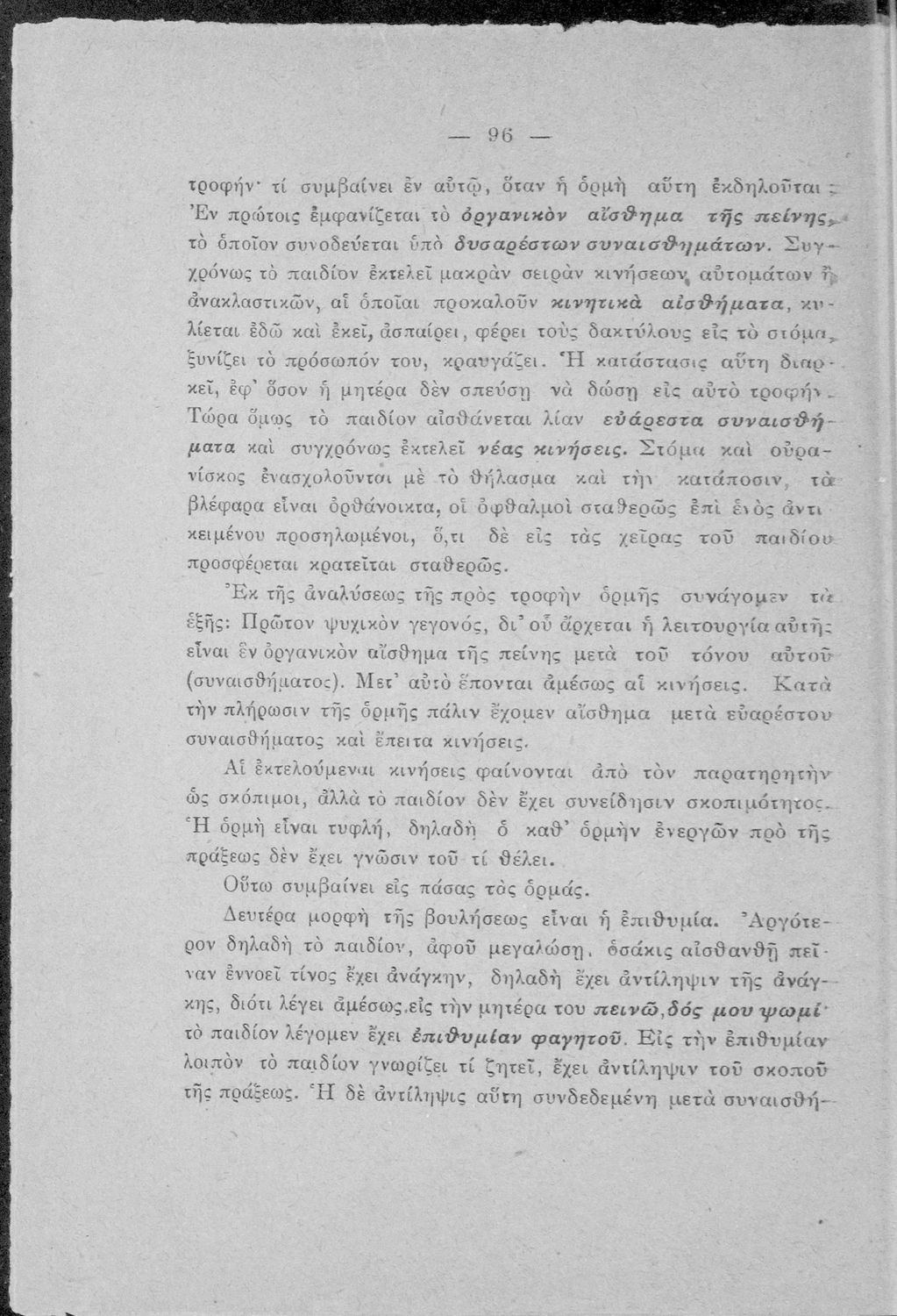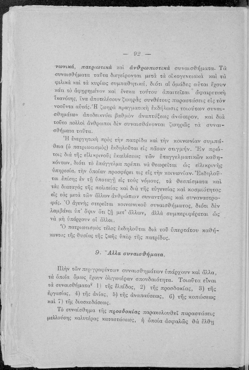 Βαθμίδα εκπαίδευσης: Δευτεροβάθμια Τάξη: Γ' Γυμνασίου Μάθημα: Ψυχολογία Γλώσσα: Απλή καθαρεύουσα Παρουσίαση περιεχομένου: Σχολικό εγχειρίδιο Πειραματικής Ψυχολογίας για τη Γ΄ Γυμνασίου χωρισμένο σε τρία τμήματα: το παριστάναι, το συναισθάνεσθαι, και το βούλεσθαι. |