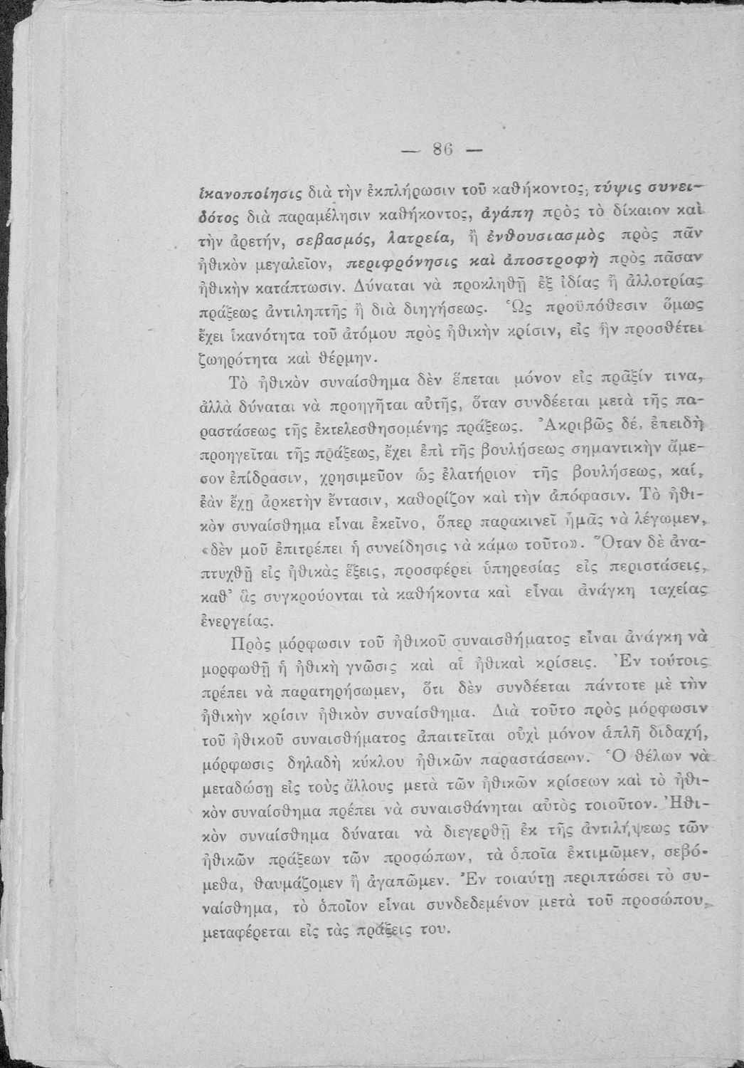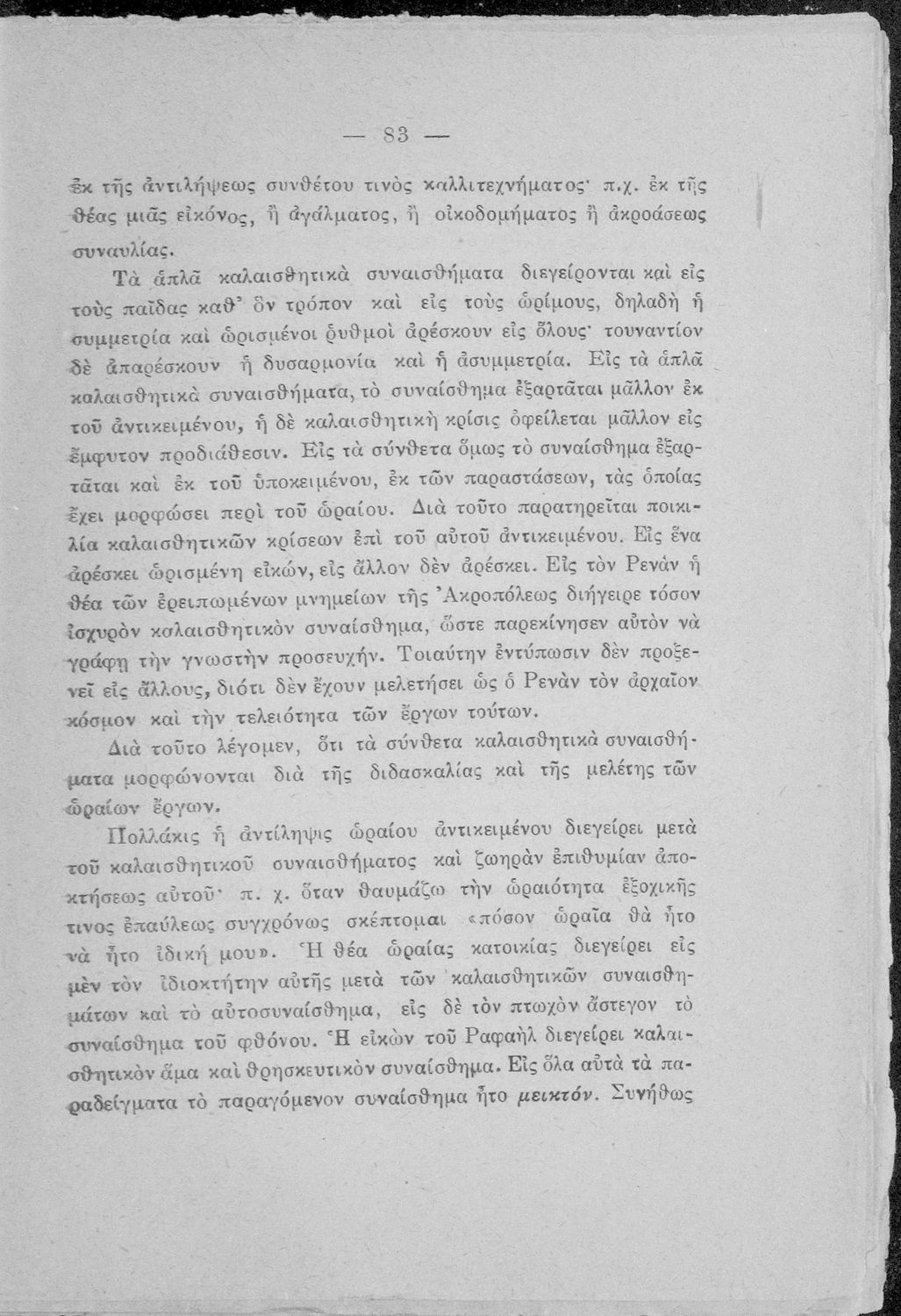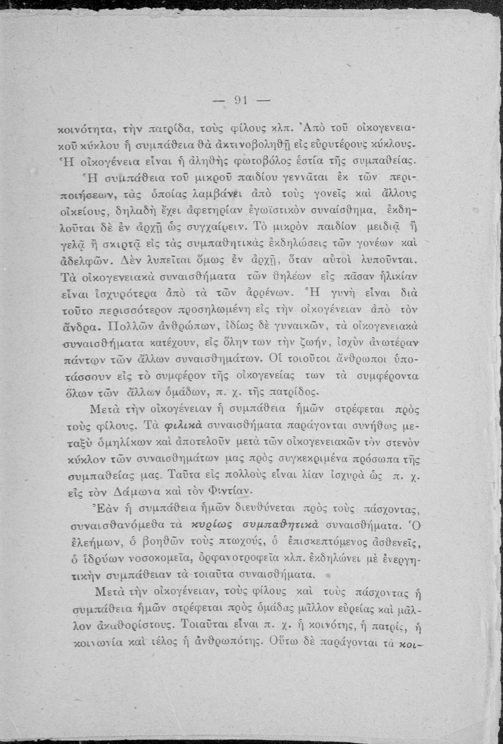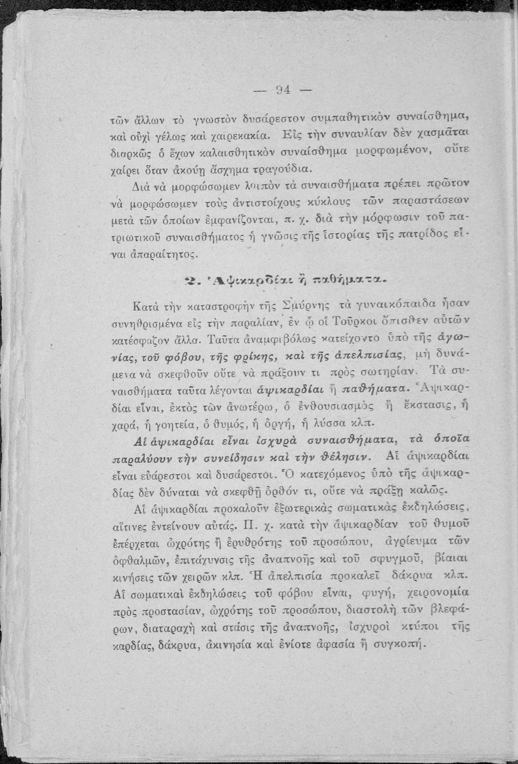 Βαθμίδα εκπαίδευσης: Δευτεροβάθμια Τάξη: Γ' Γυμνασίου Μάθημα: Ψυχολογία Γλώσσα: Απλή καθαρεύουσα Παρουσίαση περιεχομένου: Σχολικό εγχειρίδιο Πειραματικής Ψυχολογίας για τη Γ΄ Γυμνασίου χωρισμένο σε τρία τμήματα: το παριστάναι, το συναισθάνεσθαι, και το βούλεσθαι. |