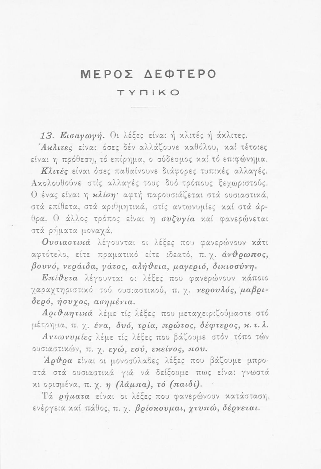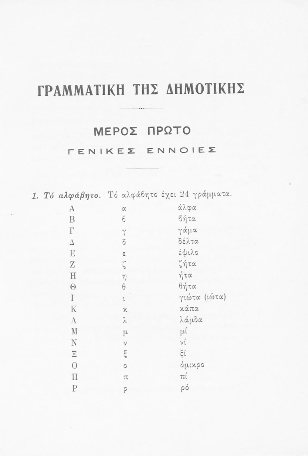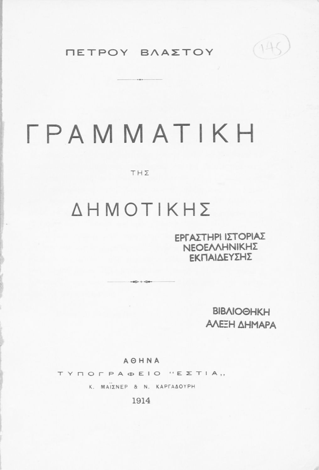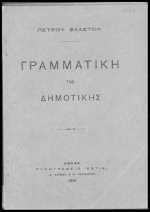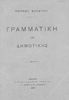 Μάθημα: Νέα Ελληνικά Γλώσσα: Δημοτική Παρουσίαση περιεχομένου: Γραμματική της δημοτικής που μεθοδολογικά βασίζεται στο έργο του Ψυχάρη και στις γραμματικές των Φιλήντα, Pernot και Thumb. Σύμφωνα με το συγγραφέα "φιλοδοξία της γραμματικής τούτης είναι να βοηθήσει το στέριωμα της γλωσσικής πειθαρχίας και να δώσει στα παιδιά μια σύντομη και σωστή γραμματική της γλώσσας τους". |