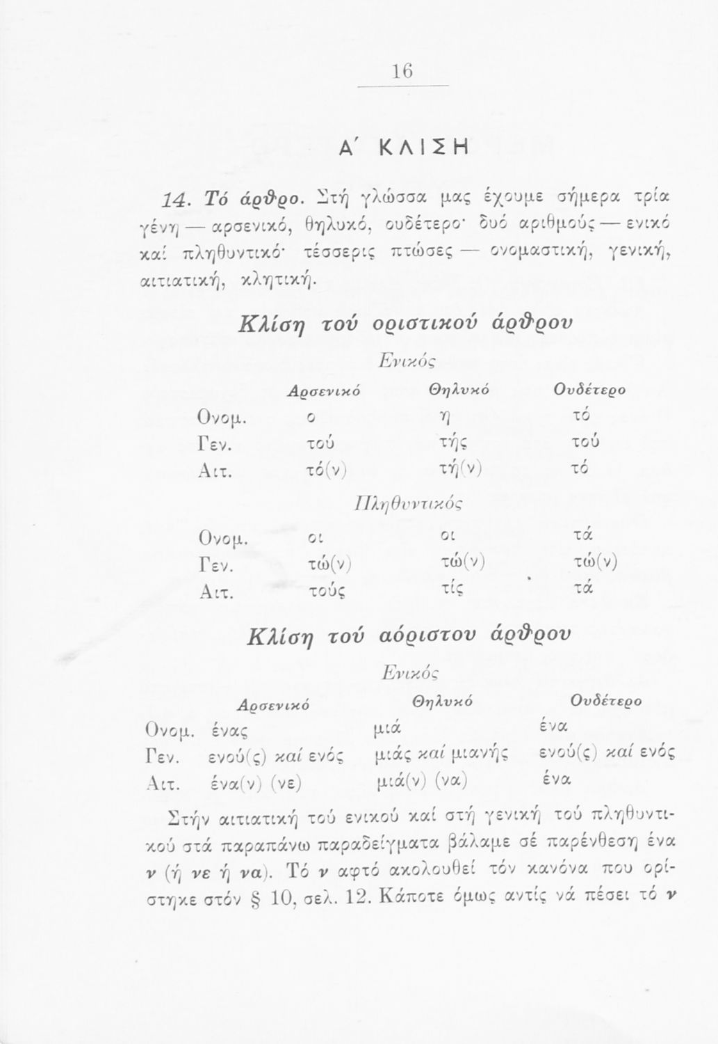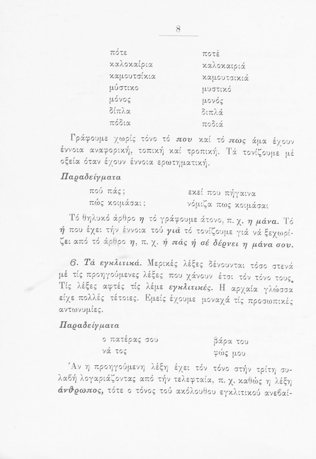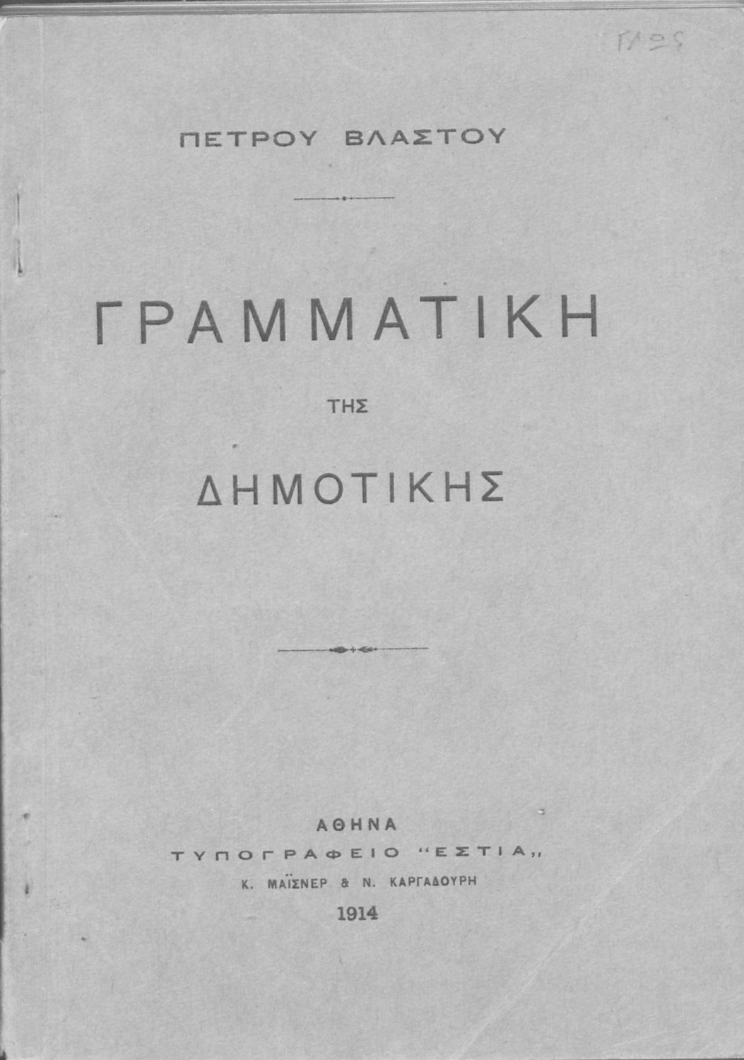 Μάθημα: Νέα Ελληνικά Γλώσσα: Δημοτική Παρουσίαση περιεχομένου: Γραμματική της δημοτικής που μεθοδολογικά βασίζεται στο έργο του Ψυχάρη και στις γραμματικές των Φιλήντα, Pernot και Thumb. Σύμφωνα με το συγγραφέα "φιλοδοξία της γραμματικής τούτης είναι να βοηθήσει το στέριωμα της γλωσσικής πειθαρχίας και να δώσει στα παιδιά μια σύντομη και σωστή γραμματική της γλώσσας τους". |