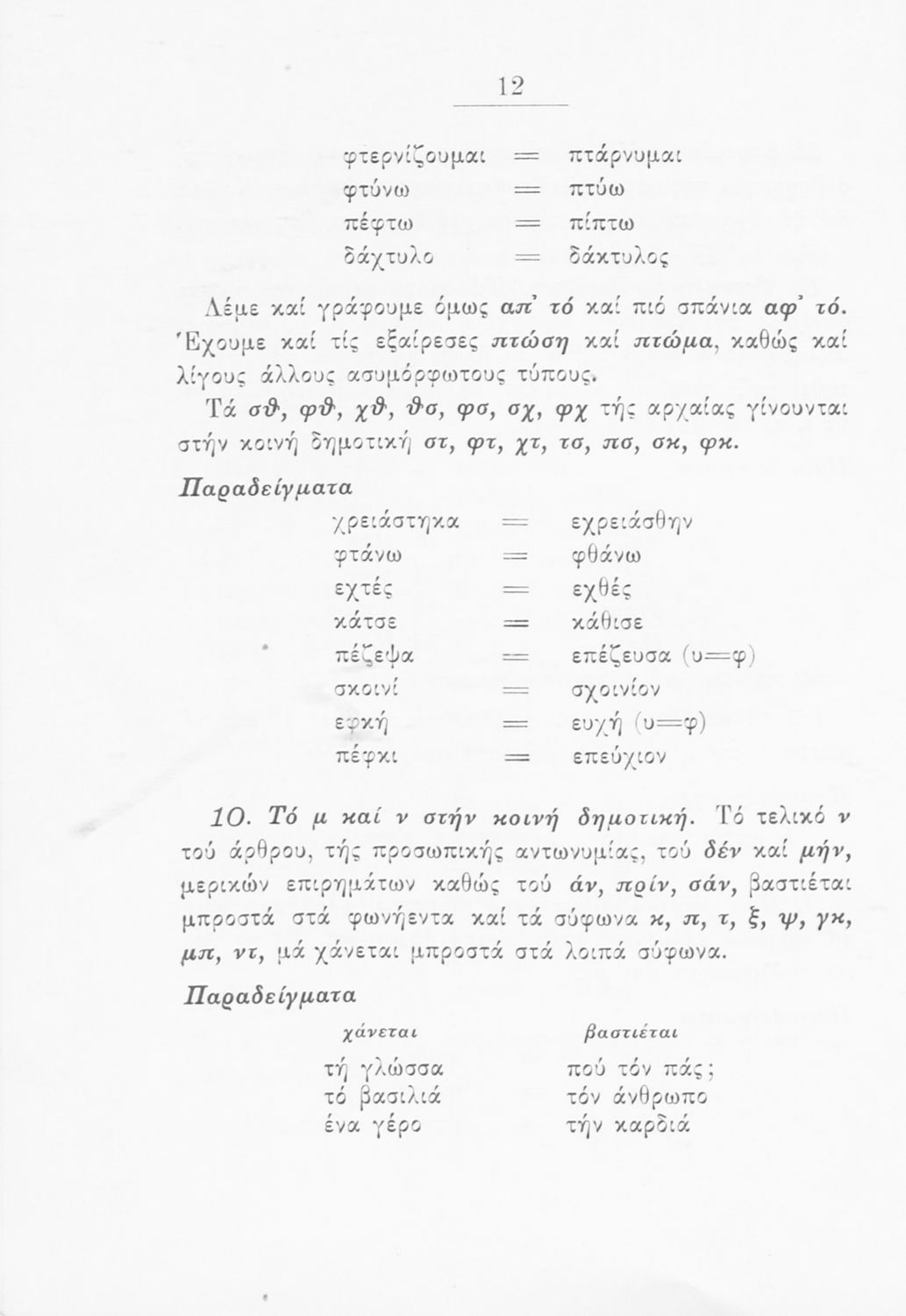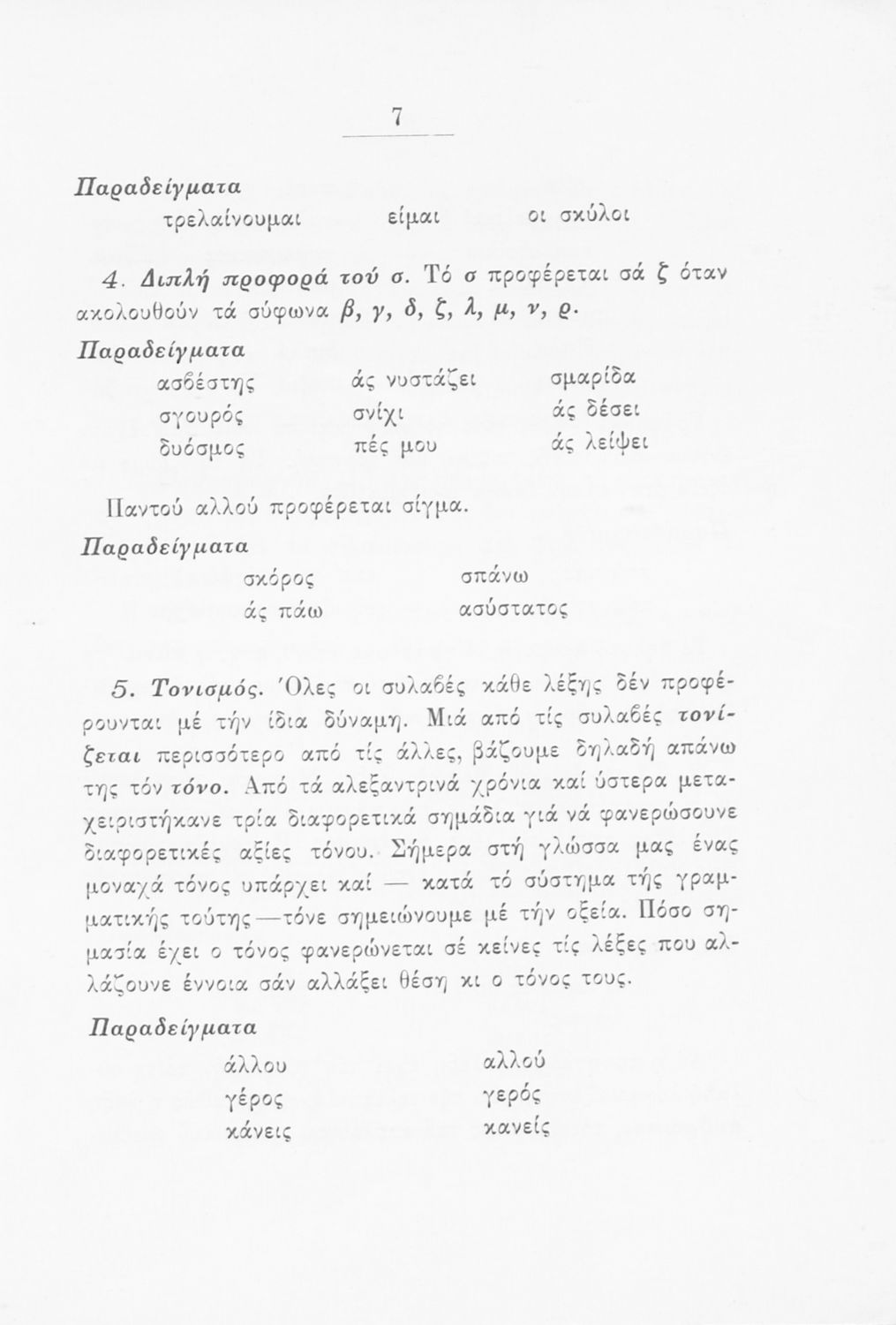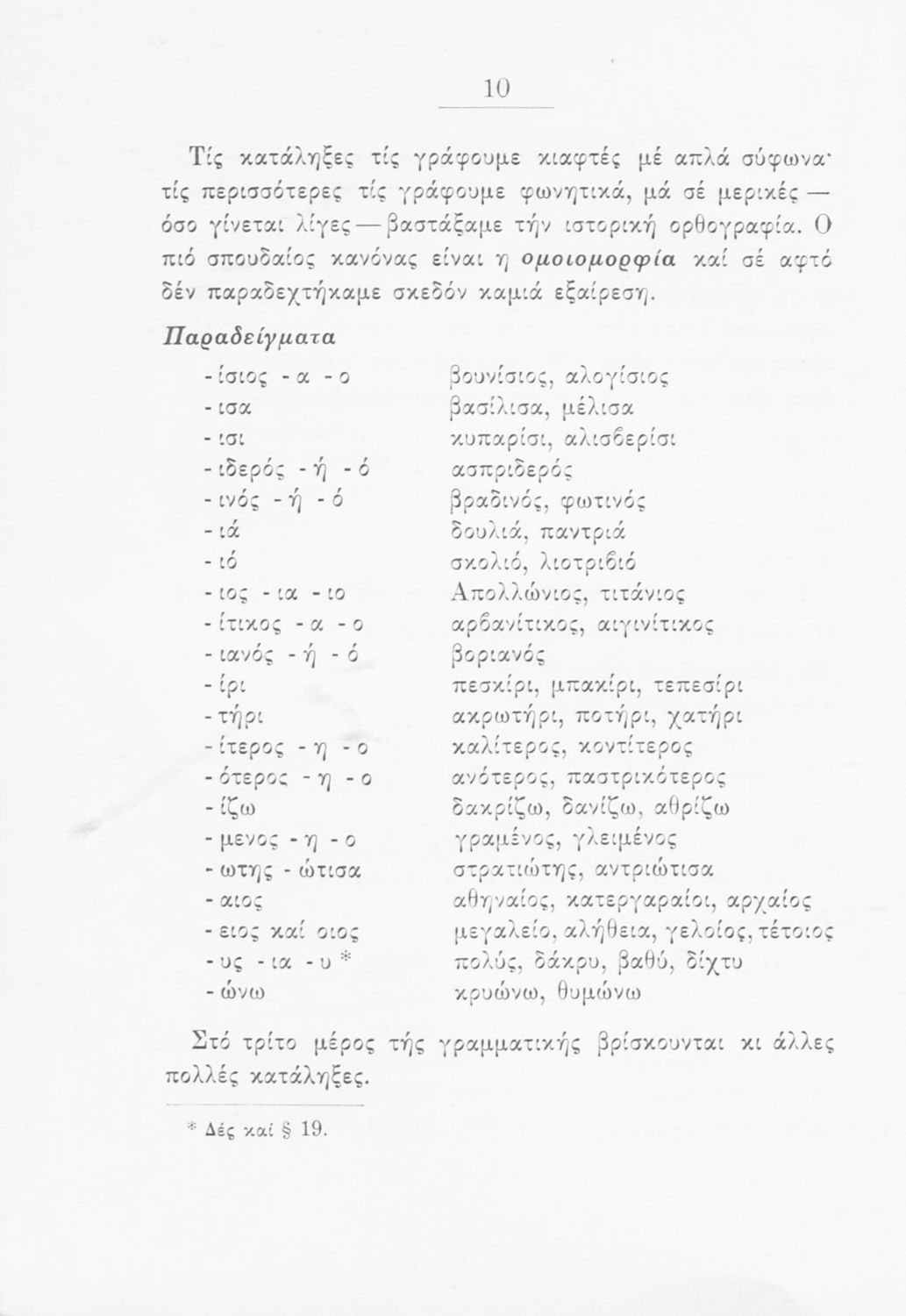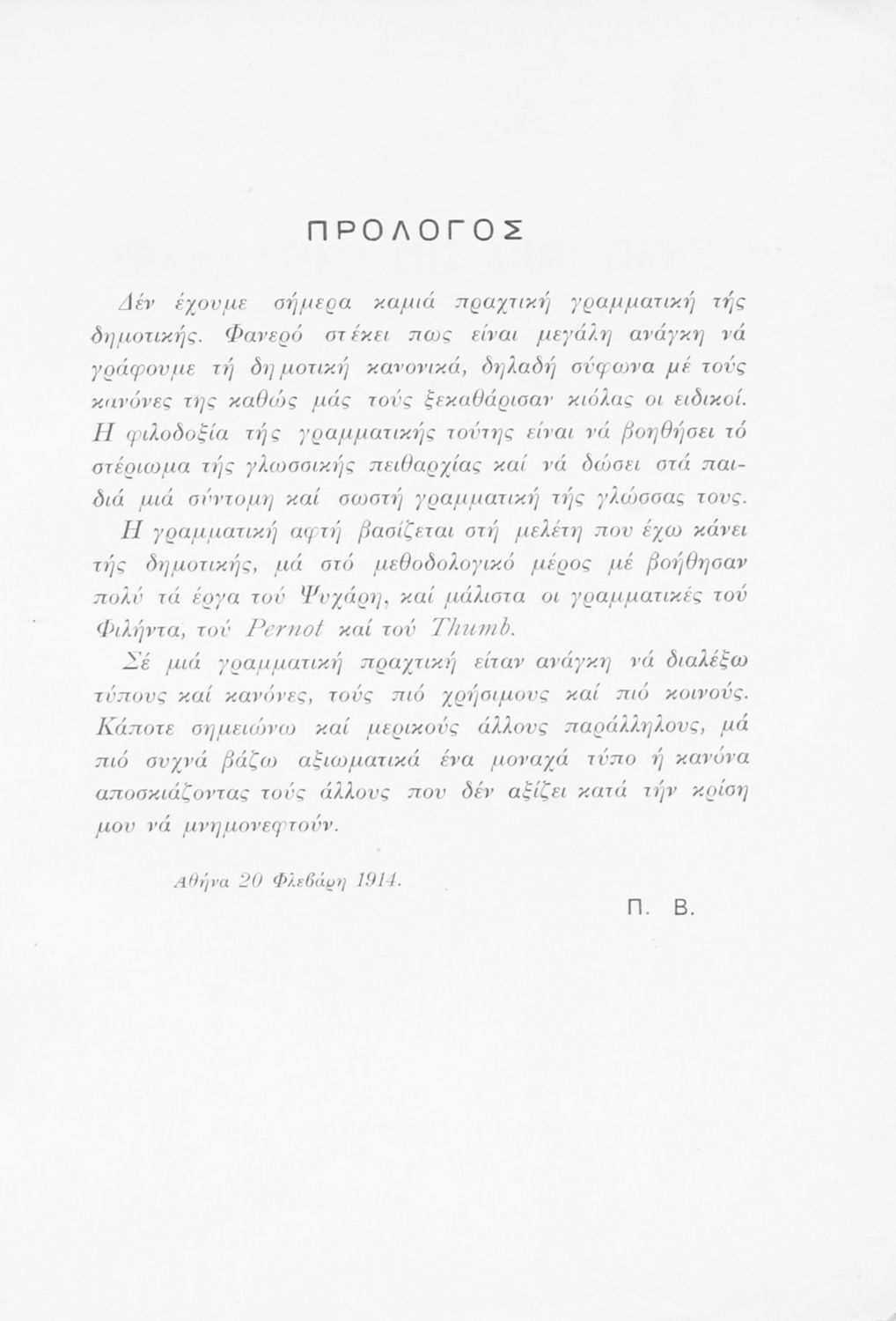 Γραμματική της δημοτικής που μεθοδολογικά βασίζεται στο έργο του Ψυχάρη και στις γραμματικές των Φιλήντα, Pernot και Thumb. Σύμφωνα με το συγγραφέα "φιλοδοξία της γραμματικής τούτης είναι να βοηθήσει το στέριωμα της γλωσσικής πειθαρχίας και να δώσει στα παιδιά μια σύντομη και σωστή γραμματική της γλώσσας τους".