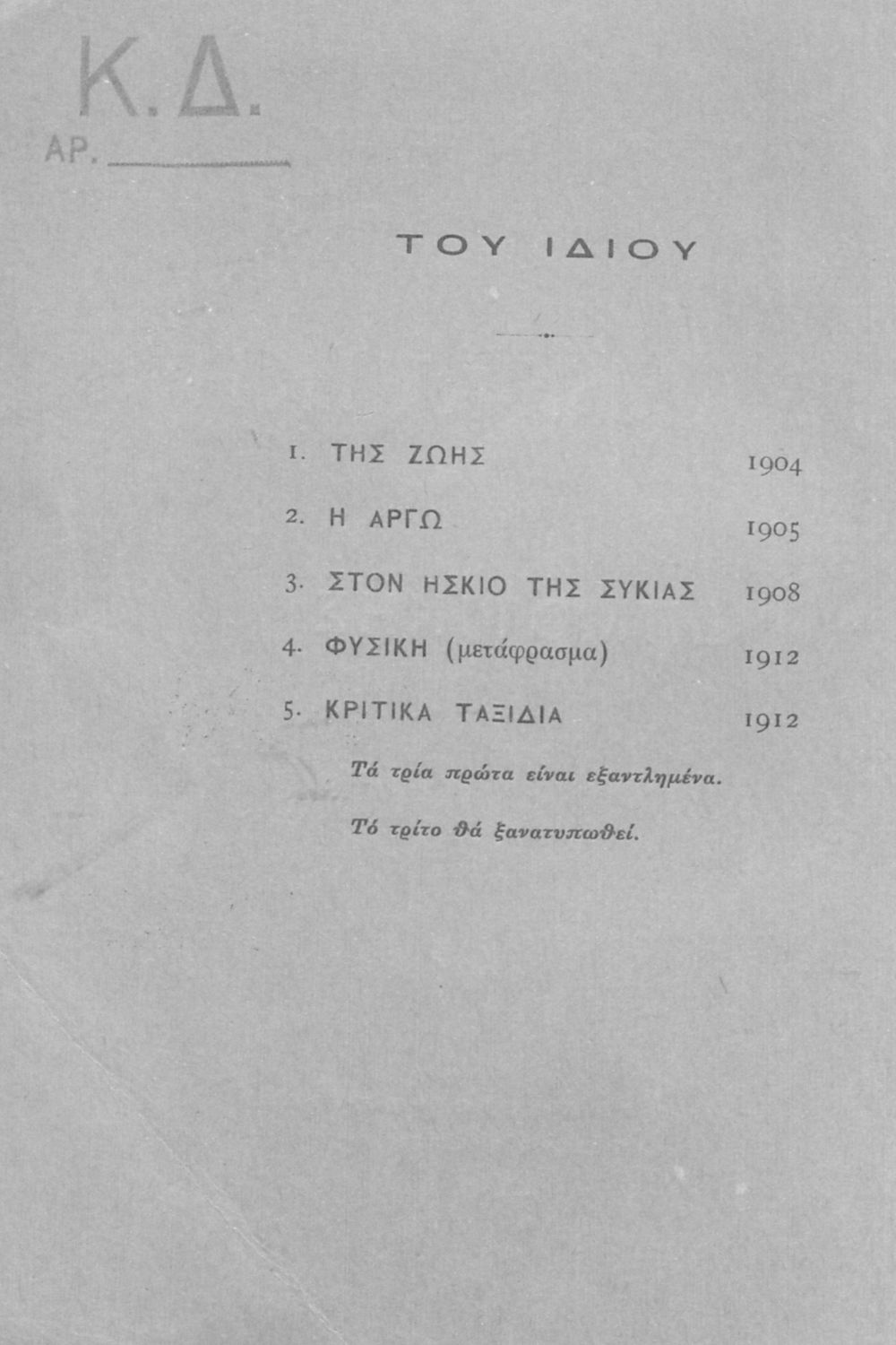 Εκδότης: Τυπογραφείο «Εστία» Έτος έκδοσης: 1914 Τόπος έκδοσης: Αθήνα |