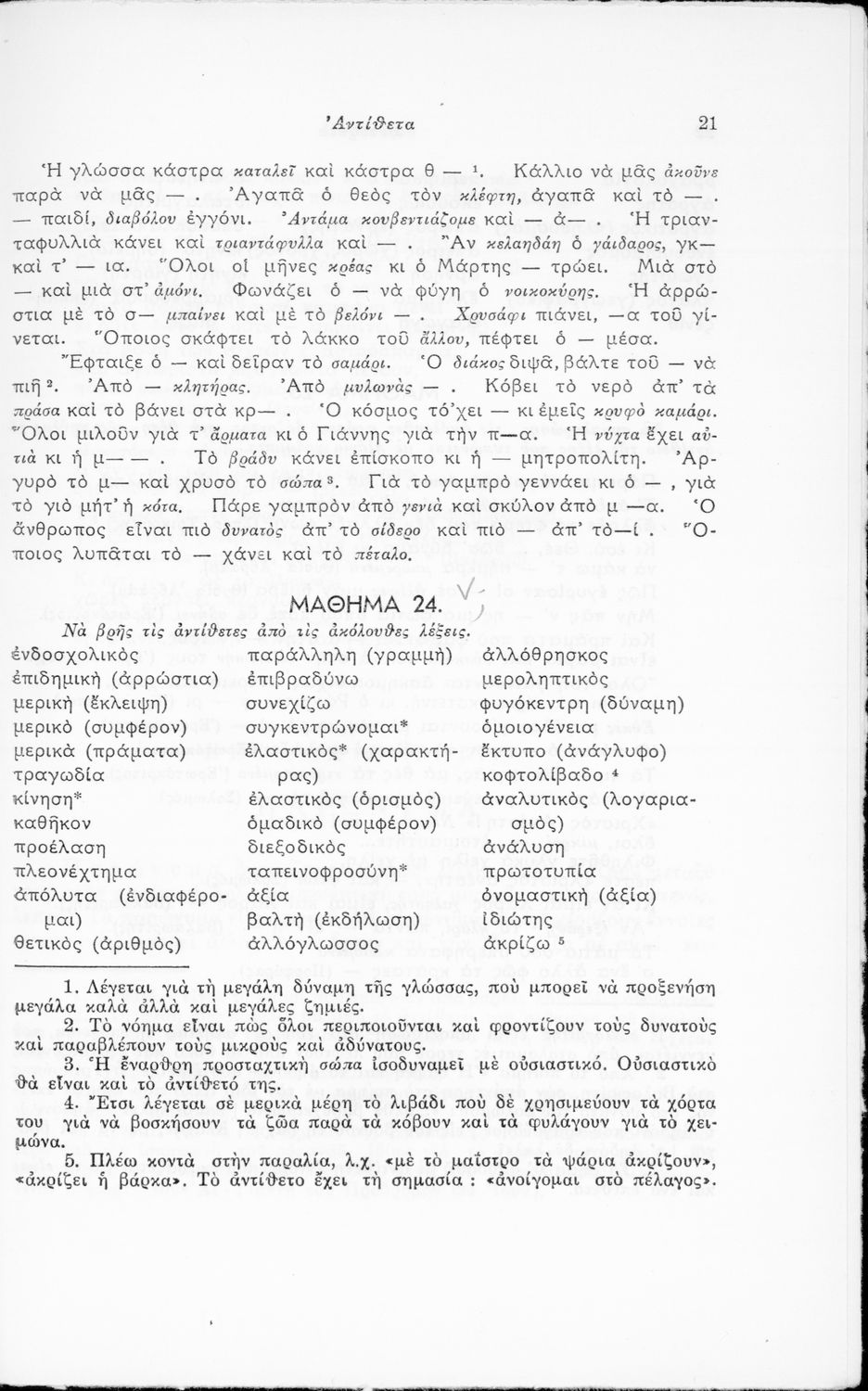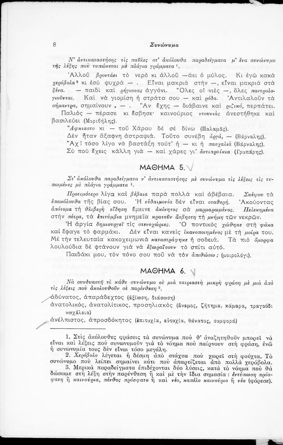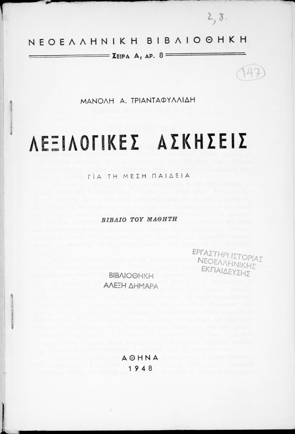 LDR 00970 2200181 4500 035 ## _a05-00147 040 ## _aΕργαστήρι Ιστορίας Ν.Ε. Εκπαίδευσης, Πανεπιστήμιο Ιωαννίνων 041 ## _ael 100 ## _aΜανόλης Α. Τριανταφυλλίδης 110 ## _a147 245 0# _aΛεξιλογικές Ασκήσεις για την Μέση Παιδεία βιβλίο του μαθητή 260 ## _aΑθήνα _bΜ. Δ. Μυρτίδης _c1948 300 ## _a78 _c21 520 ## _aΜαθητικό βοήθημα που περιέχει ατομικές και ομαδικές ασκήσεις και αποσκοπεί στη γλωσσική καλλιέργεια και την παροχή πραγματολογικών γνώσεων. 522 ## _aΕλλάδα 546 ## _aΔημοτική 563 ## _aΜαλακό Εξώφυλλο 650 #4 _aΑντίθετα _aΠαρομοίωση _aΠερίφραση _aΣυνώνυμα
