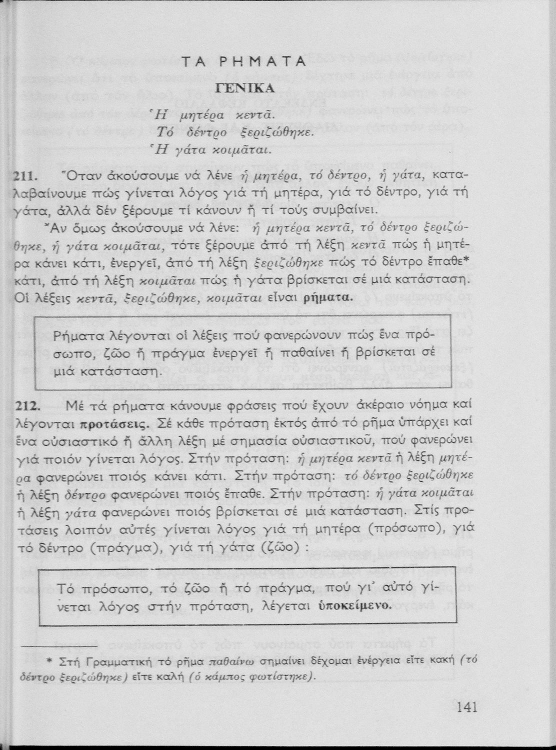 Σχολικό εγχειρίδιο Γραμματικής για τη ΣΤ΄ Δημοτικού και τις τάξεις της Μέσης εκπαίδευσης. Περιέχει τη διδασκαλία της Γραμματικής της δημοτικής και για τους παιδαγωγούς αλλά και τους μαθητές.