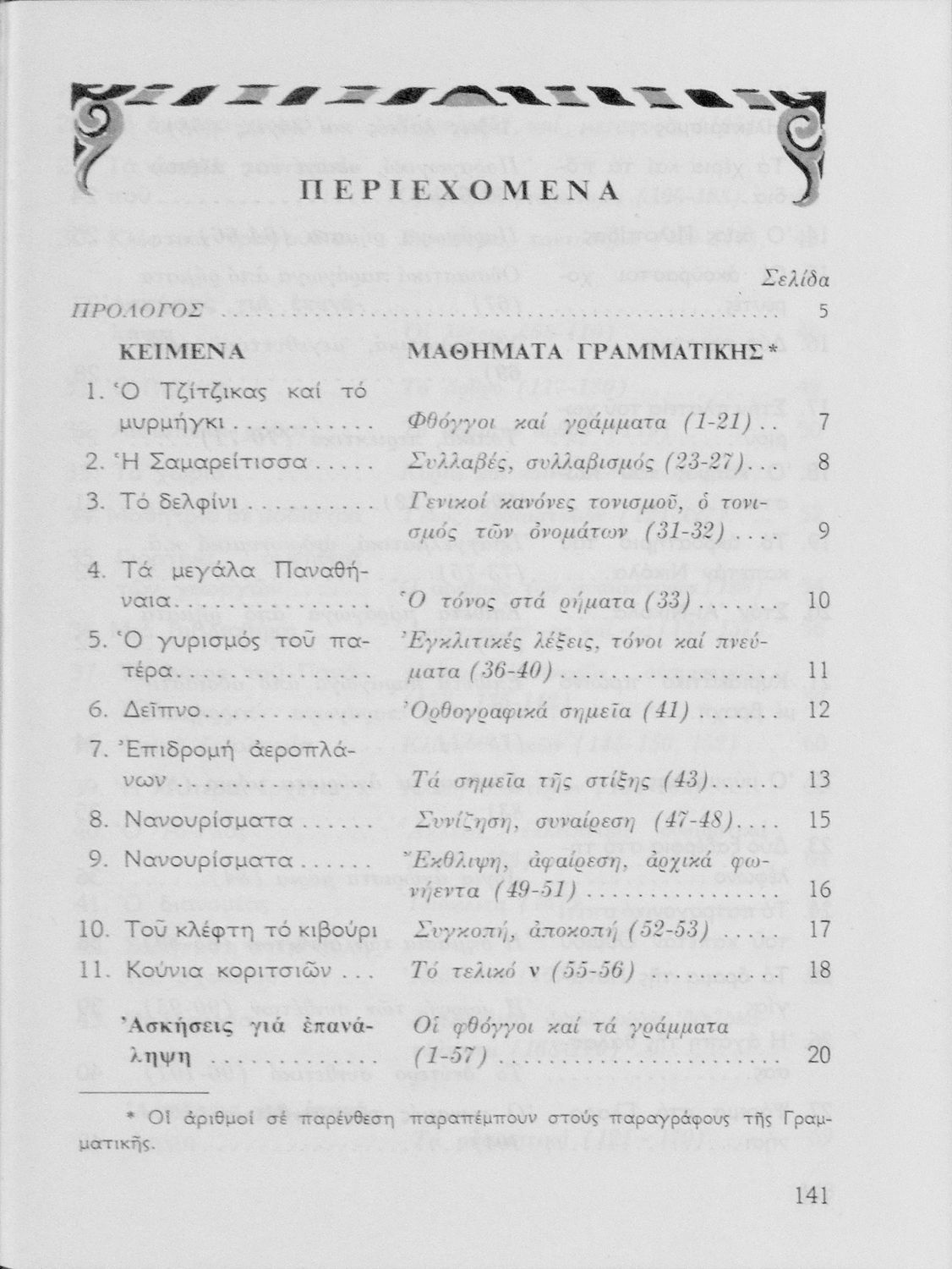 Γραμματικής Νέων Ελληνικών για τις τάξεις του Δημοτικού. Στο βιβλίο παρουσιάζονται οι βασικοί κανόνες γραμματικής και συντακτικού της ελληνικής γλώσσας.