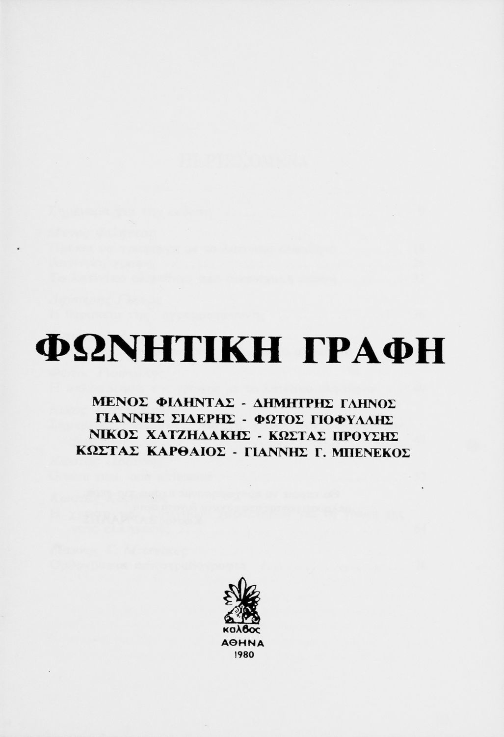 Κωδικός αναγνώρισης: 05-00153 Τίτλος: Φωνητική γραφή Συγγραφέας: Μ. Φιλήντας, Δ. Γληνός, Γ. Σιδέρης, Φ. Γιοφύλλης, Ν. Χατζηδάκης, Κ. Προύσης, Κ. Καρθαίος, Γ. Μπενέκος Μέγεθος και υπόστρωμα: Άλλο, μαλακό εξώφυλλο, 94 σελίδες. Σκίτσα (ασπρόμαυρα). |