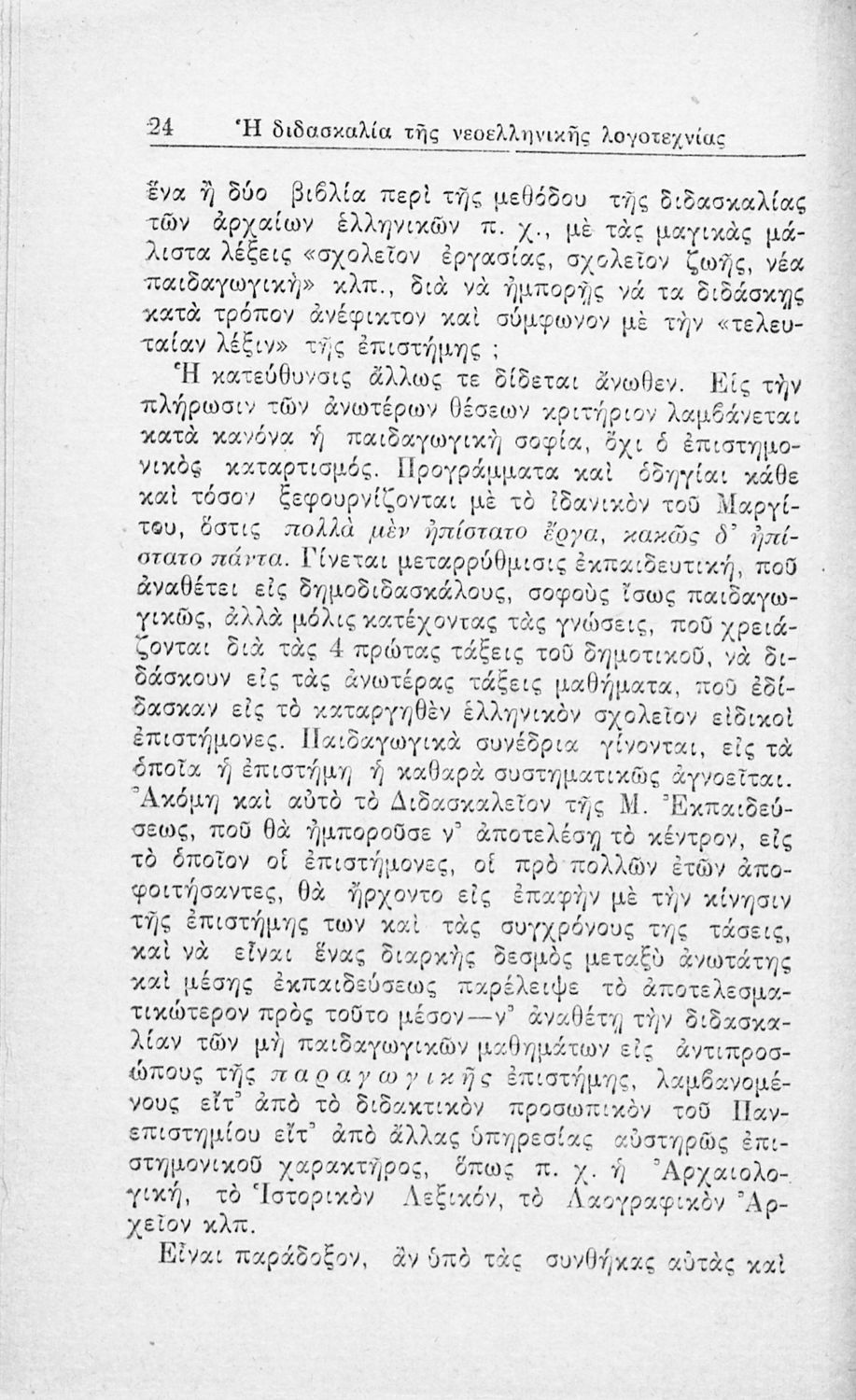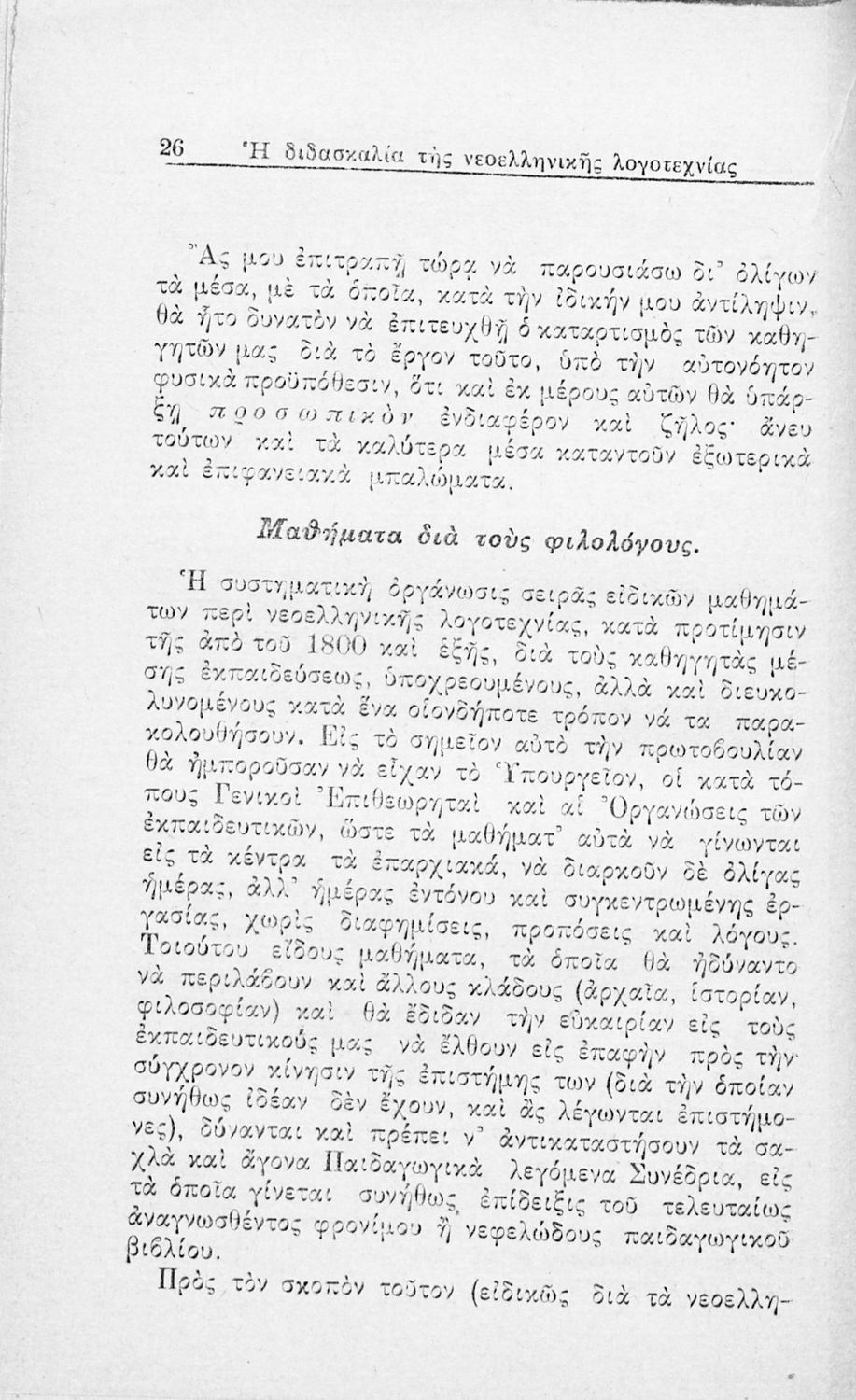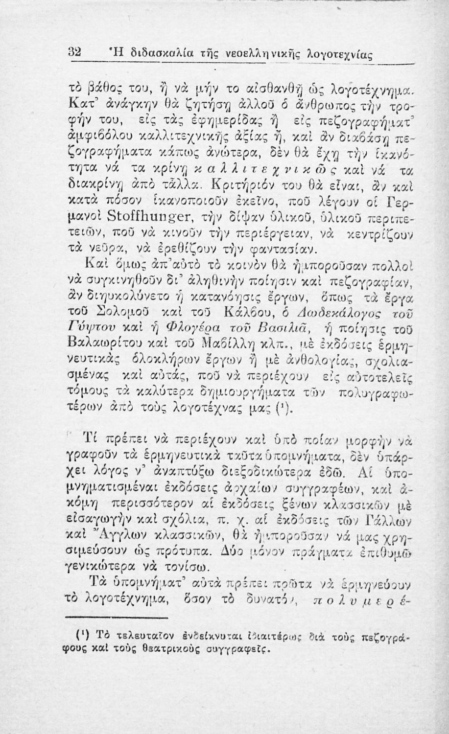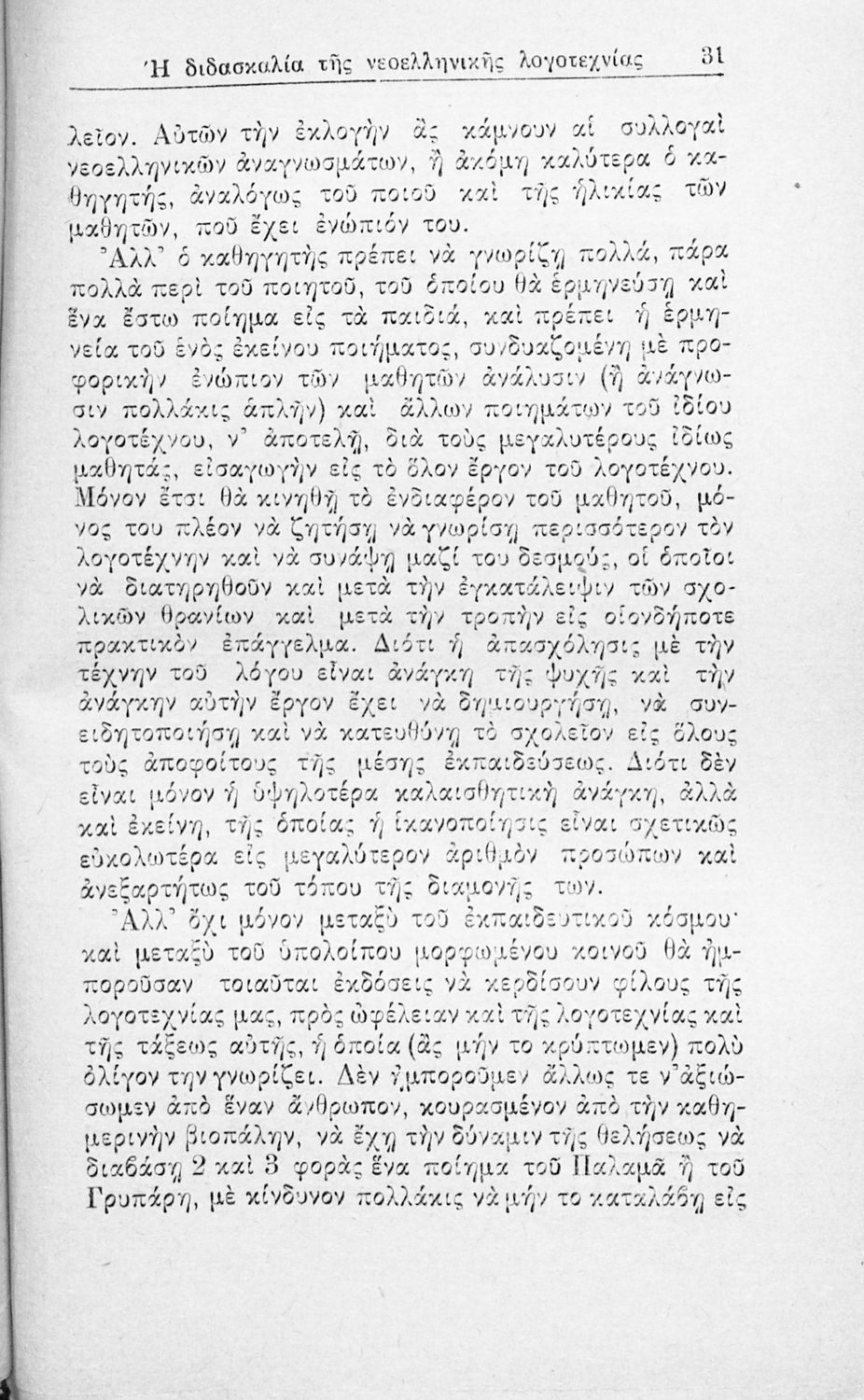 Μάθημα: Νέα Ελληνικά Γλώσσα: Καθαρεύουσα Παρουσίαση περιεχομένου: Ανάτυπο άρθρου που πρωτοδημοσιεύτηκε στην Νέα Εστία και πραγματεύεται τα προβλήματα που είχαν προκύψει, τόσο στην Τριτοβάθμια όσο και στη Δευτεροβάθμια Εκπαίδευση, από την ελλιπή μελέτη της νεοελληνικής λογοτεχνίας. Προτείνει τη συγγραφή παιδαγωγικών βοηθημάτων για τους εκπαιδευτικούς. Ο συγγραφέας ήταν υφηγητής στο Πανεπιστήμιο Αθηνών. |