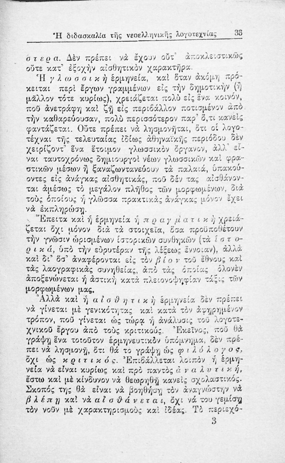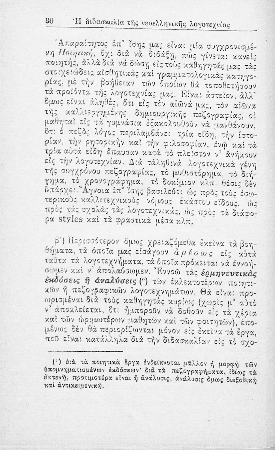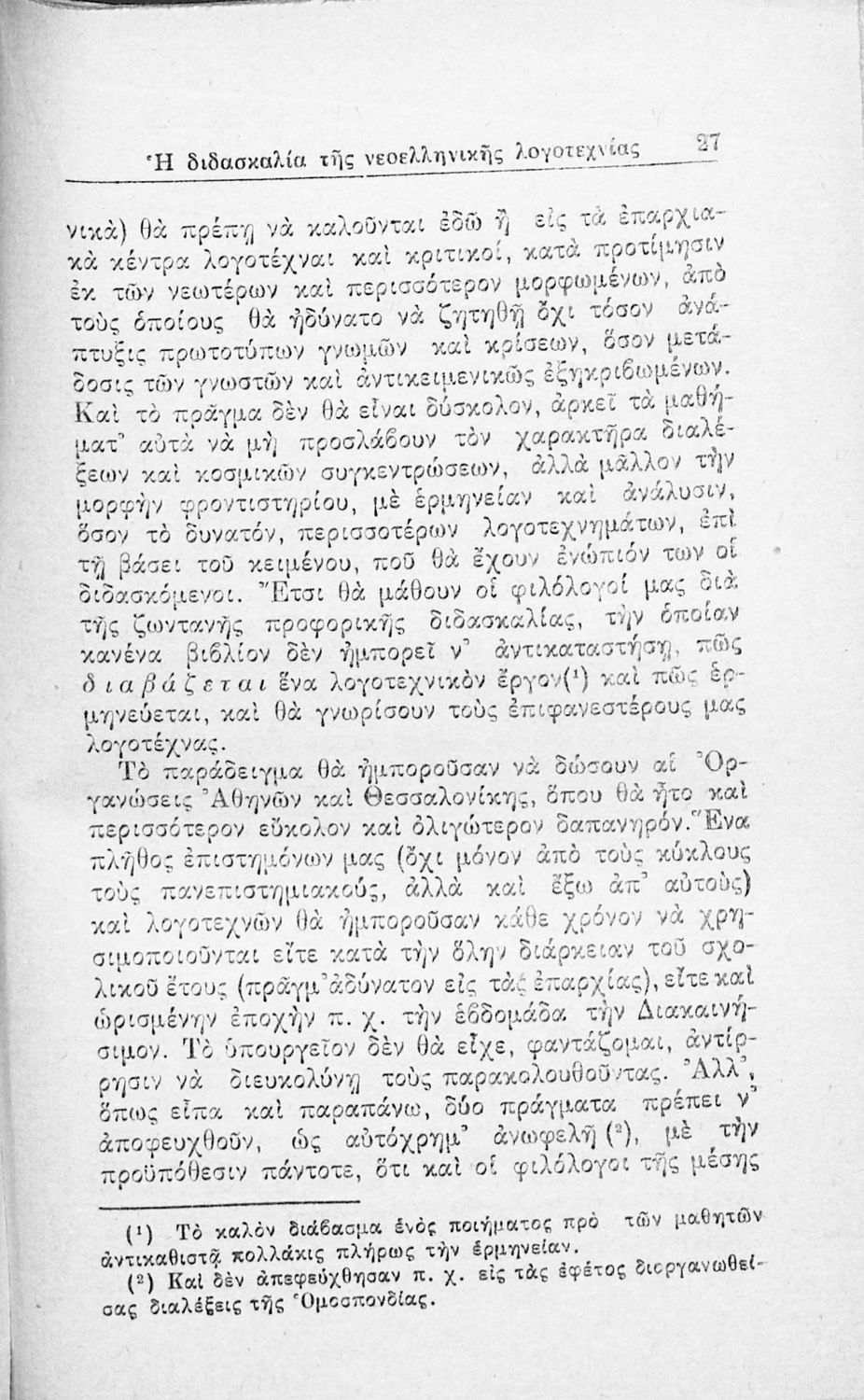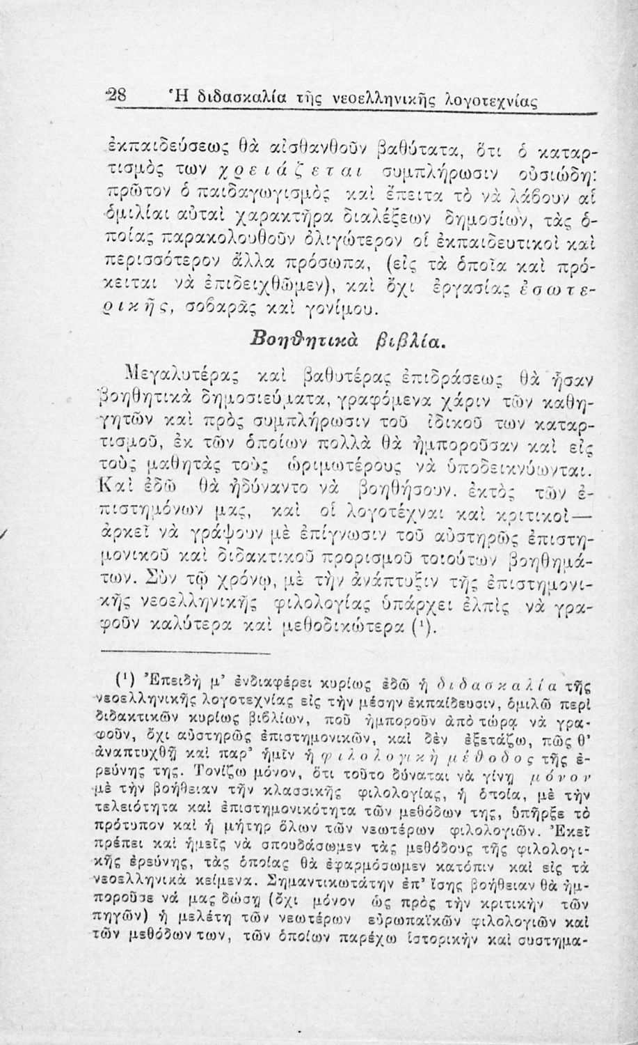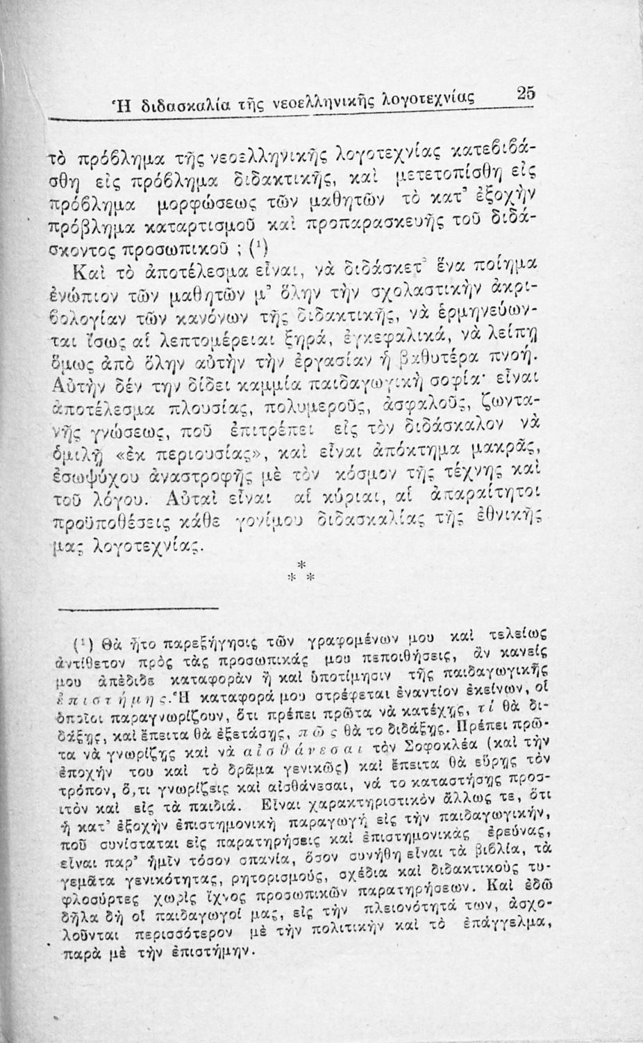 Ανάτυπο άρθρου που πρωτοδημοσιεύτηκε στην Νέα Εστία και πραγματεύεται τα προβλήματα που είχαν προκύψει, τόσο στην Τριτοβάθμια όσο και στη Δευτεροβάθμια Εκπαίδευση, από την ελλιπή μελέτη της νεοελληνικής λογοτεχνίας. Προτείνει τη συγγραφή παιδαγωγικών βοηθημάτων για τους εκπαιδευτικούς. Ο συγγραφέας ήταν υφηγητής στο Πανεπιστήμιο Αθηνών.