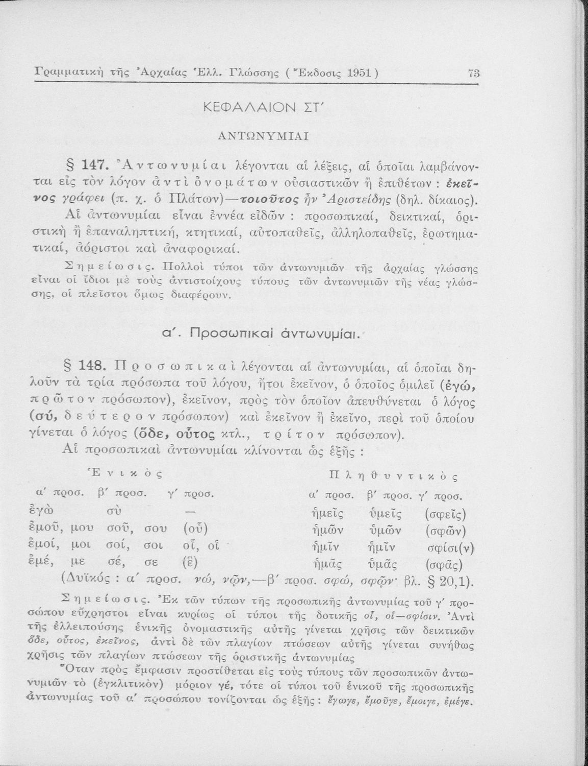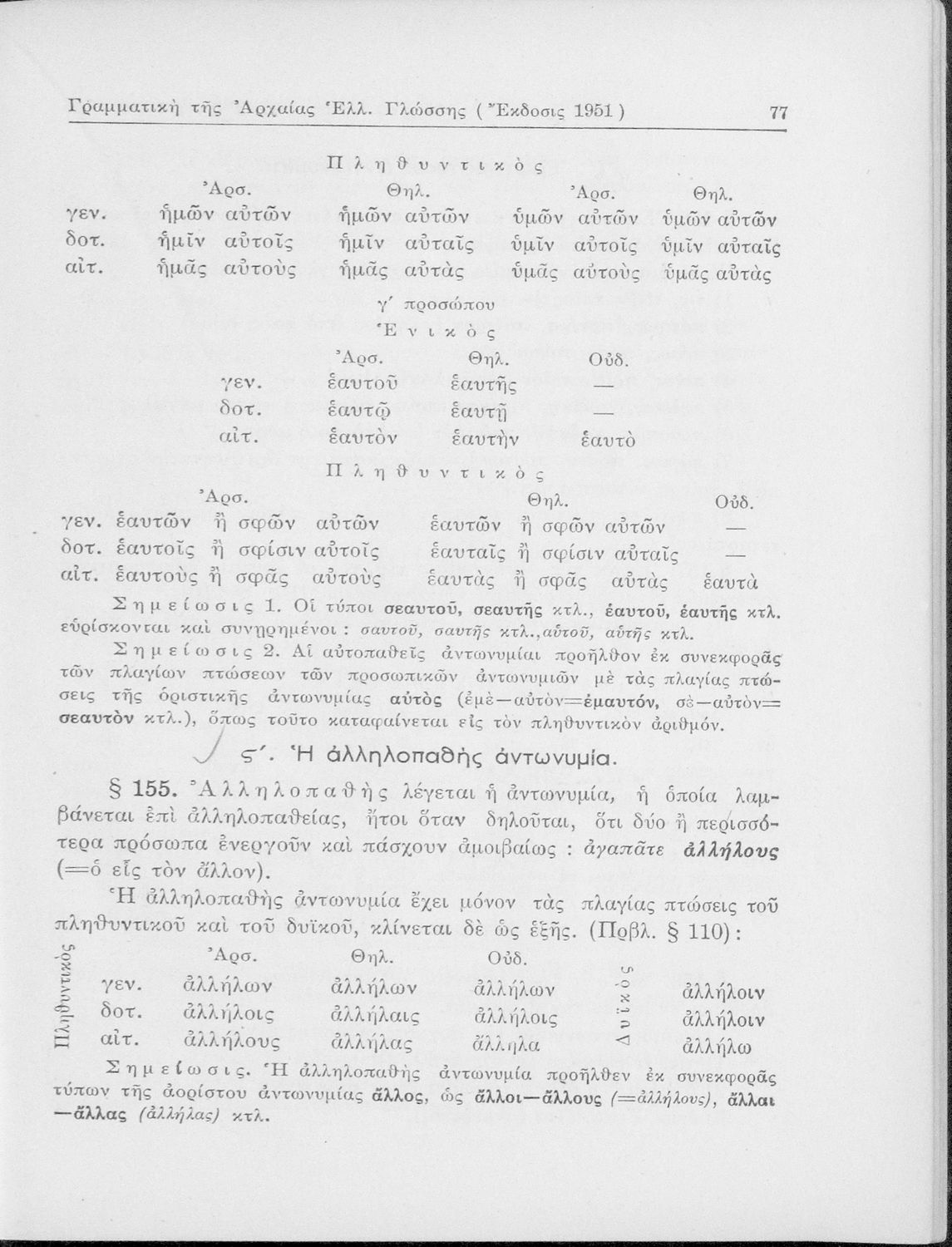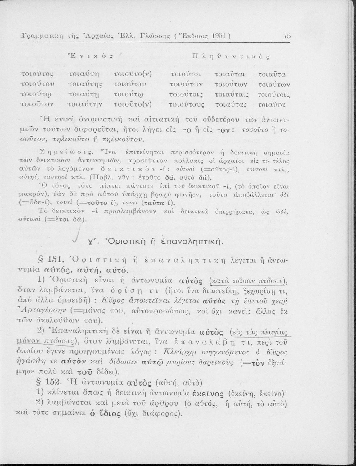 Σχολικό εγχειρίδιο Αρχαίων Ελληνικών Γυμνασίου που περιέχει τους κανόνες γραμματικής και είναι χωρισμένο σε φθογγολογικό, τυπολογικό και ετυμολογικό μέρος. Περιέχει και κατάλογο ανωμάλων ρημάτων.