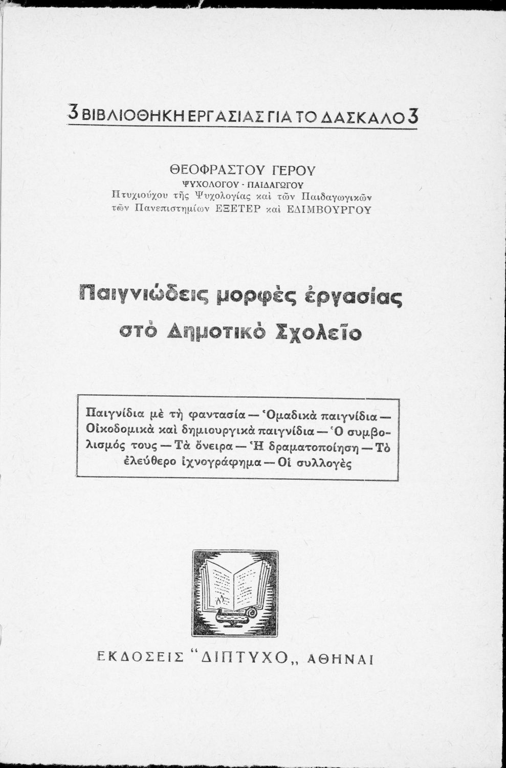 Κωδικός αναγνώρισης: 05-00159 Τίτλος: Παιγνιώδεις μορφές εργασίας στο Δημοτικό Σχολείο Συγγραφέας: Θεόφραστος Γέρος Μέγεθος και υπόστρωμα: Παιδαγωγικό βοήθημα, μαλακό εξώφυλλο, 96 σελίδες. Σκίτσα (ασπρόμαυρα). |