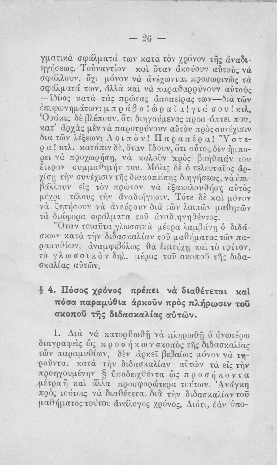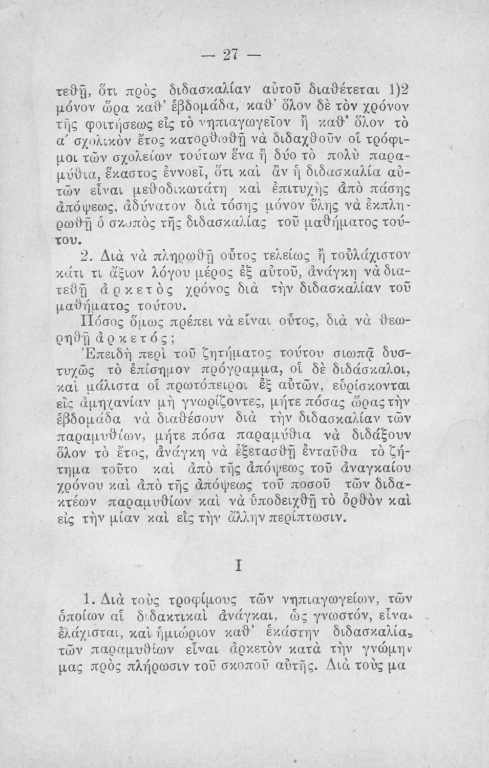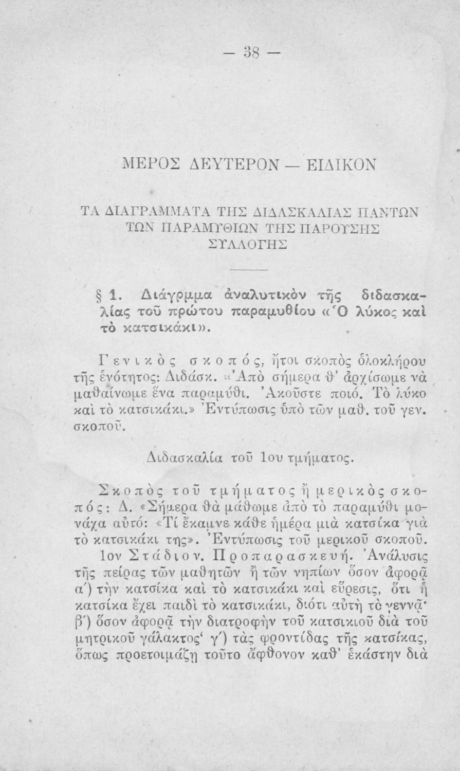 Βαθμίδα εκπαίδευσης: Πρωτοβάθμια Γλώσσα: Καθαρεύουσα Παρουσίαση περιεχομένου: Παιδαγωγικό βοήθημα το οποίο σκοπό είχε τη θεωρητική και πρακτική προετοιμασία των δασκάλων στη διδασκαλία των παραμυθιών στο Νηπιαγωγείο και το Δημοτικό. |