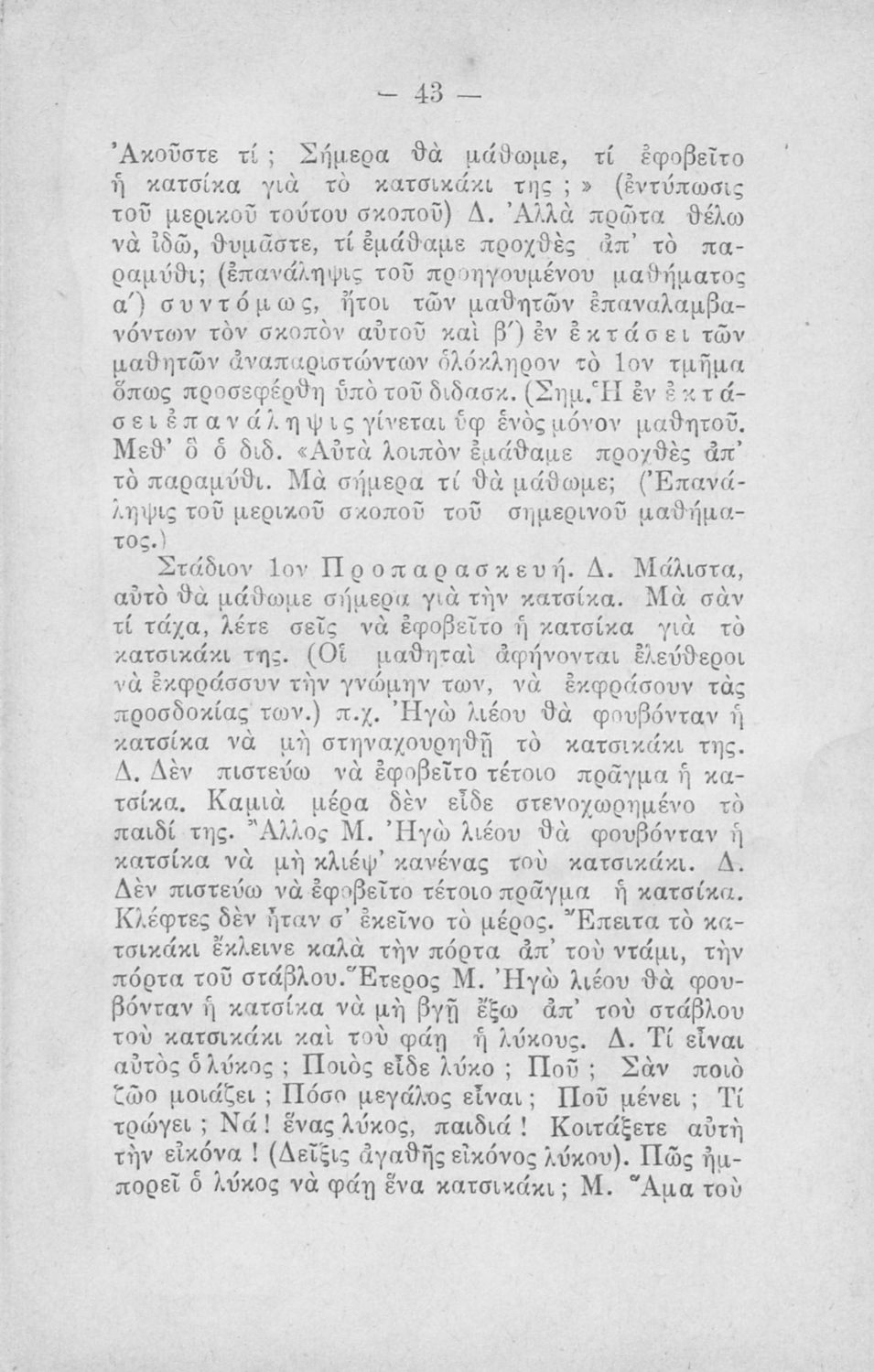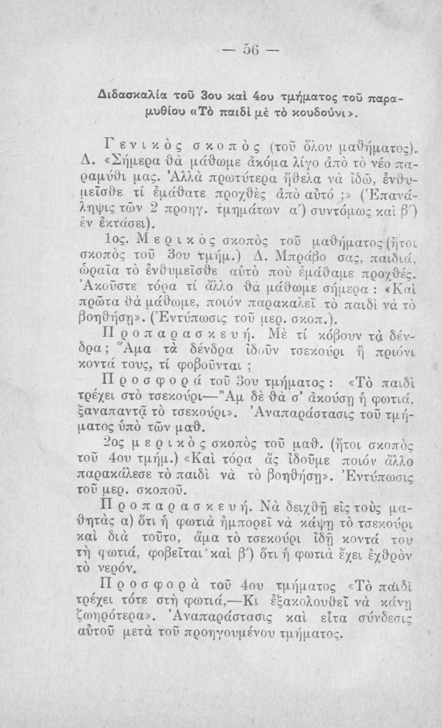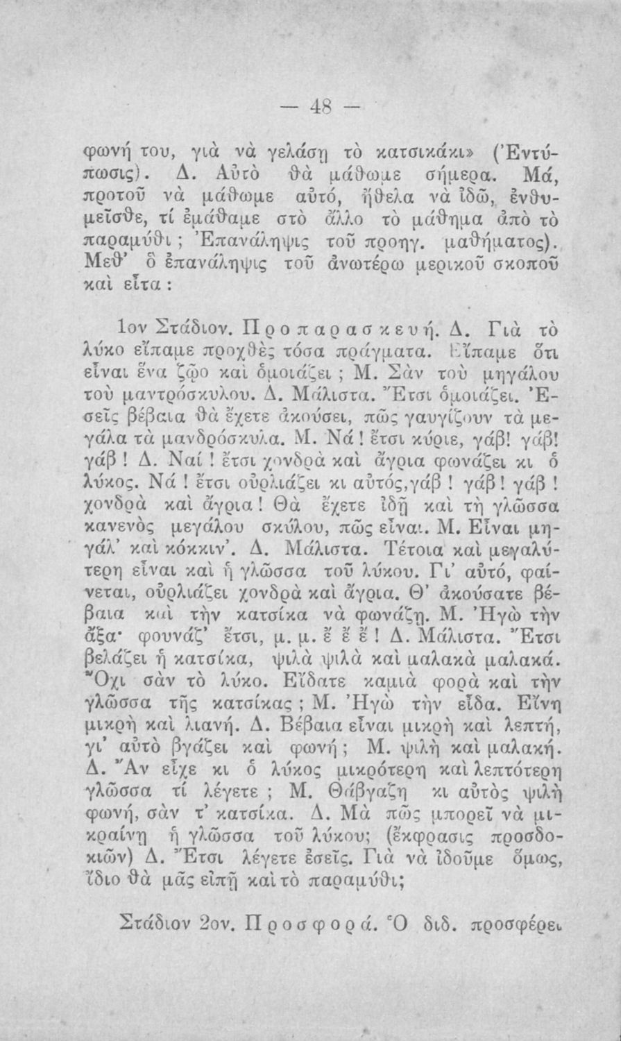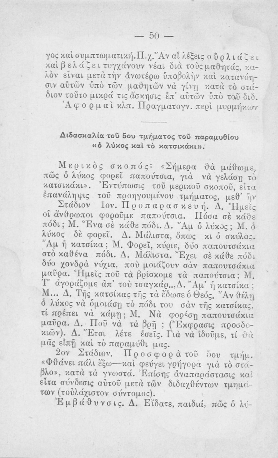Βαθμίδα εκπαίδευσης: Πρωτοβάθμια Γλώσσα: Καθαρεύουσα Παρουσίαση περιεχομένου: Παιδαγωγικό βοήθημα το οποίο σκοπό είχε τη θεωρητική και πρακτική προετοιμασία των δασκάλων στη διδασκαλία των παραμυθιών στο Νηπιαγωγείο και το Δημοτικό. |