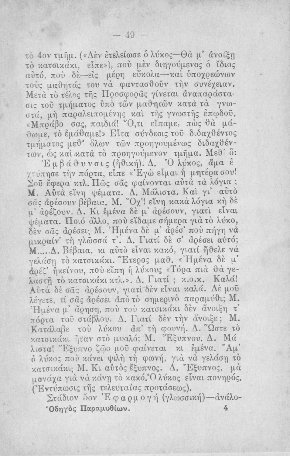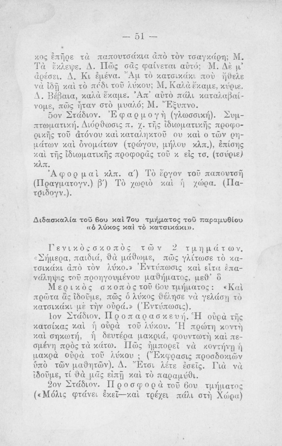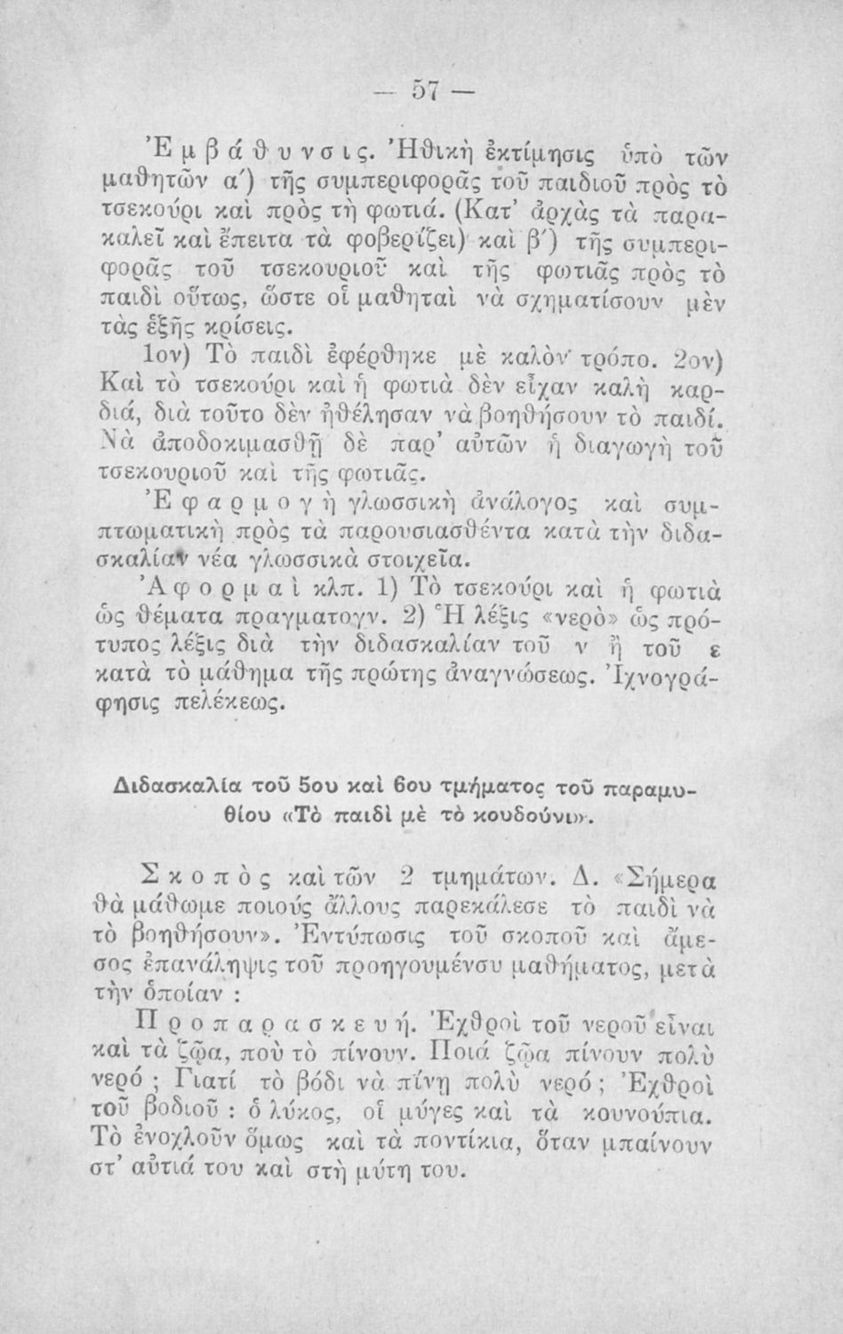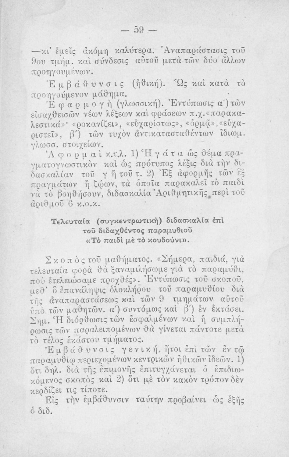 Βαθμίδα εκπαίδευσης: Πρωτοβάθμια Γλώσσα: Καθαρεύουσα Παρουσίαση περιεχομένου: Παιδαγωγικό βοήθημα το οποίο σκοπό είχε τη θεωρητική και πρακτική προετοιμασία των δασκάλων στη διδασκαλία των παραμυθιών στο Νηπιαγωγείο και το Δημοτικό. |