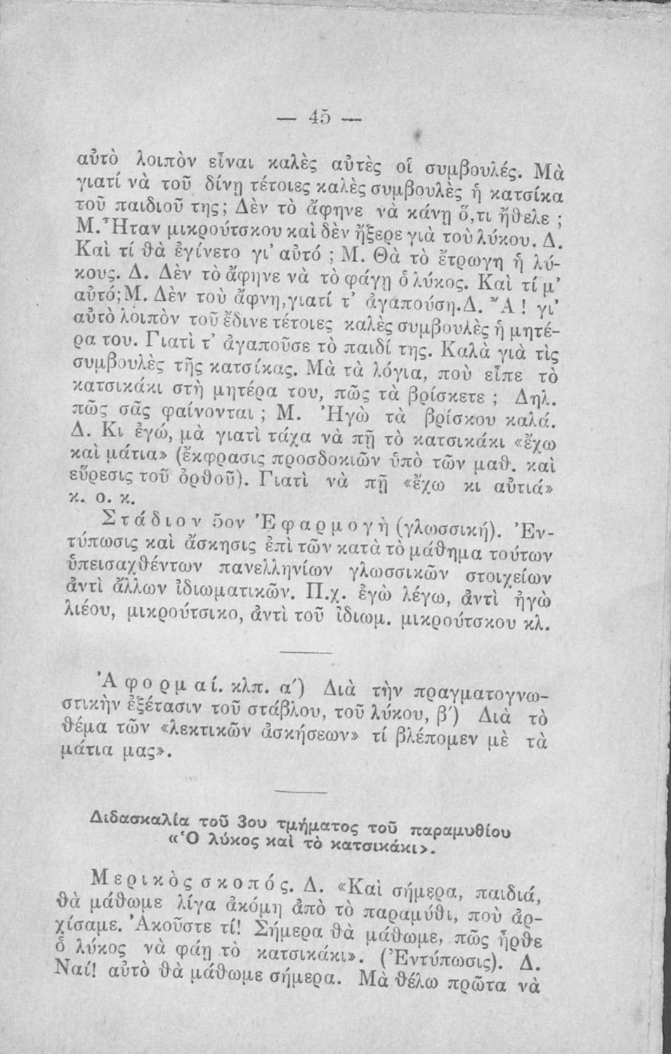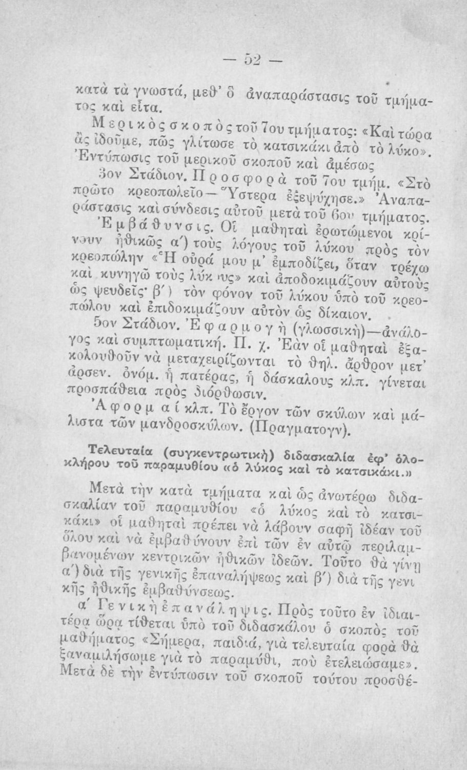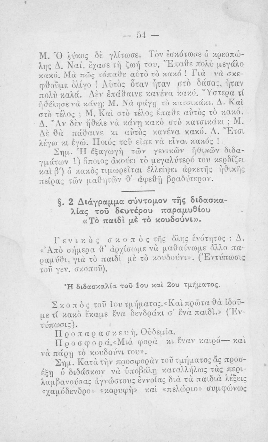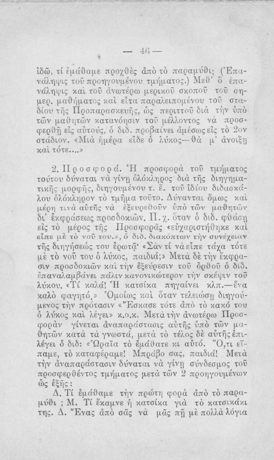 Βαθμίδα εκπαίδευσης: Πρωτοβάθμια Γλώσσα: Καθαρεύουσα Παρουσίαση περιεχομένου: Παιδαγωγικό βοήθημα το οποίο σκοπό είχε τη θεωρητική και πρακτική προετοιμασία των δασκάλων στη διδασκαλία των παραμυθιών στο Νηπιαγωγείο και το Δημοτικό. |