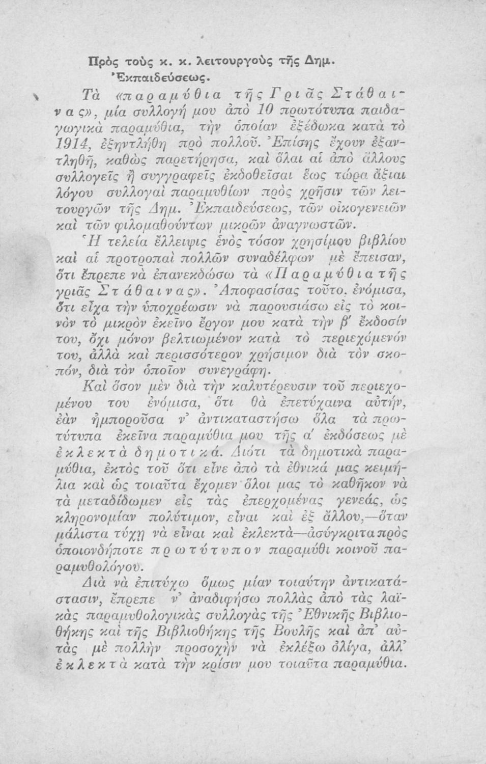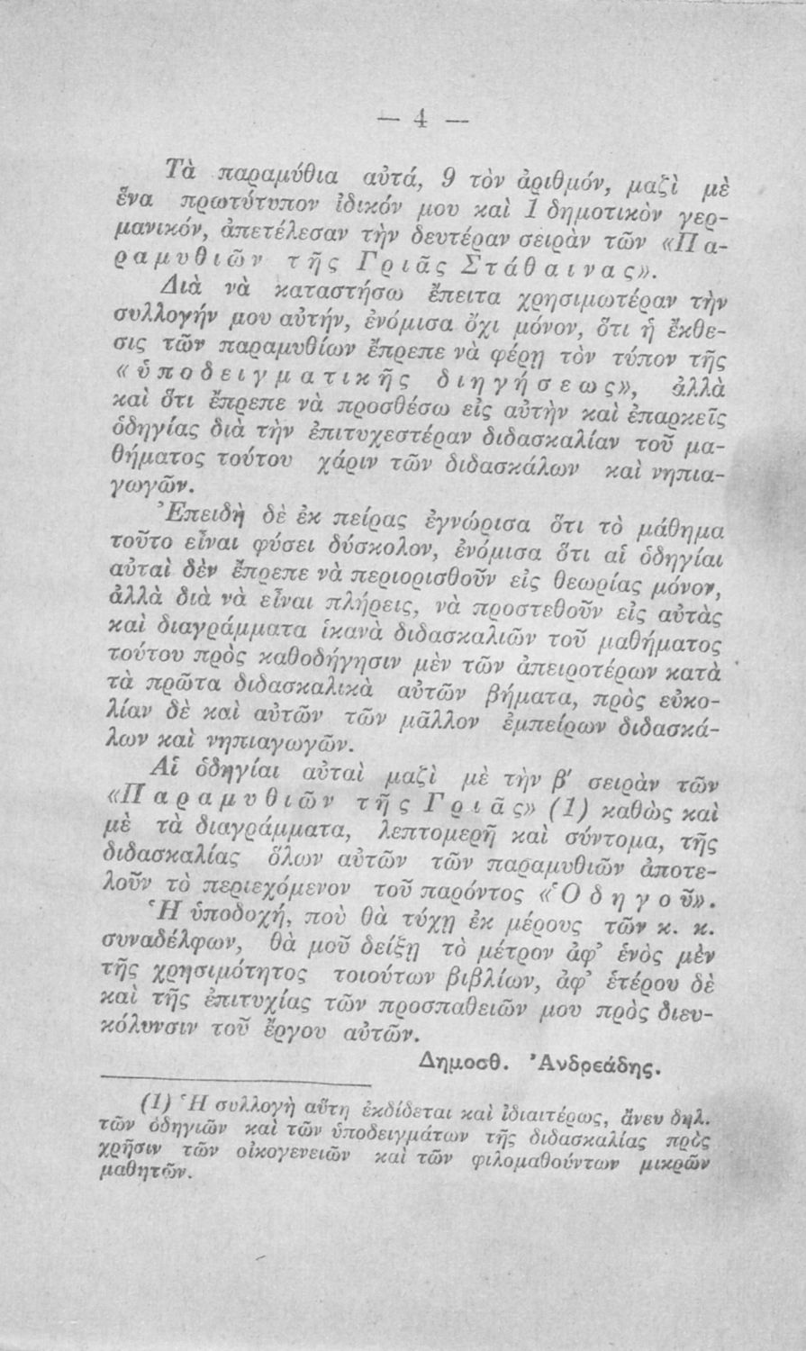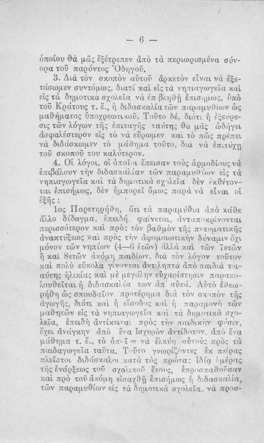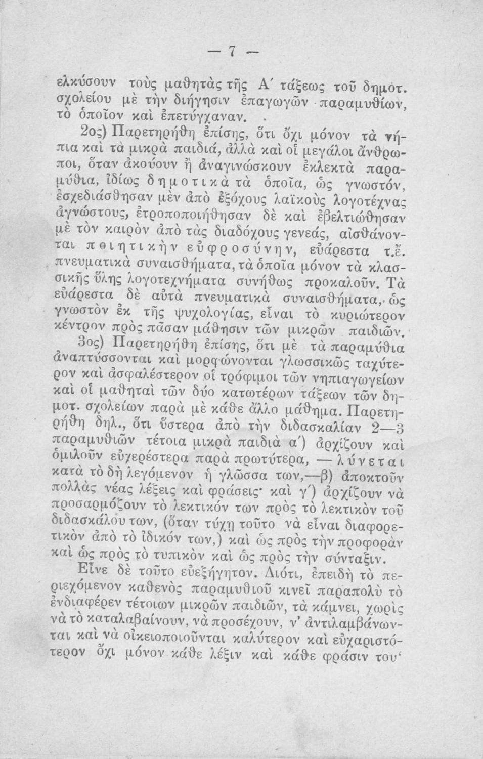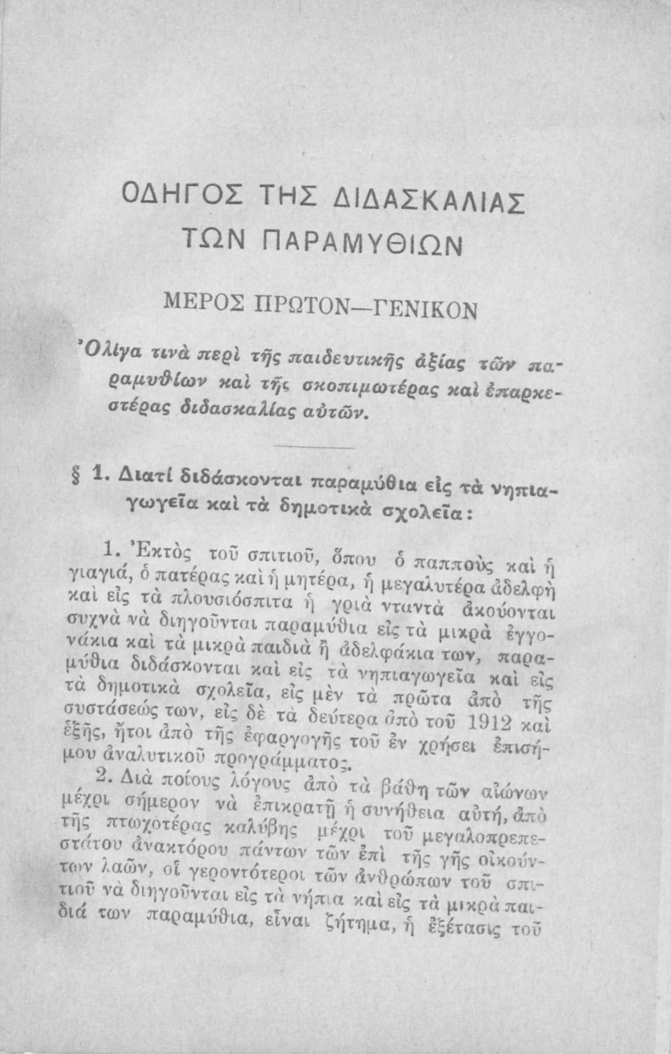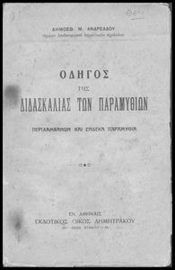 Βαθμίδα εκπαίδευσης: Πρωτοβάθμια Γλώσσα: Καθαρεύουσα Παρουσίαση περιεχομένου: Παιδαγωγικό βοήθημα το οποίο σκοπό είχε τη θεωρητική και πρακτική προετοιμασία των δασκάλων στη διδασκαλία των παραμυθιών στο Νηπιαγωγείο και το Δημοτικό. |