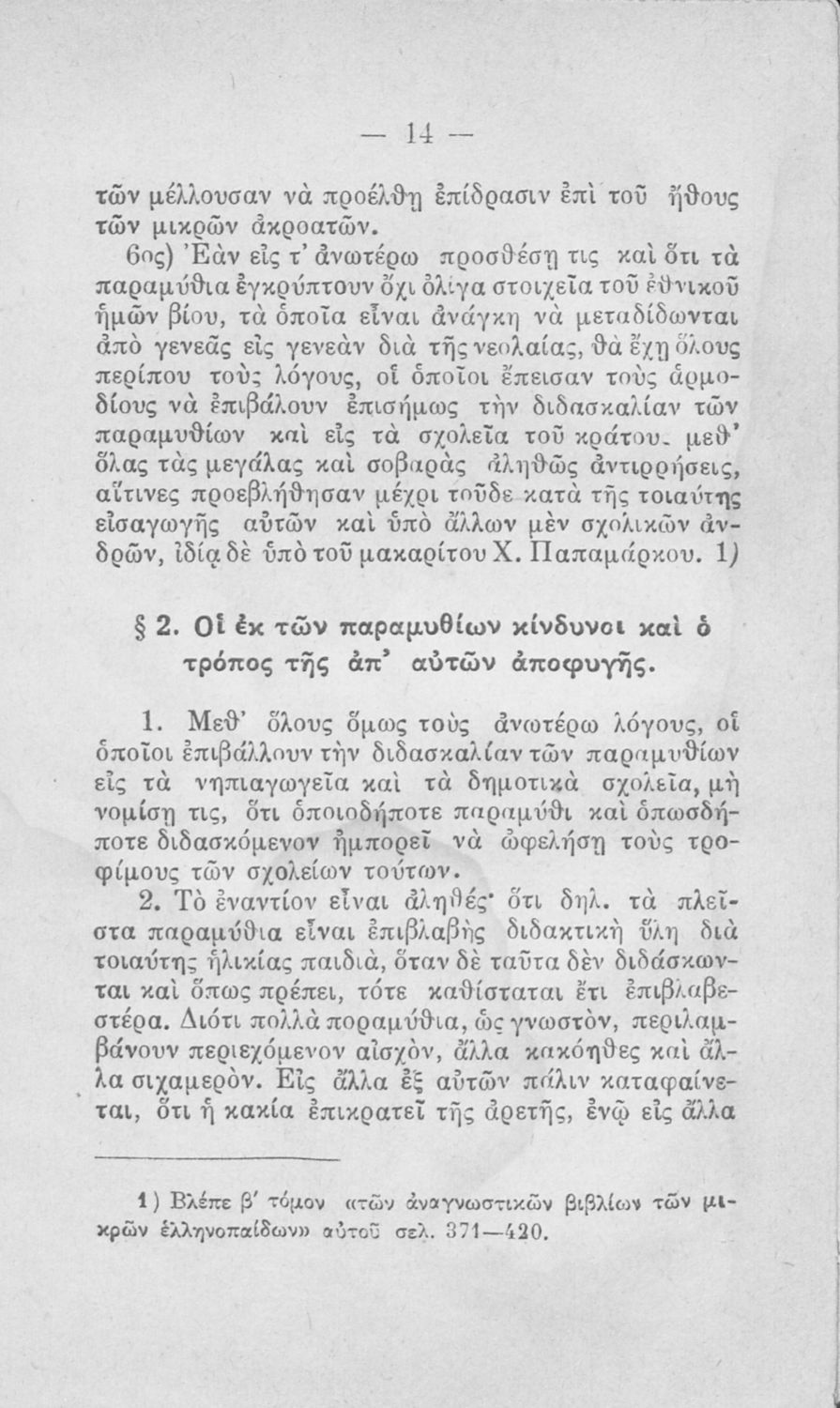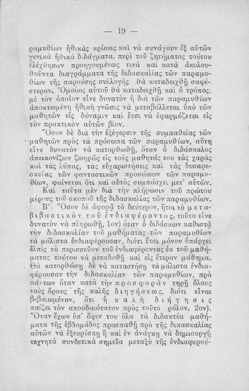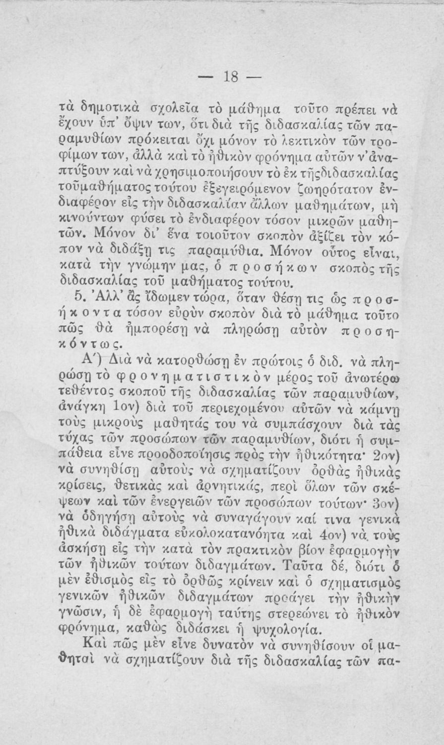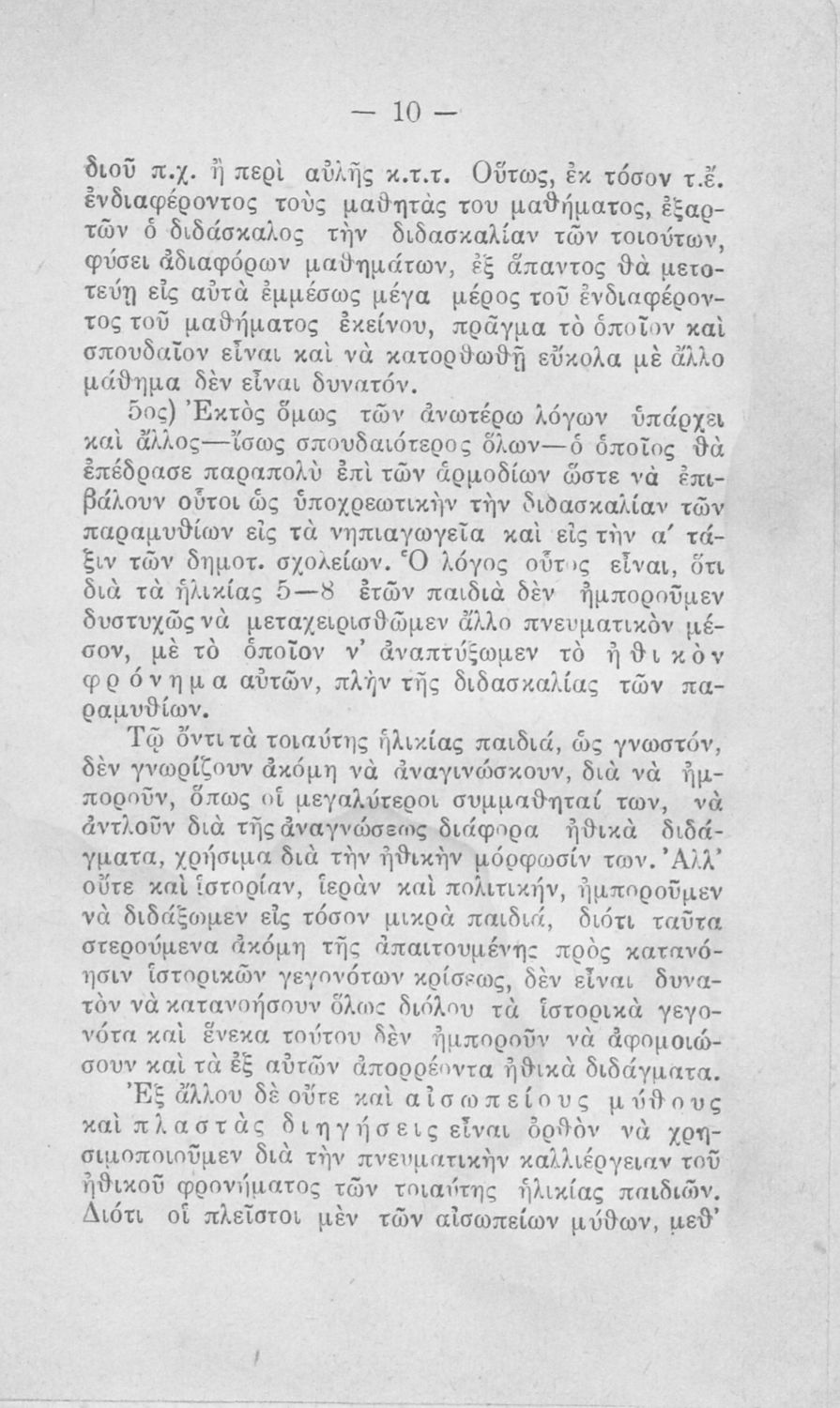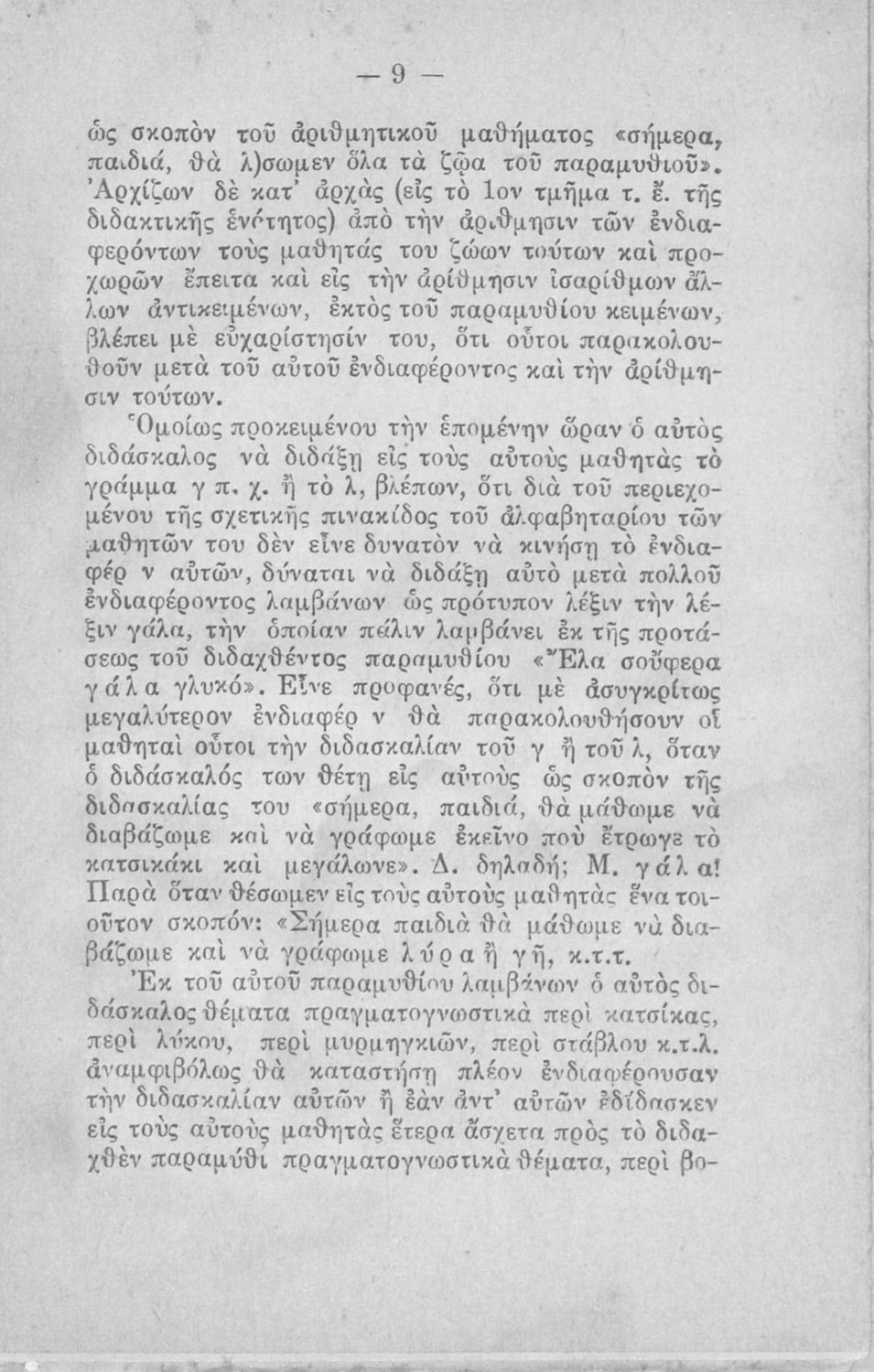 Βαθμίδα εκπαίδευσης: Πρωτοβάθμια Γλώσσα: Καθαρεύουσα Παρουσίαση περιεχομένου: Παιδαγωγικό βοήθημα το οποίο σκοπό είχε τη θεωρητική και πρακτική προετοιμασία των δασκάλων στη διδασκαλία των παραμυθιών στο Νηπιαγωγείο και το Δημοτικό. |