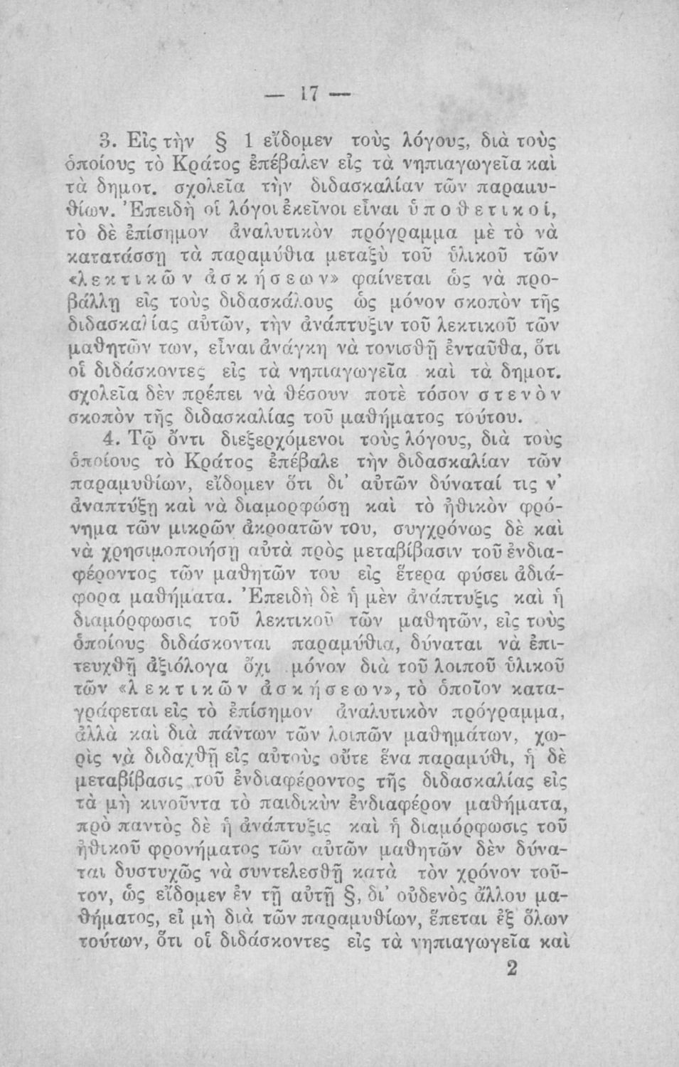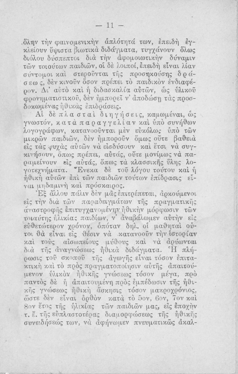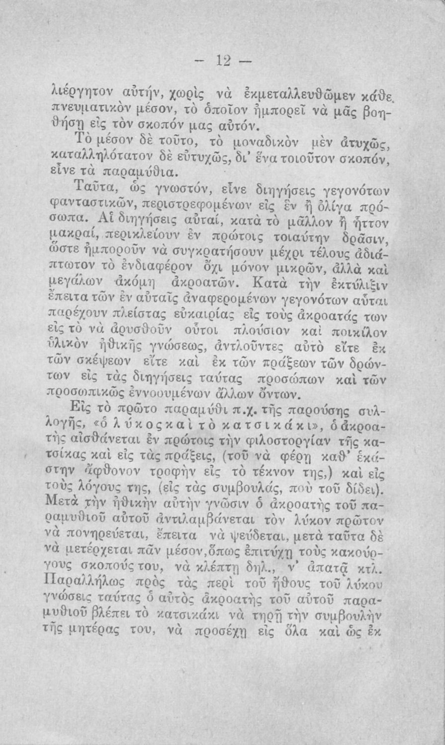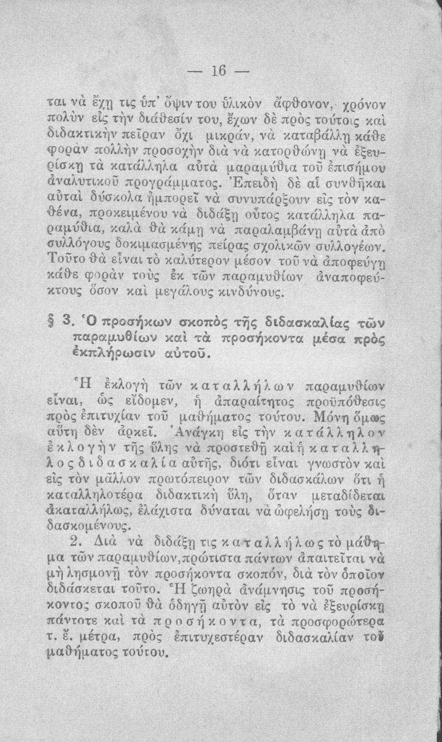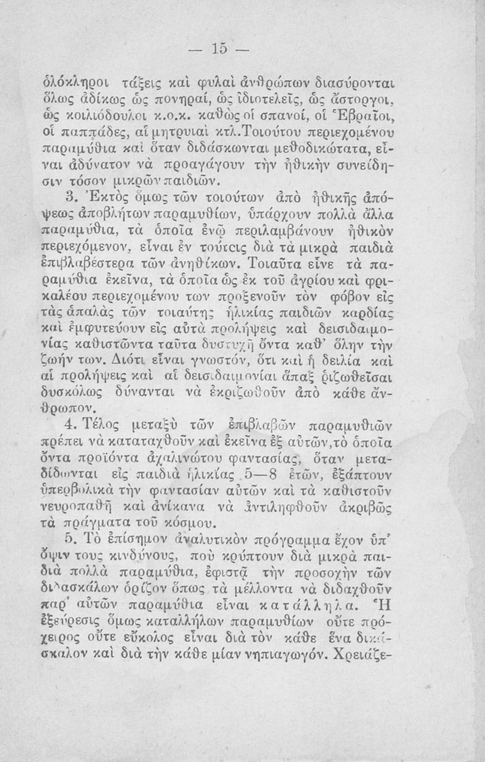 Βαθμίδα εκπαίδευσης: Πρωτοβάθμια Γλώσσα: Καθαρεύουσα Παρουσίαση περιεχομένου: Παιδαγωγικό βοήθημα το οποίο σκοπό είχε τη θεωρητική και πρακτική προετοιμασία των δασκάλων στη διδασκαλία των παραμυθιών στο Νηπιαγωγείο και το Δημοτικό. |