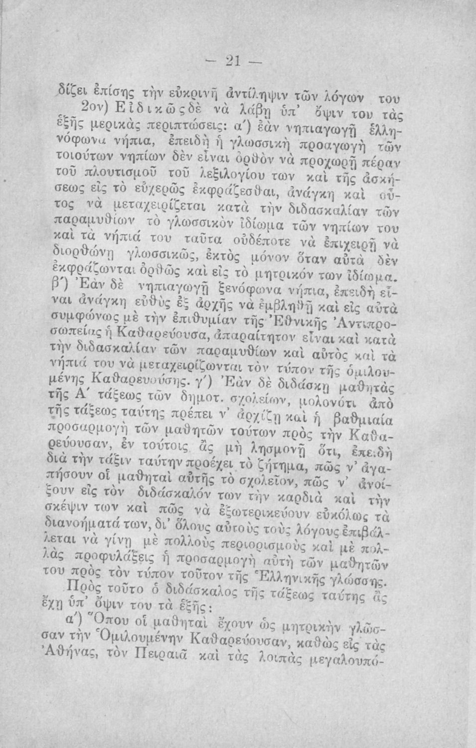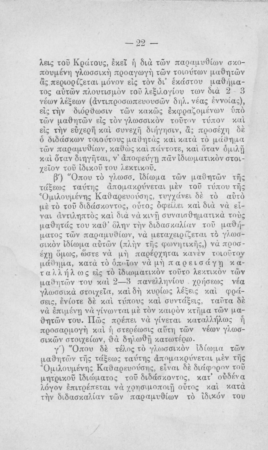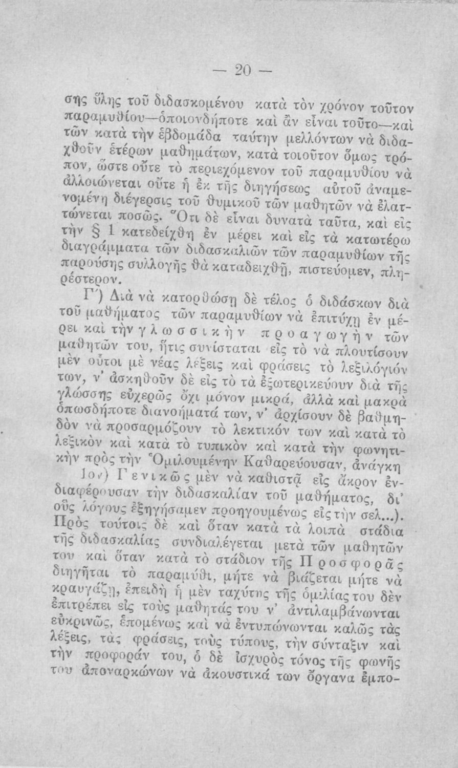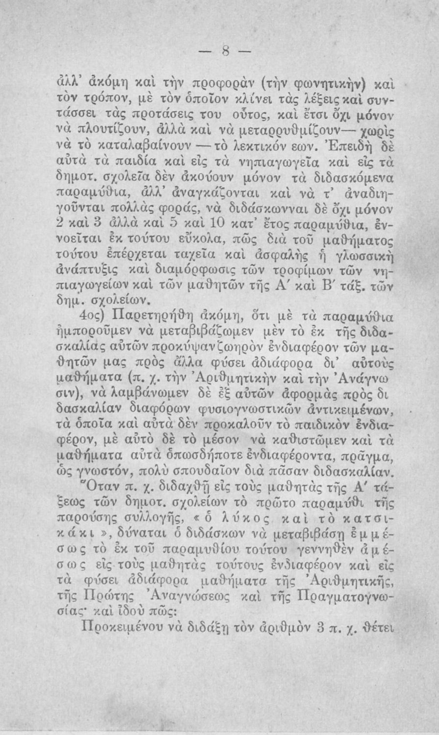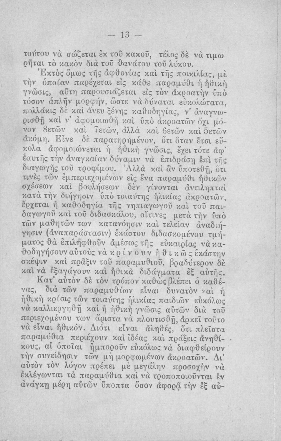 Βαθμίδα εκπαίδευσης: Πρωτοβάθμια Γλώσσα: Καθαρεύουσα Παρουσίαση περιεχομένου: Παιδαγωγικό βοήθημα το οποίο σκοπό είχε τη θεωρητική και πρακτική προετοιμασία των δασκάλων στη διδασκαλία των παραμυθιών στο Νηπιαγωγείο και το Δημοτικό. |
