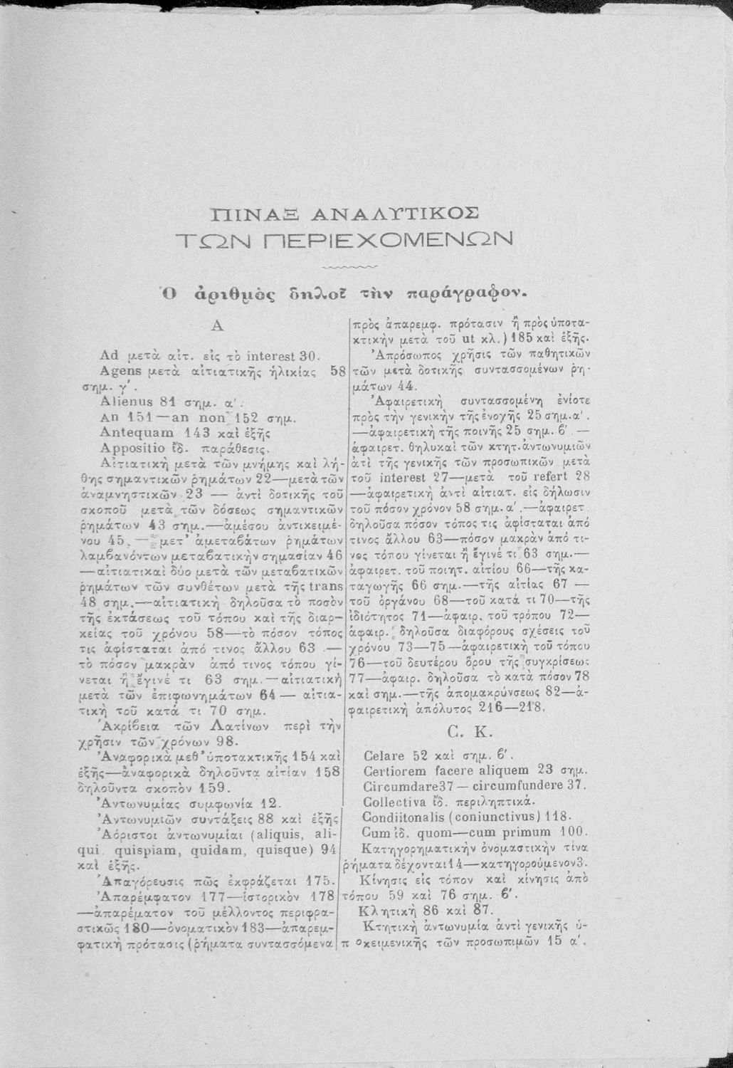 Σχολικό εγχειρίδιο Λατινικών Γυμνασίου που περιλαμβάνει γραμματική και συντακτικό και είναι χωρισμένο σε φθογγολογικό, τυπολογικό και ετυμολογικό μέρος. Ο συγγραφέας ήταν καθηγητής της Λατινικής Φιλολογίας στο