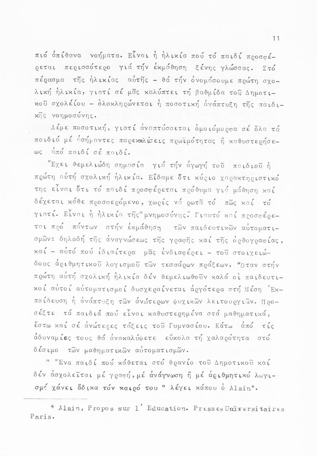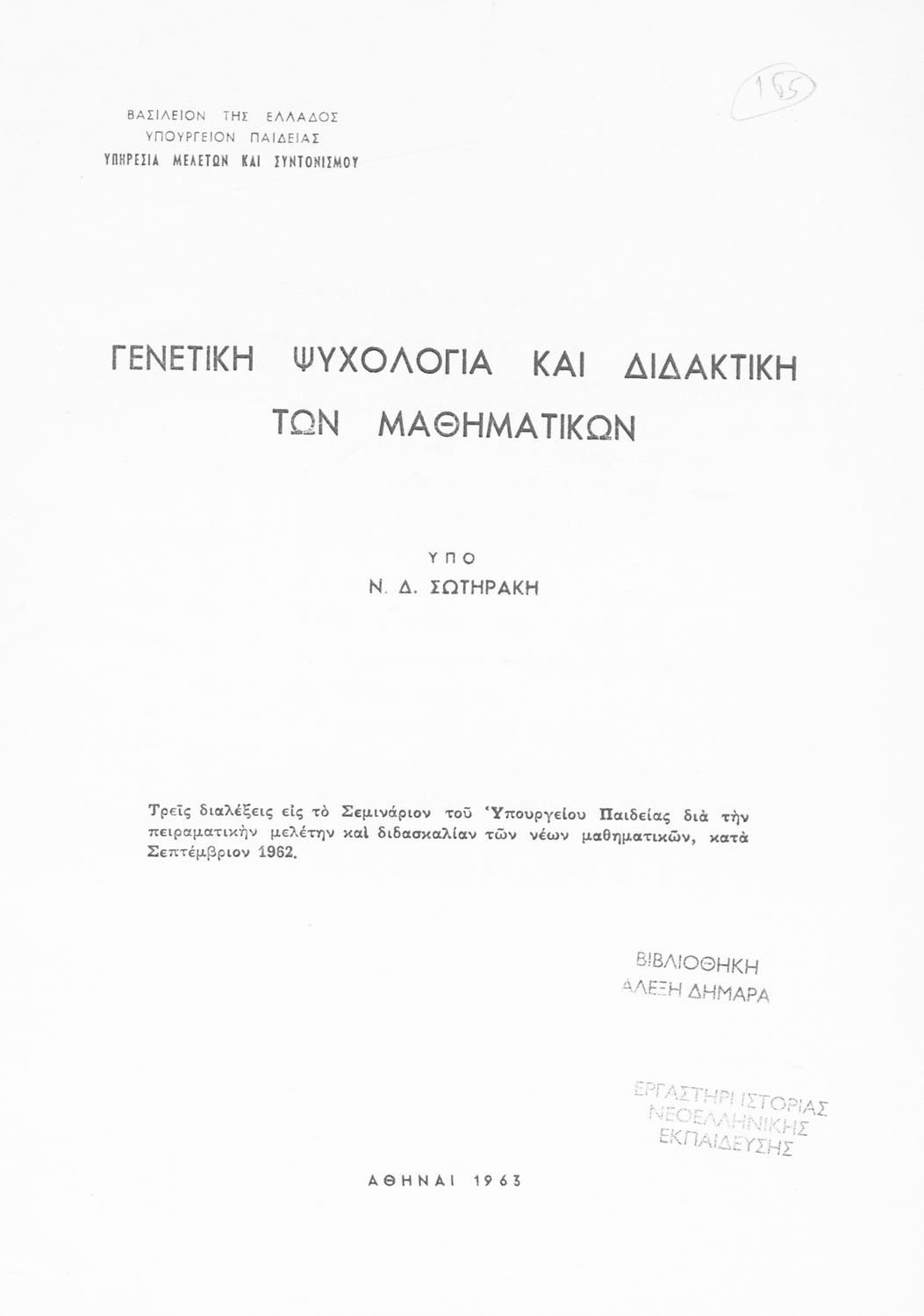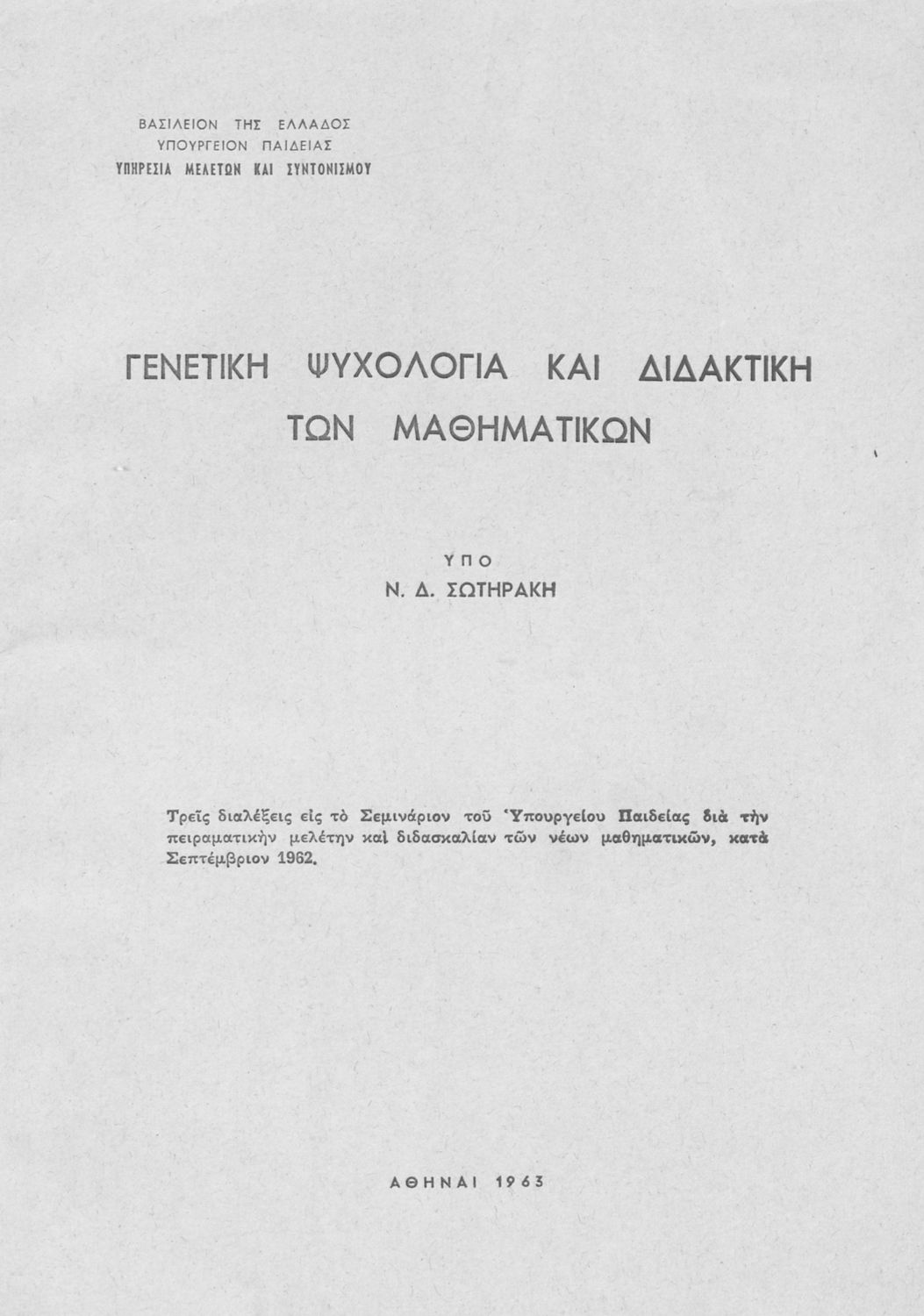 Έκδοση της Υπηρεσίας Μελετών και Συντονισμού του Υπουργείου Παιδείας που περιλαμβάνει τρεις διαλέξεις που παρουσιάστηκαν σε σεμινάριο του Υπουργείου και εστιάζουν στα ψυχολογικά χαρακτηριστικά του εφήβου κατά τη διαδικασία της διδασκαλίας των Μαθηματικών.