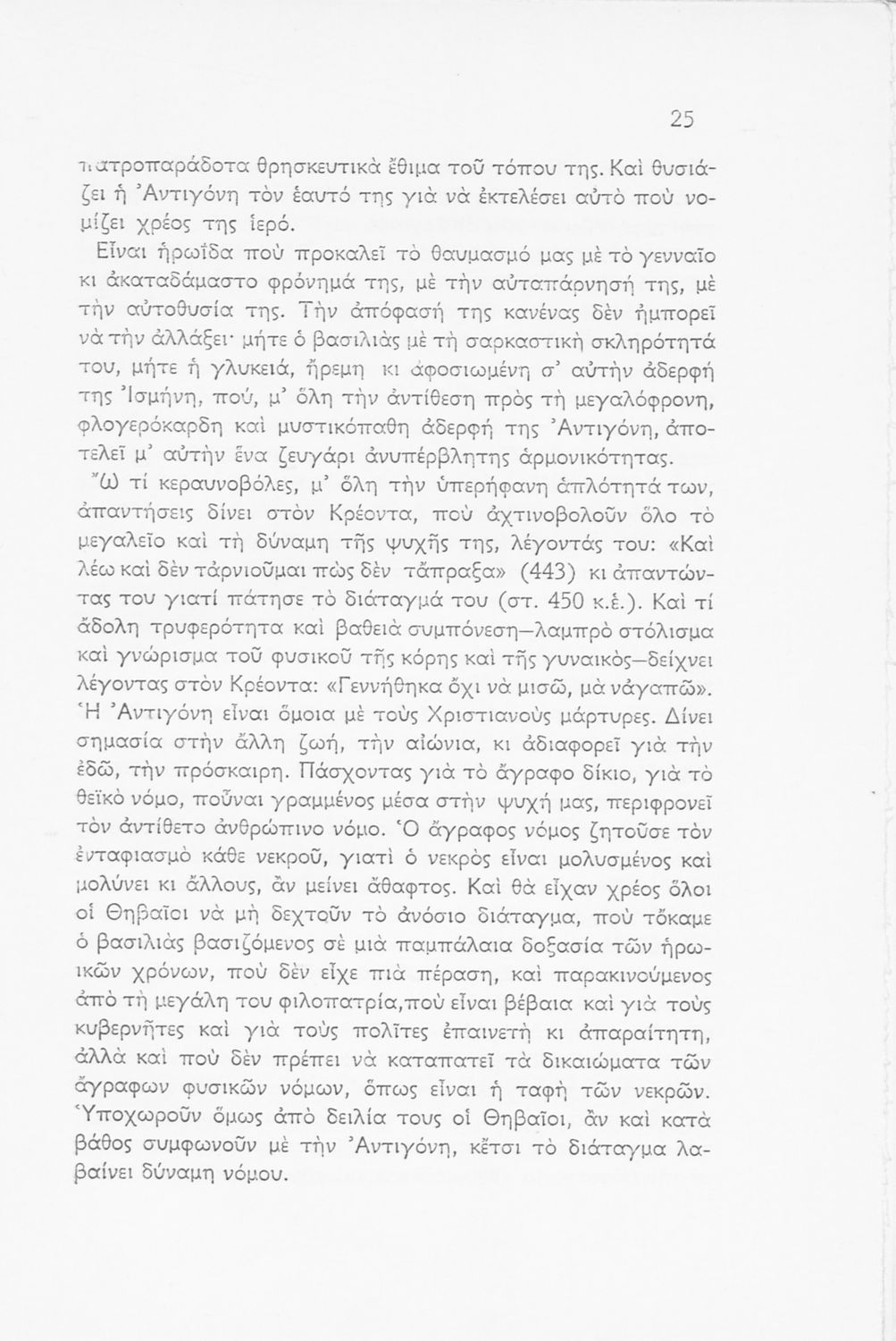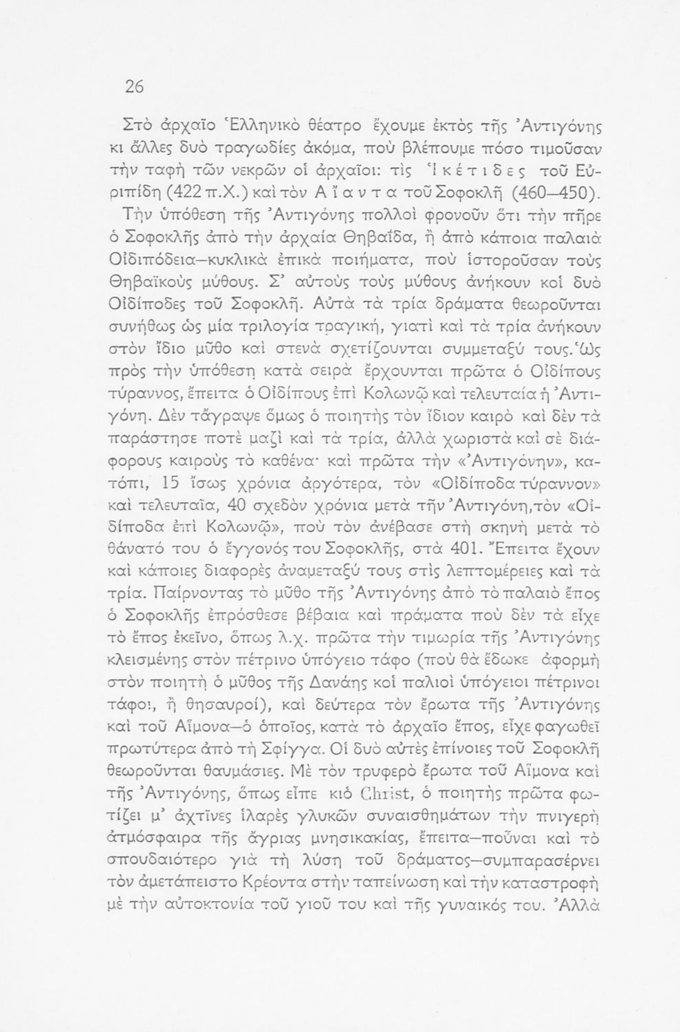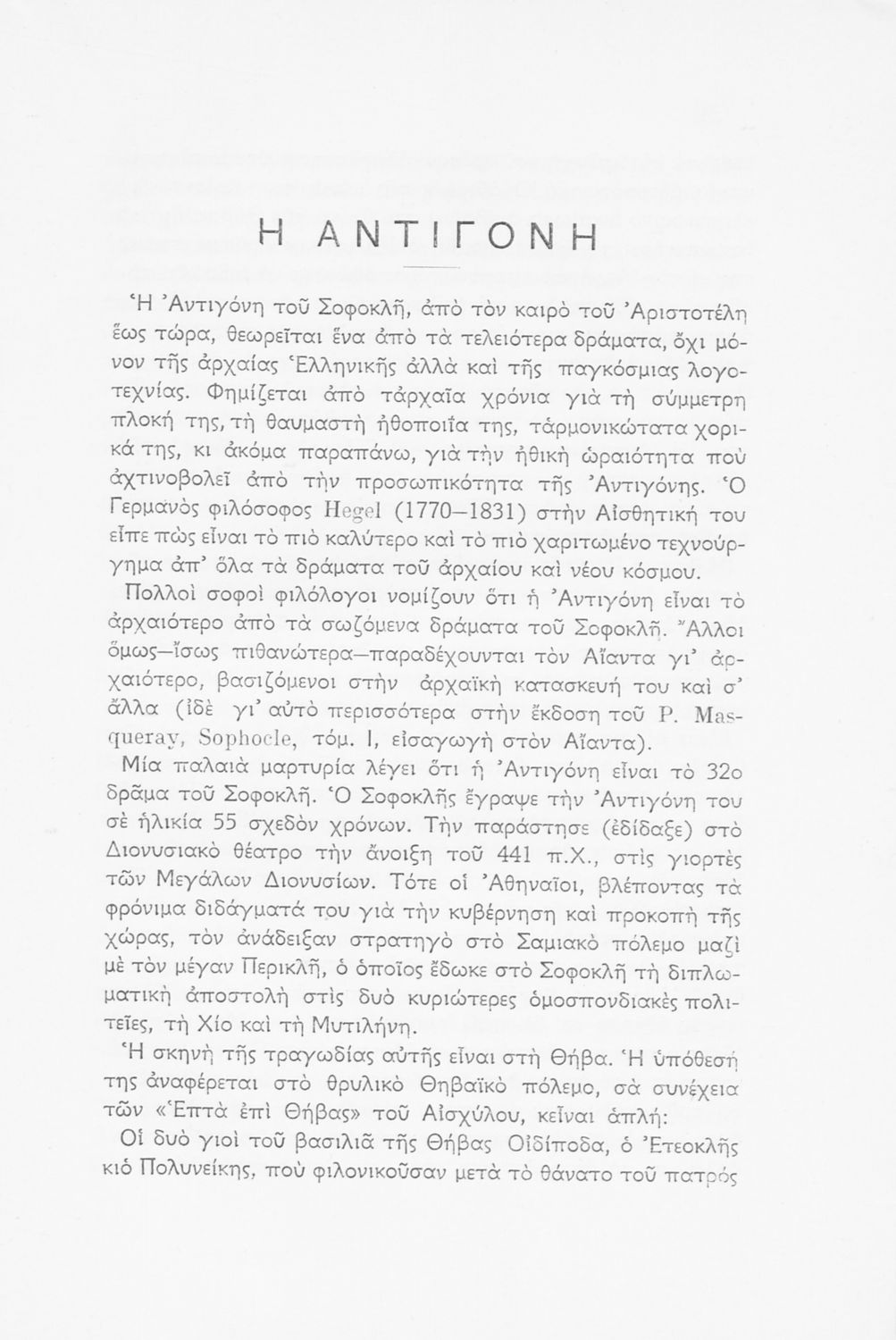 Παρουσίαση περιεχομένου: Μετάφραση της Αντιγόνης του Σοφοκλή στη δημοτική. Συνοδεύεται από ερμηνευτικές σημειώσεις.