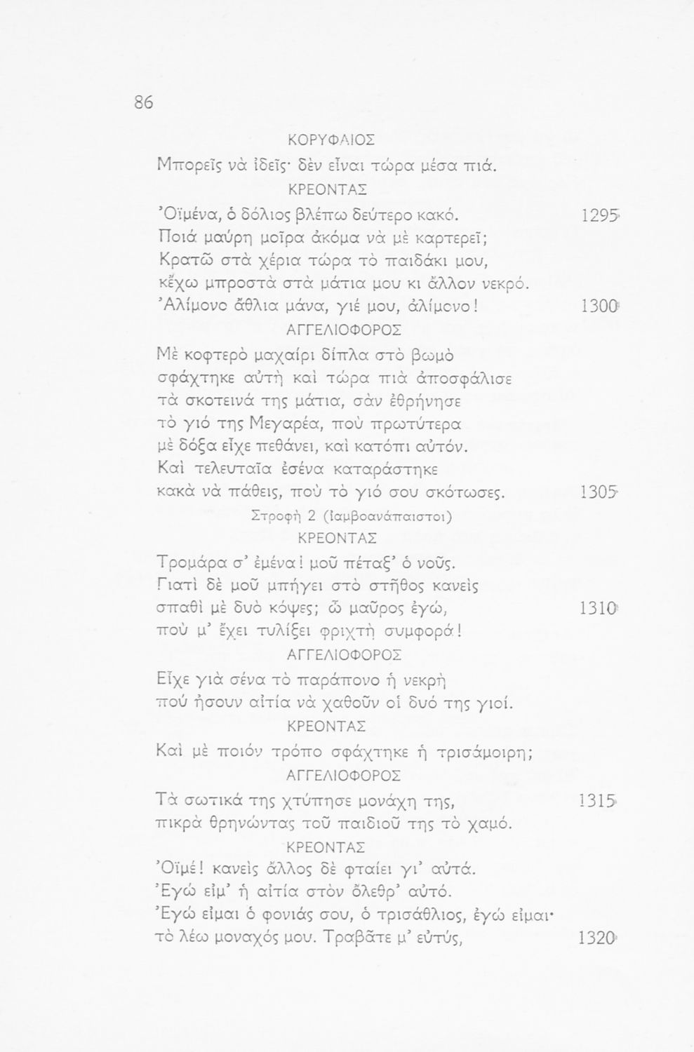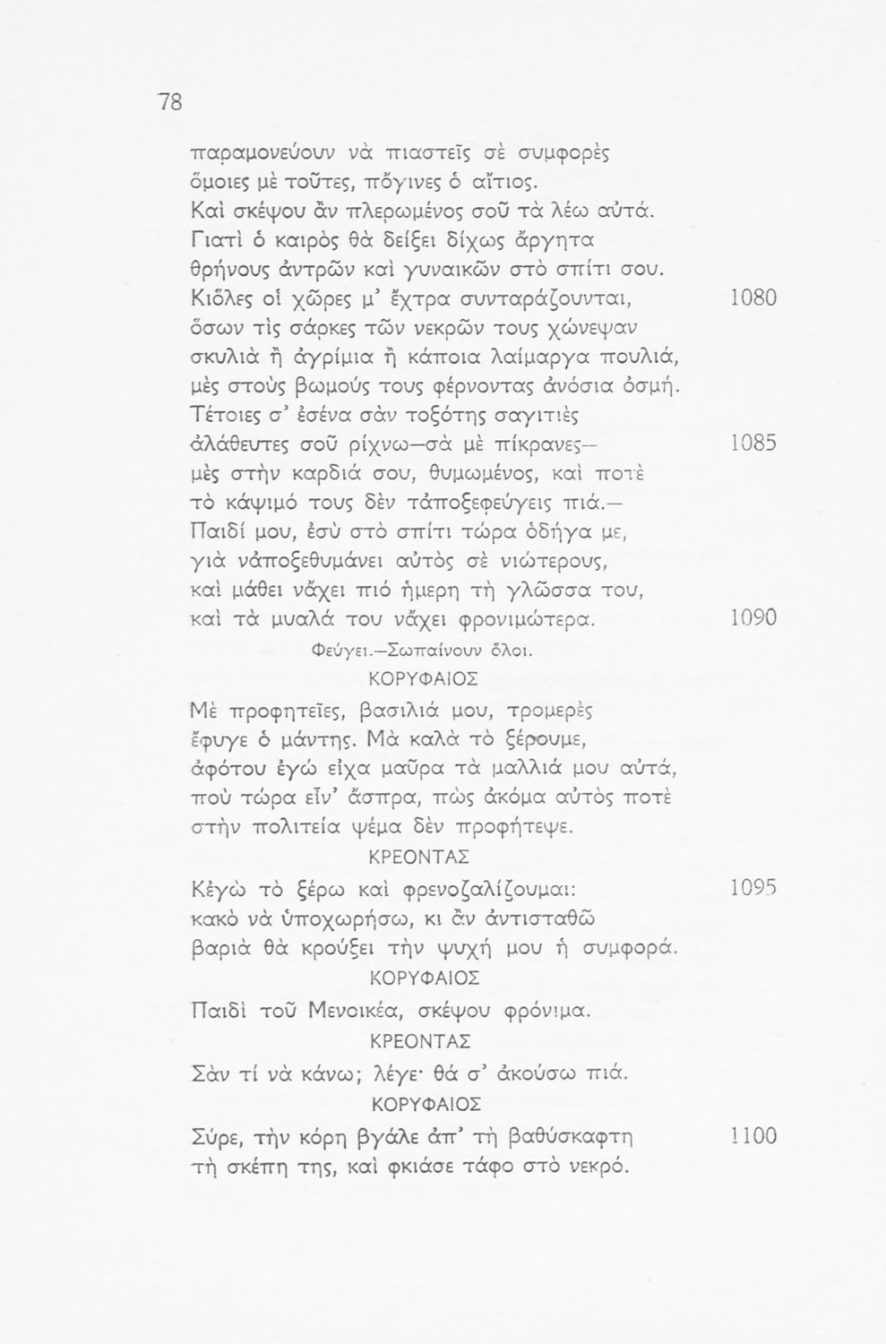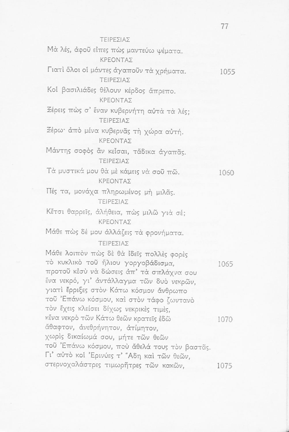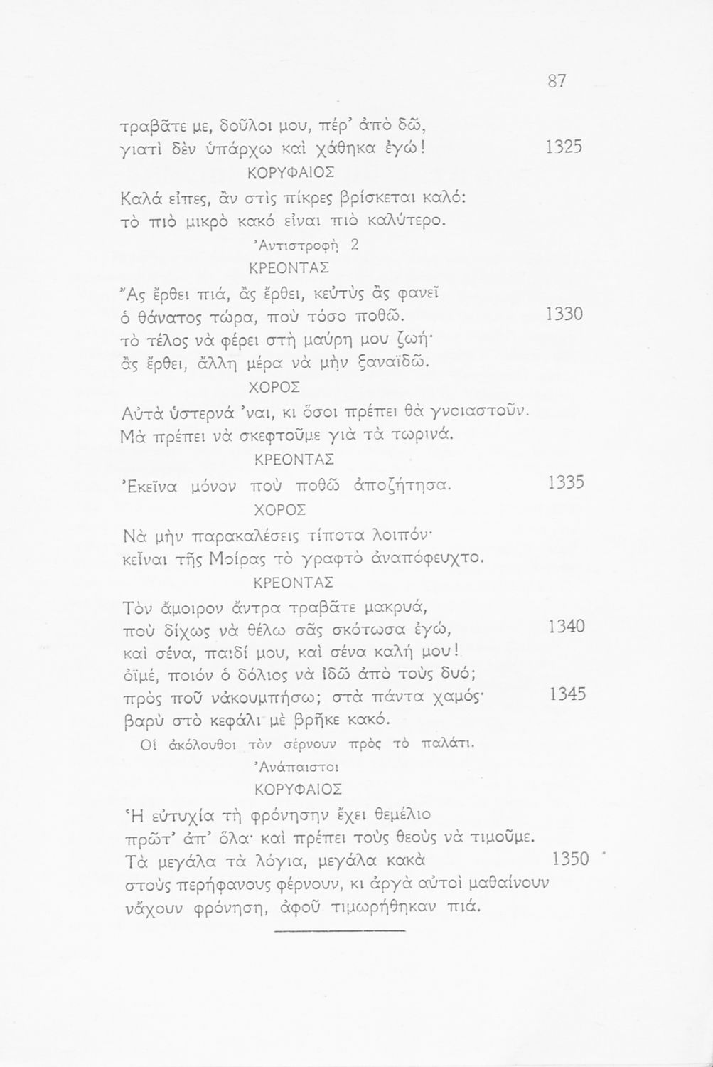 Μετάφραση της Αντιγόνης του Σοφοκλή στη δημοτική. Συνοδεύεται από ερμηνευτικές σημειώσεις.