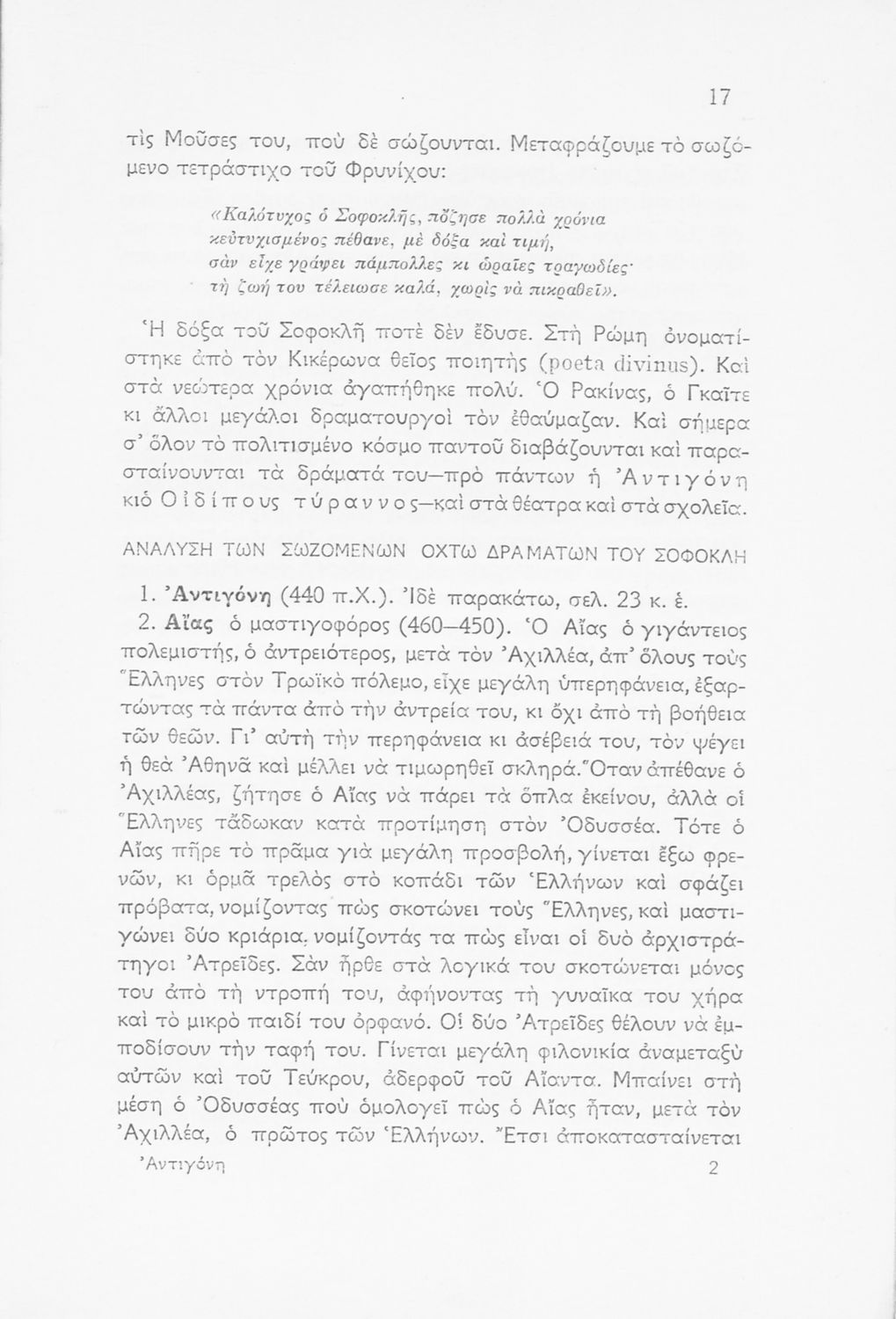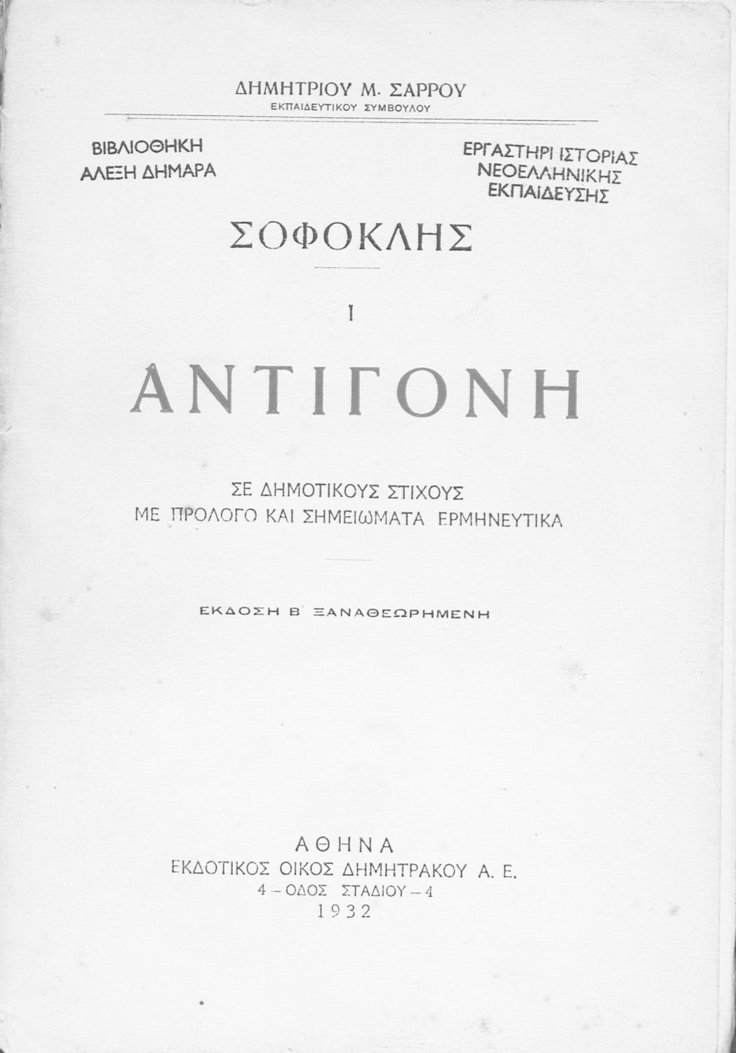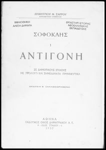 Παρουσίαση περιεχομένου: Μετάφραση της Αντιγόνης του Σοφοκλή στη δημοτική. Συνοδεύεται από ερμηνευτικές σημειώσεις.