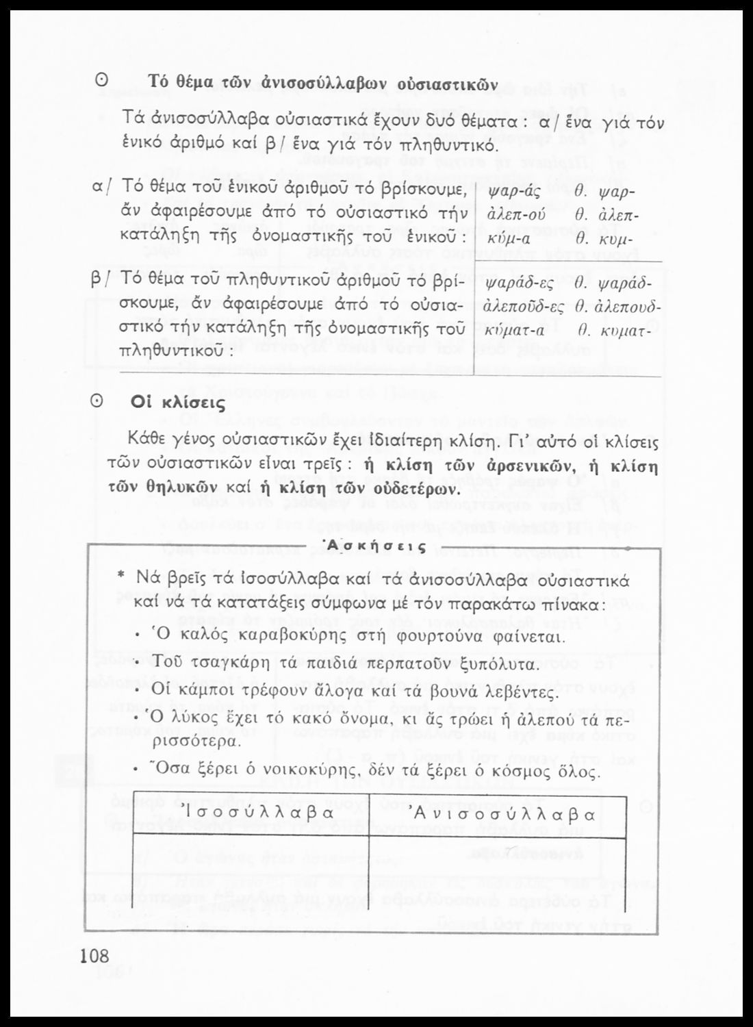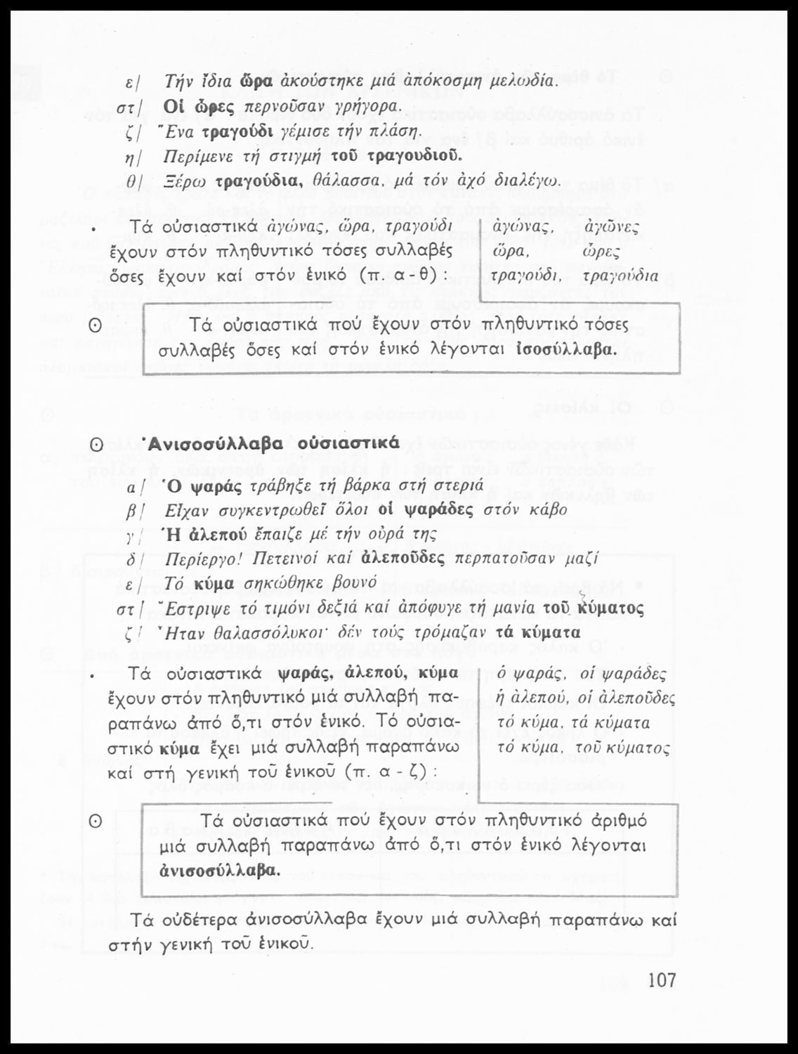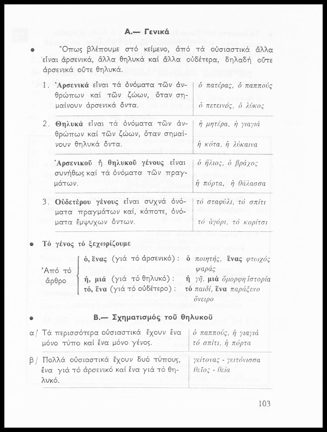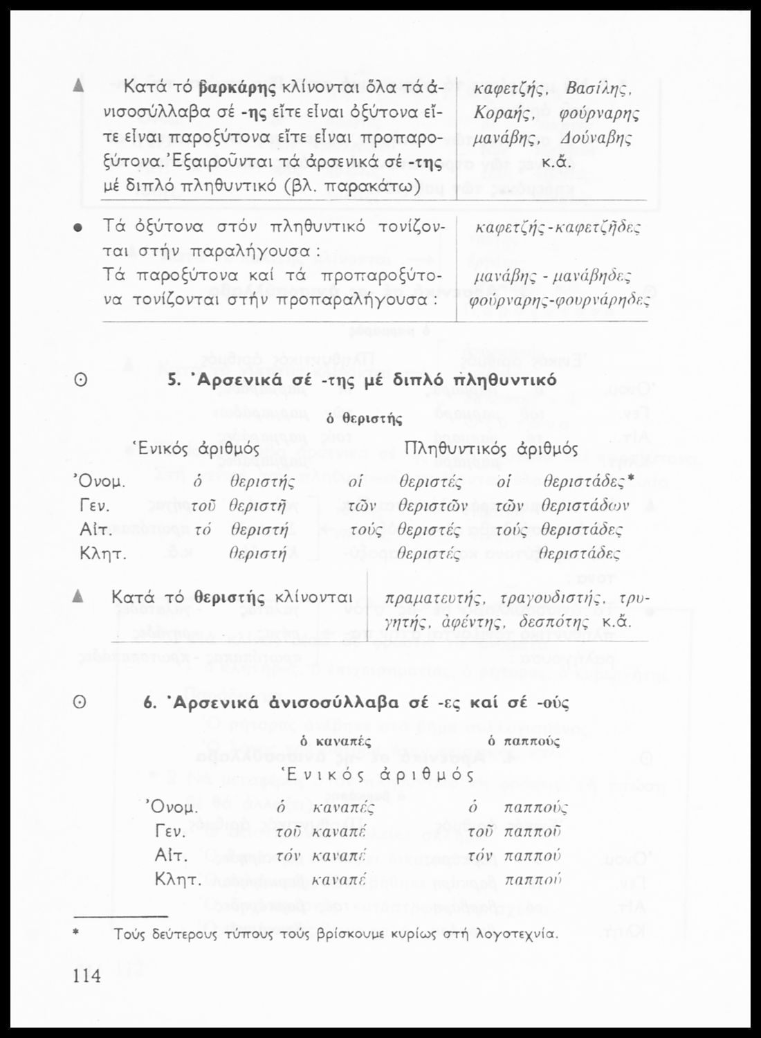 Σχολικό εγχειρίδιο της Ε΄ και ΣΤ΄ τάξης Δημοτικού για την γραμματική της ελληνικής γλώσσας με κανόνες και παραδείγματα. Στο επίμετρο υπάρχουν πίνακες με ανώμαλους σχηματισμούς ρημάτων.