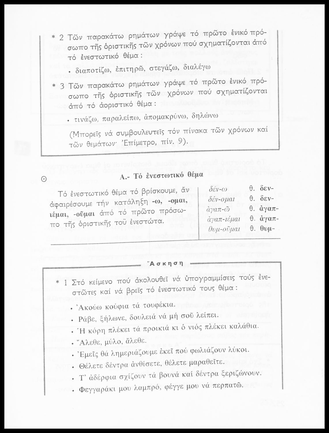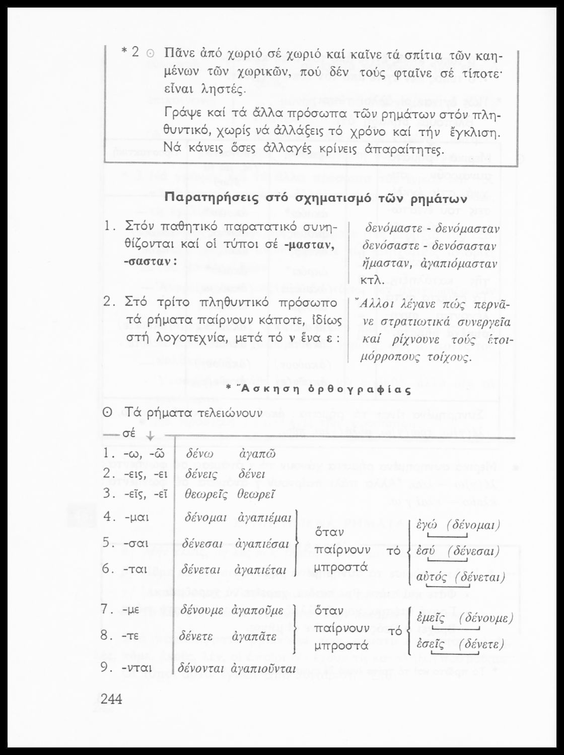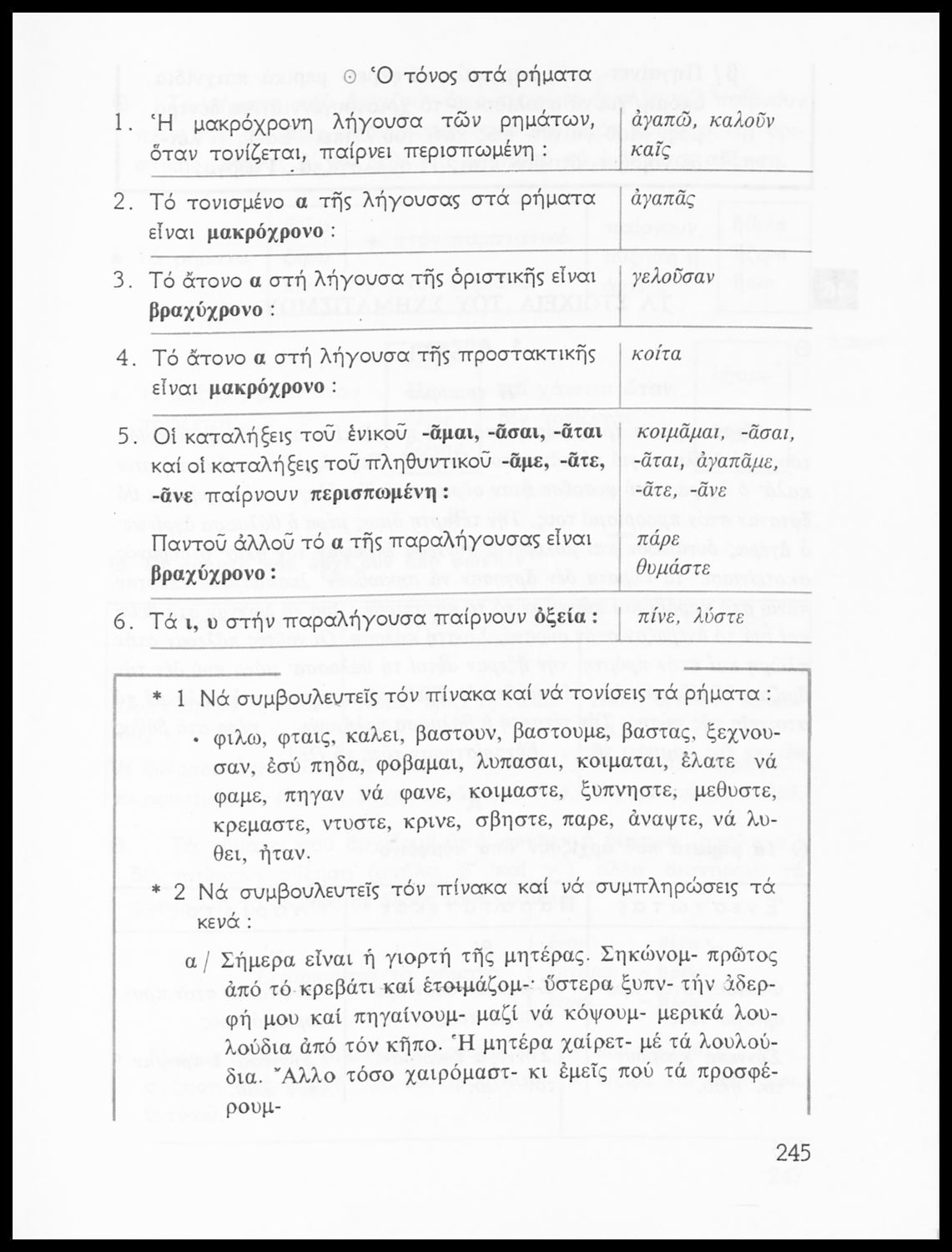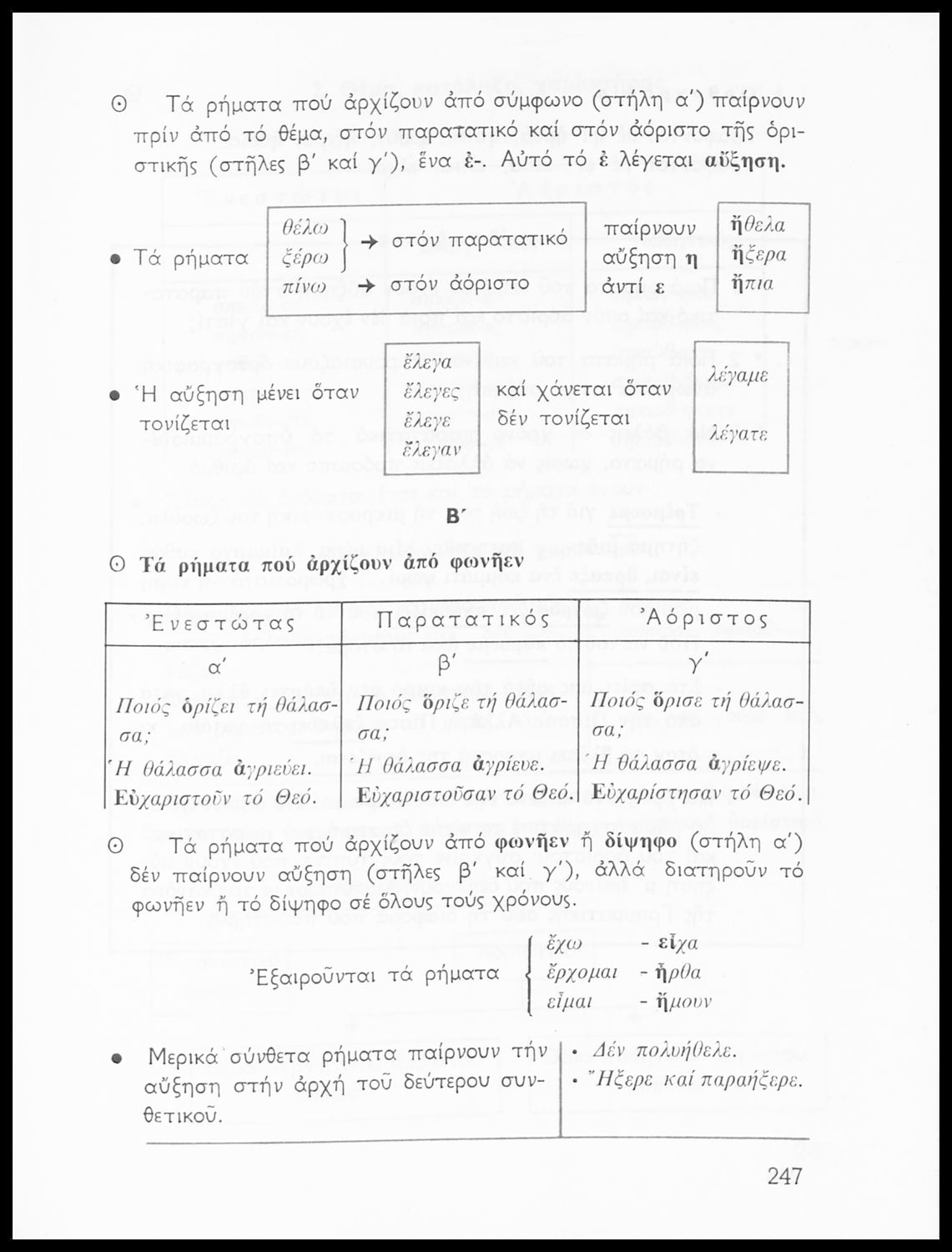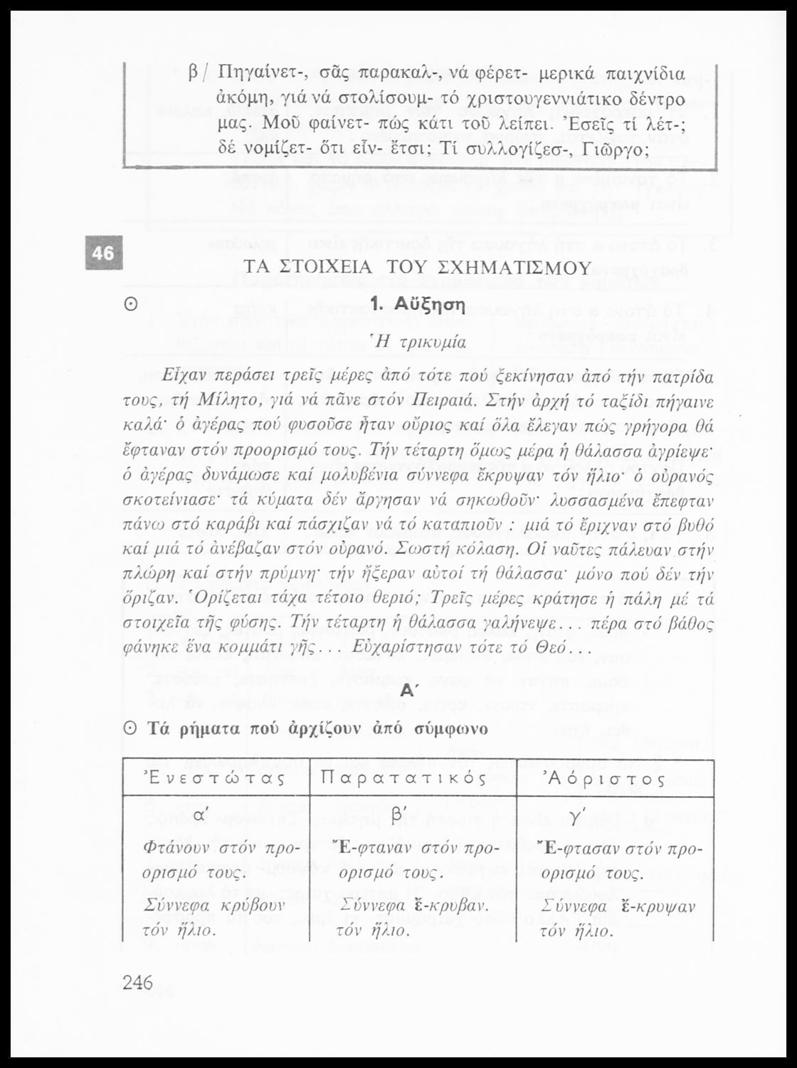 Σχολικό εγχειρίδιο της Ε΄ και ΣΤ΄ τάξης Δημοτικού για την γραμματική της ελληνικής γλώσσας με κανόνες και παραδείγματα. Στο επίμετρο υπάρχουν πίνακες με ανώμαλους σχηματισμούς ρημάτων.